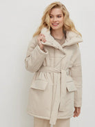 Crafted from soft, durable fabric with a plush insulated interior, it provides exceptional warmth without the bulk. The standout high-collar design offers chic coverage against chilly winds, while the removable waist belt cinches the figure for a flattering, feminine fit. Oversized flap pockets add a touch of functionality and contemporary edge, making this coat a must-have for versatile winter dressing.