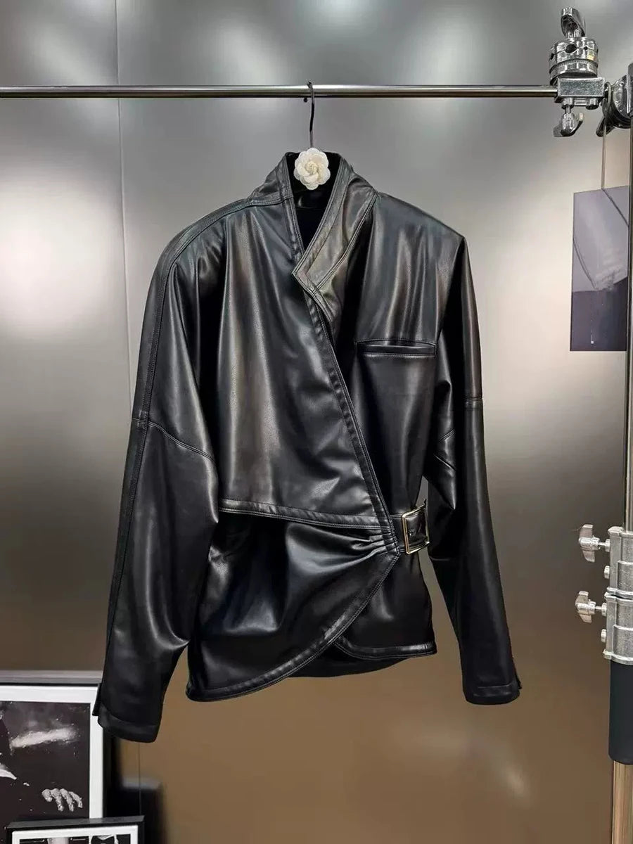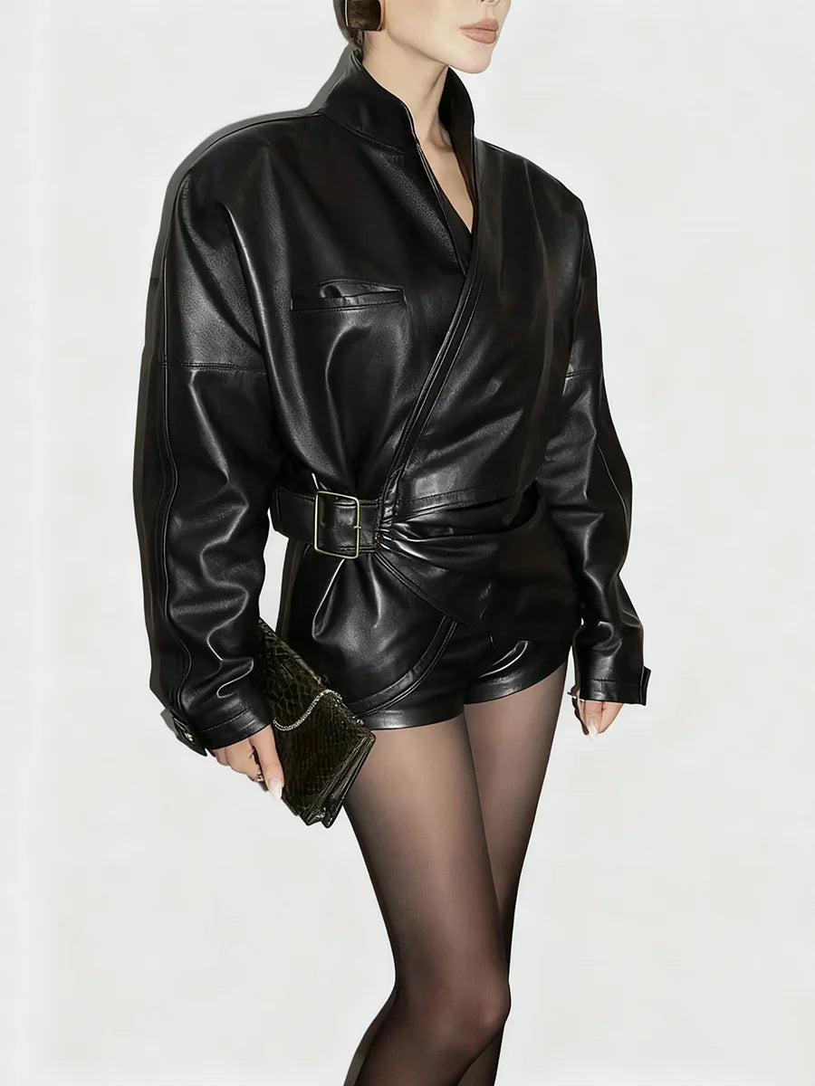 The Trend4us Luxe Asymmetric Belted Faux Leather Jacket embodies modern edge with a sculptural silhouette. Crafted from premium faux leather, this jacket features an innovative wrap-style front with an adjustable belt that cinches the waist for a tailored, confident look. The high stand collar and structured shoulders add a bold architectural touch, while the smooth finish enhances its sleek, contemporary appeal. Perfect for layering over mini skirts, shorts, or tailored pants, this design transitions effortlessly from day to night.