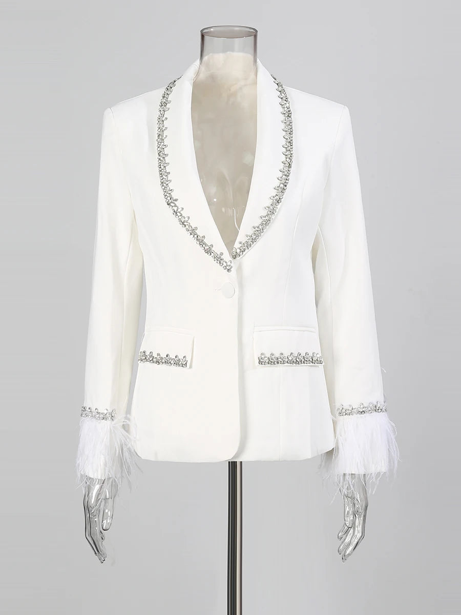 The design is elevated with feather-trimmed cuffs, adding a luxurious, playful touch that contrasts with its structured silhouette. Whether styled over sleek trousers for modern suiting or paired with a mini skirt for a chic party look, this blazer embodies high-fashion elegance.