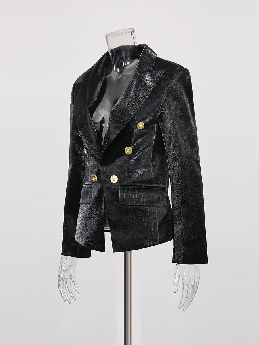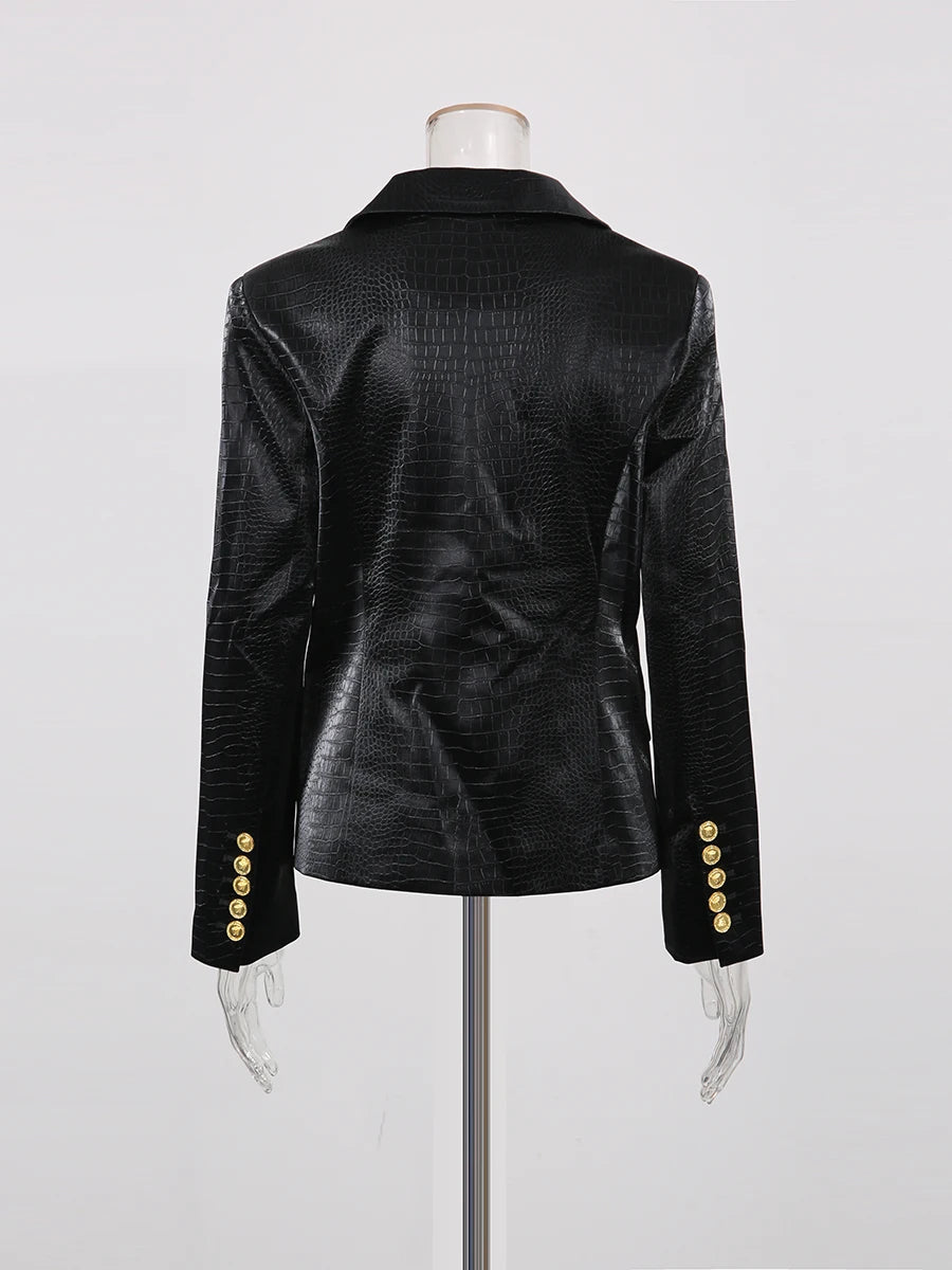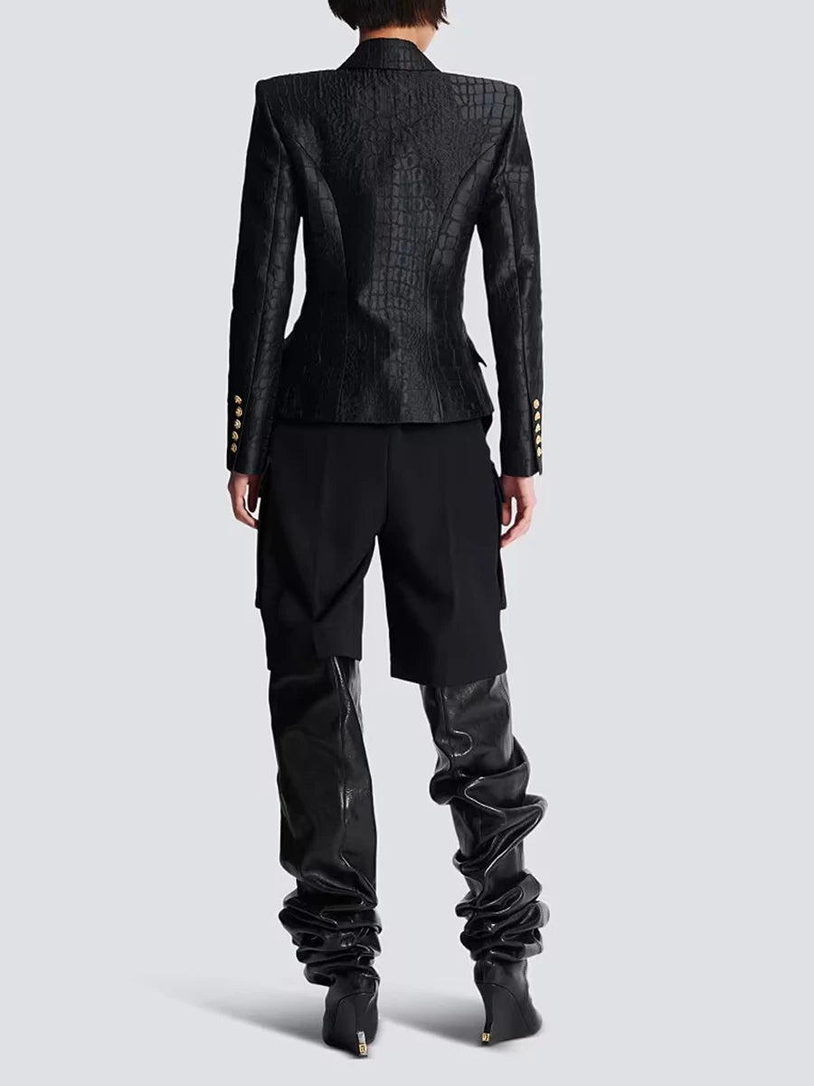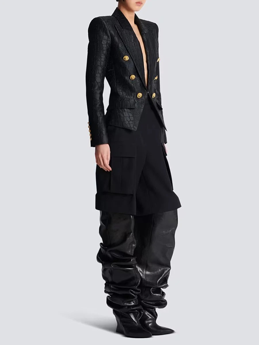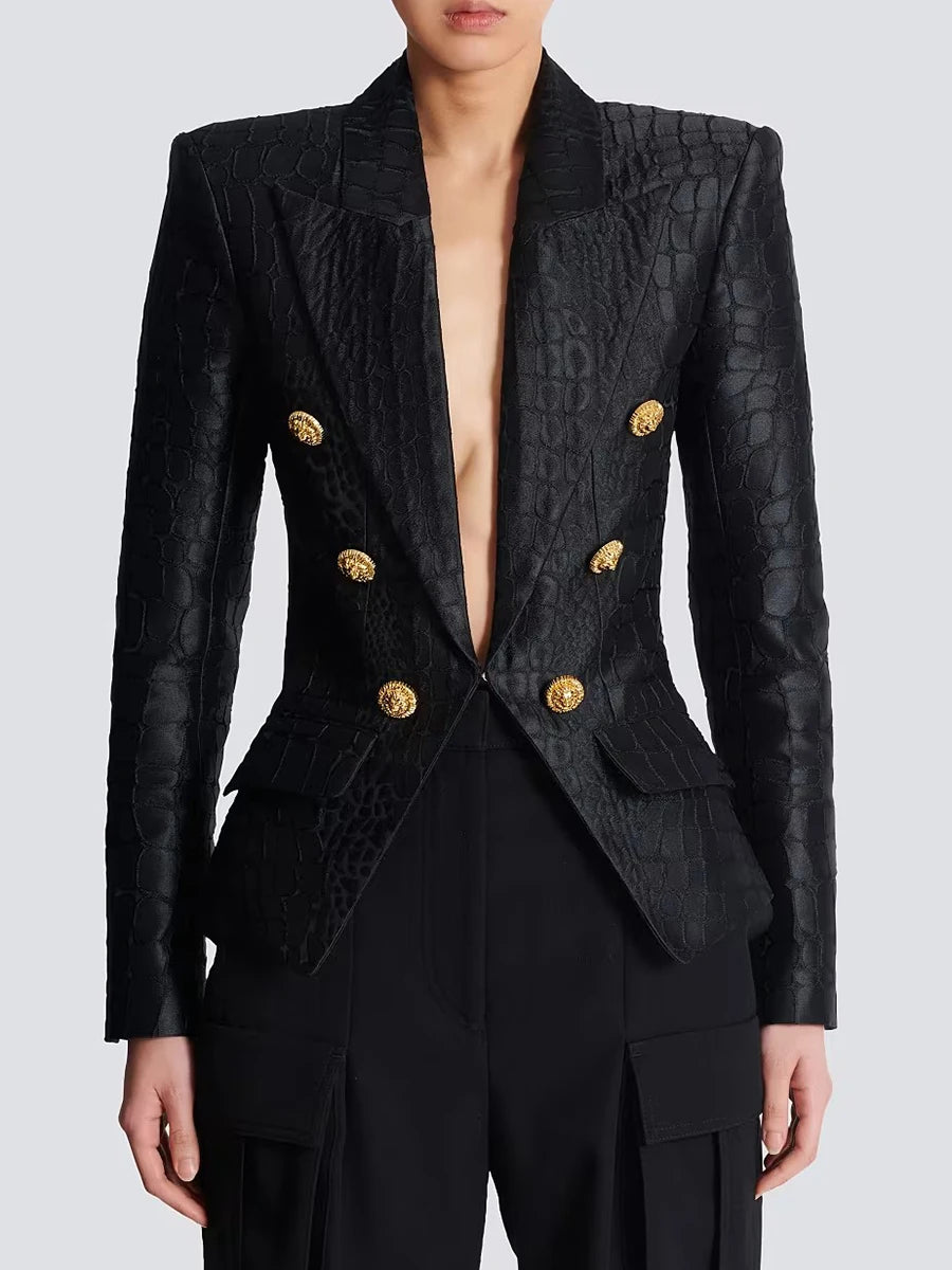 The Trend4us Luxe Modern Double-Breasted Blazer is a bold fusion of power and elegance. Crafted from a croc-embossed textured fabric, this blazer features a sharply tailored silhouette, structured shoulders, and a deep V-lapel. Accented with striking gold-tone double-breasted buttons, it’s designed to exude sophistication and modern edge. Perfect for business chic, cocktail styling, or evening glamour, this statement blazer elevates any wardrobe with a confident and polished look.