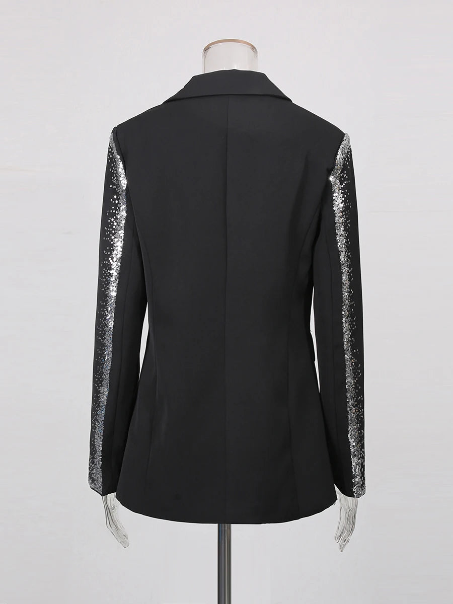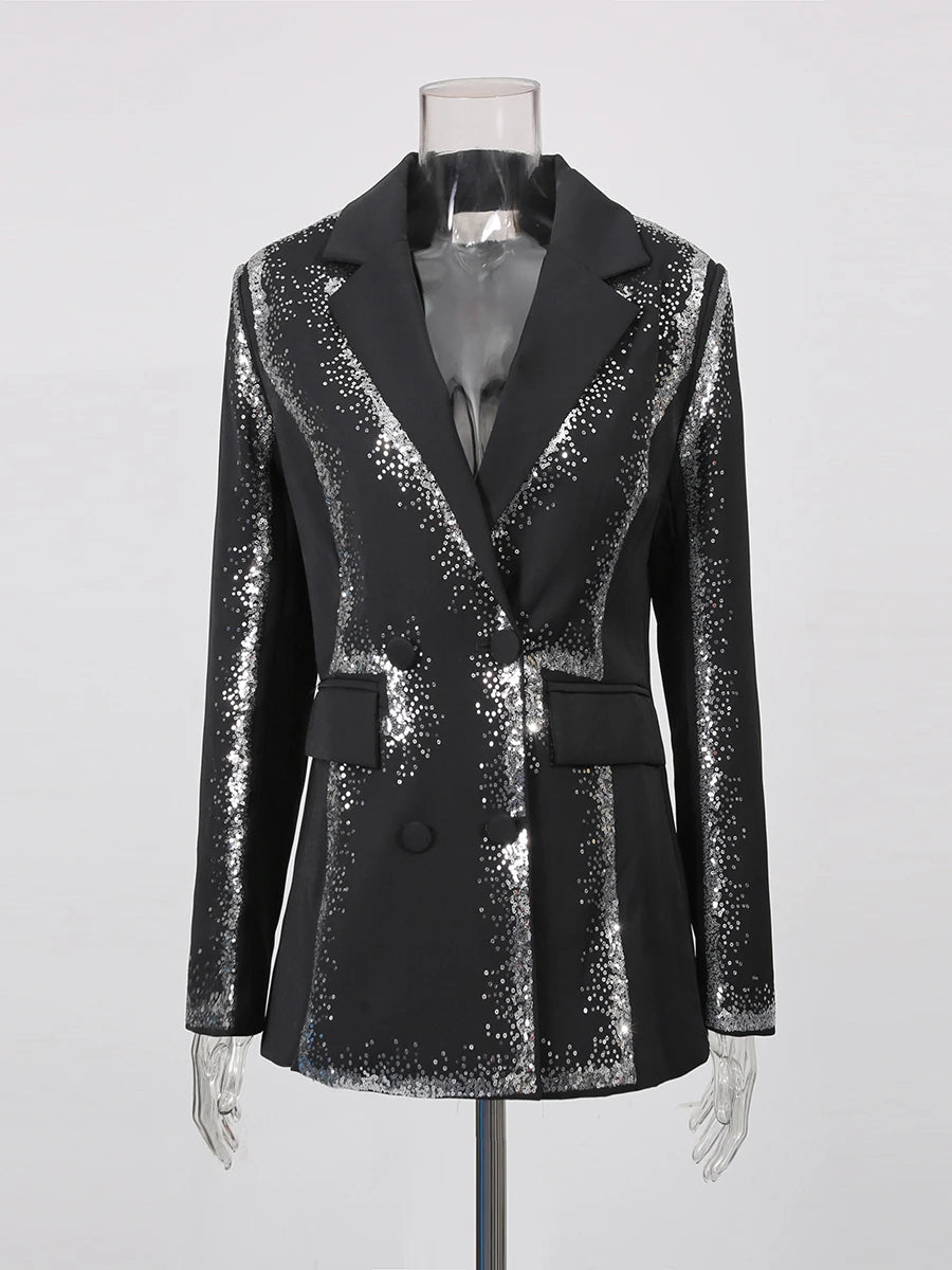 Elevate your evening wardrobe with the Trend4us Luxe Sequin-Trim Double-Breasted Blazer — a show-stopping piece that perfectly balances classic tailoring with modern glamour.