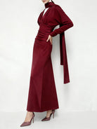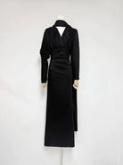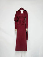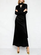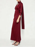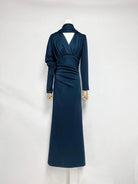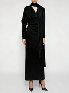 Elevate your evening wardrobe with this sophisticated draped satin gown. The luxurious satin fabric drapes elegantly across the silhouette, creating fluid movement and refined dimension. Long sleeves provide polished coverage while maintaining an upscale aesthetic, making this piece ideal for formal events, galas, and special occasions. The expert draping technique flatters the figure while the premium satin finish catches light beautifully. A timeless investment piece that transitions seamlessly from black-tie affairs to destination celebrations.