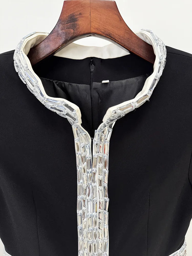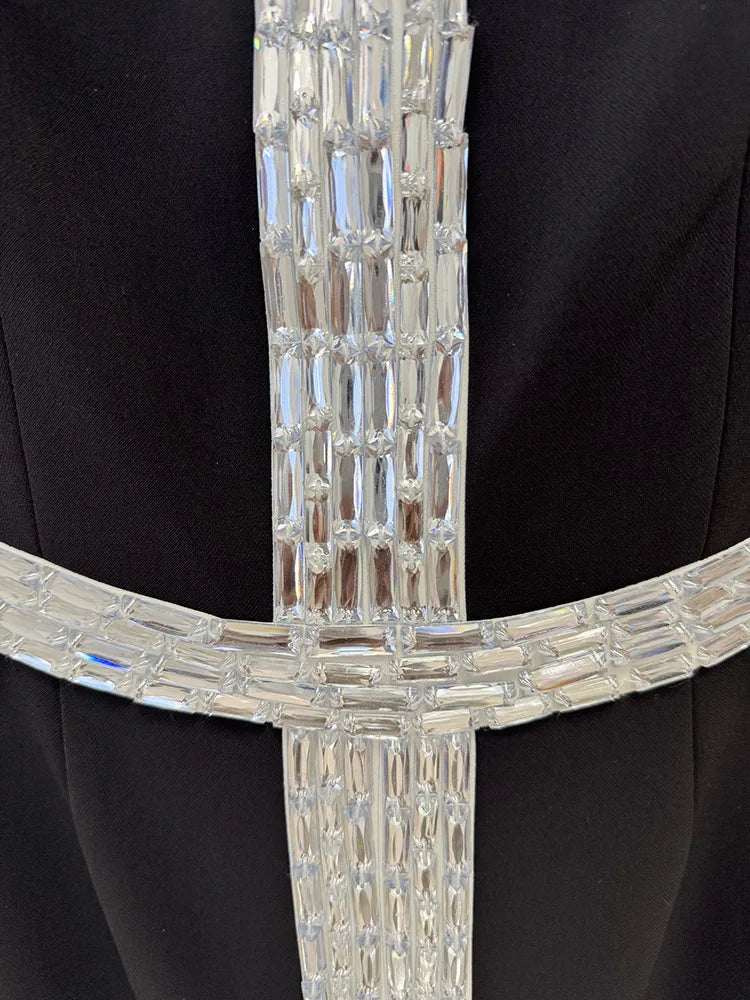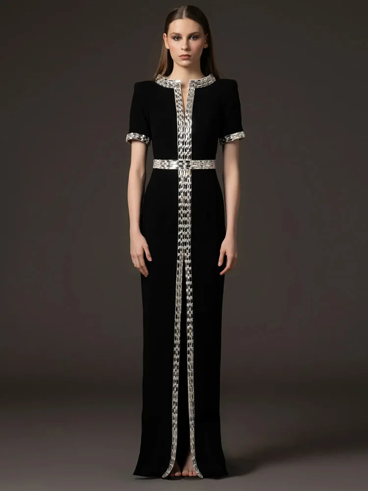 Command attention with timeless sophistication in the Trend4us Luxe Beaded Short Sleeve Gown. This full-length black gown features an elegant, figure-enhancing silhouette, highlighted by intricate silver beaded trim along the neckline, front panel, waist, sleeve cuffs, and hem. The short-sleeve design and structured shoulders add a modern edge to the classic evening style.