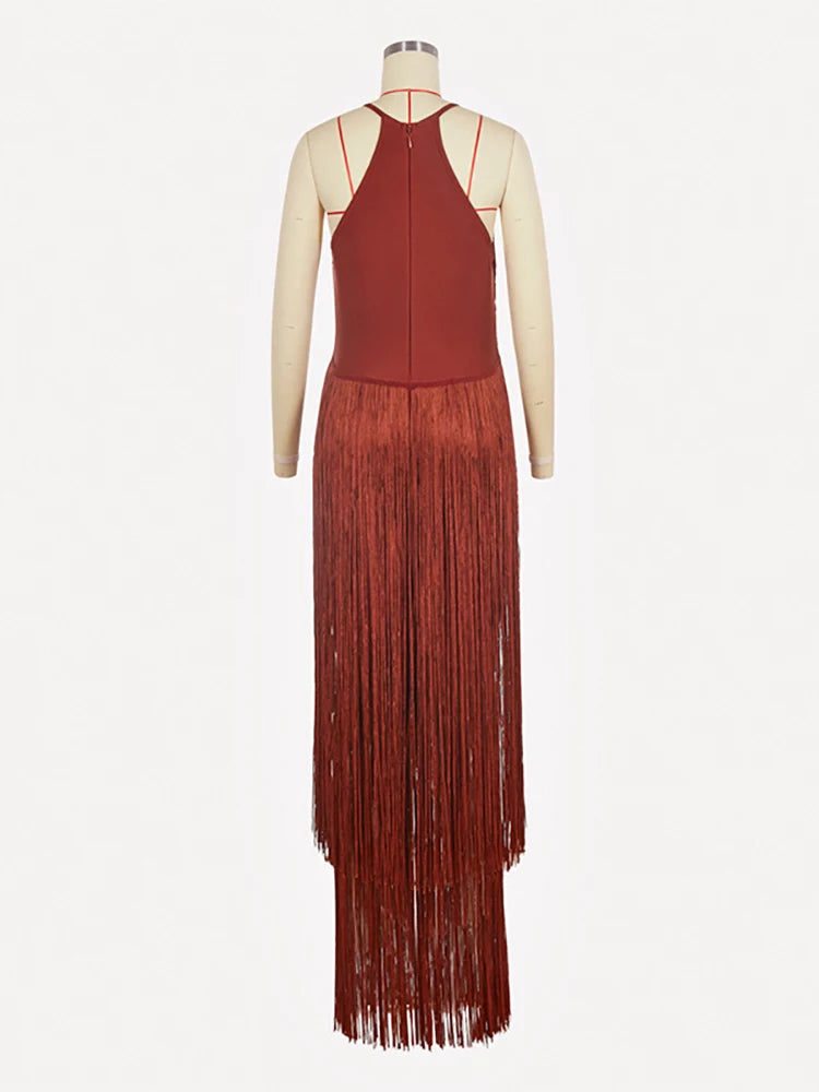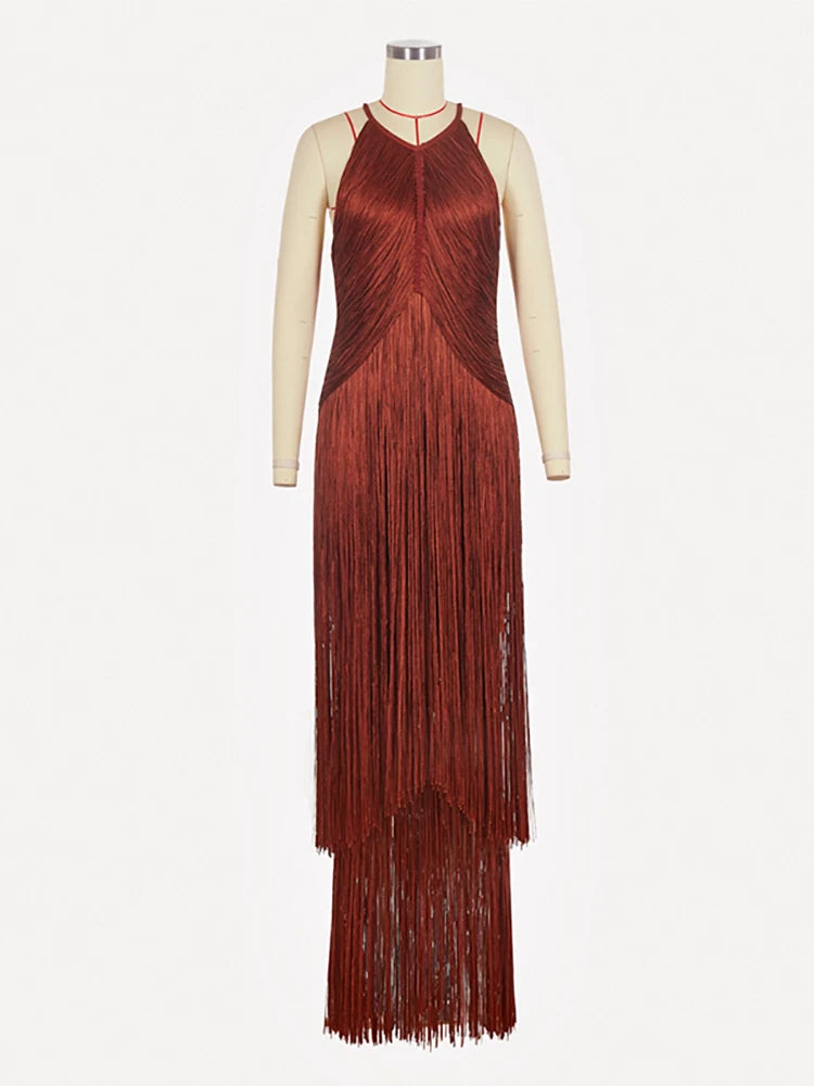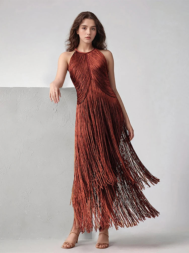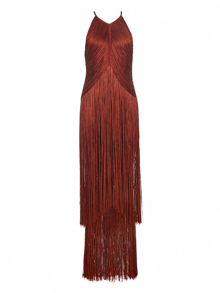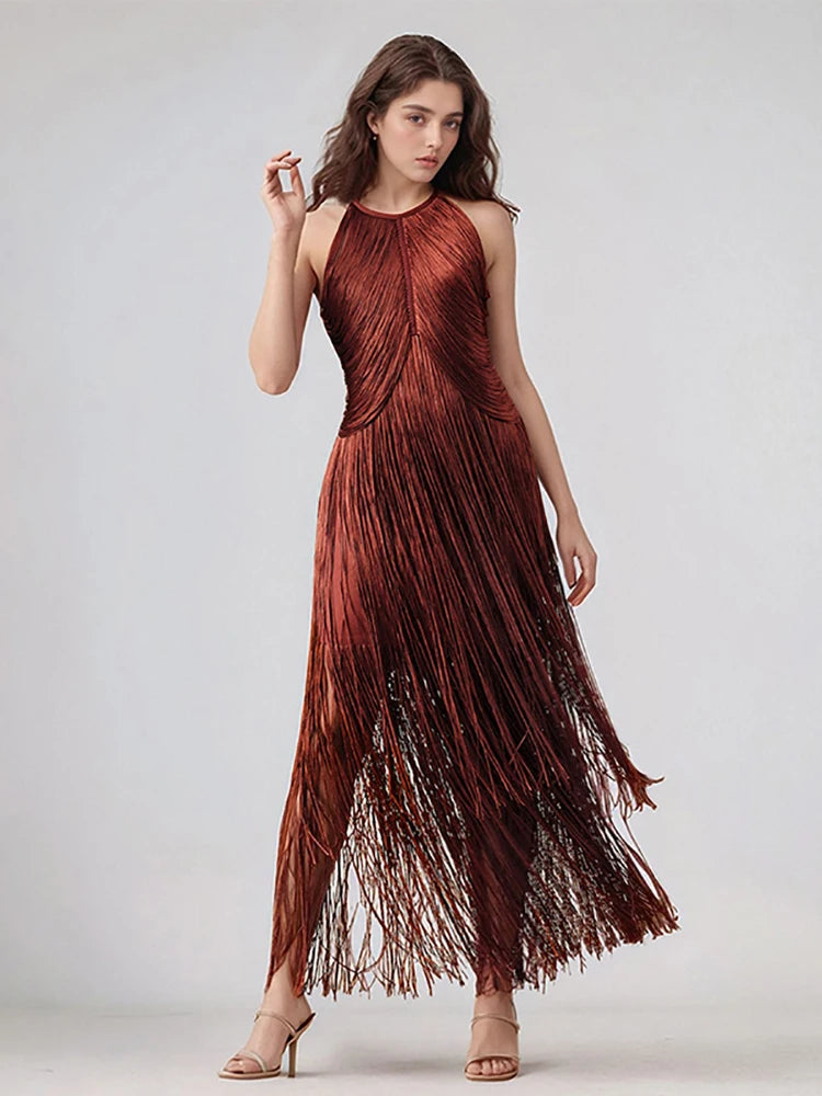 Crafted in a rich, metallic rust tone, the dress combines vintage-inspired glam with modern edge. The high neckline elongates the silhouette, while the figure-skimming fit and flowing fringe overlay add a sense of playful sophistication. Ideal for gala nights, upscale soirées, and red-carpet-worthy events, this dress ensures you’ll be the center of attention.