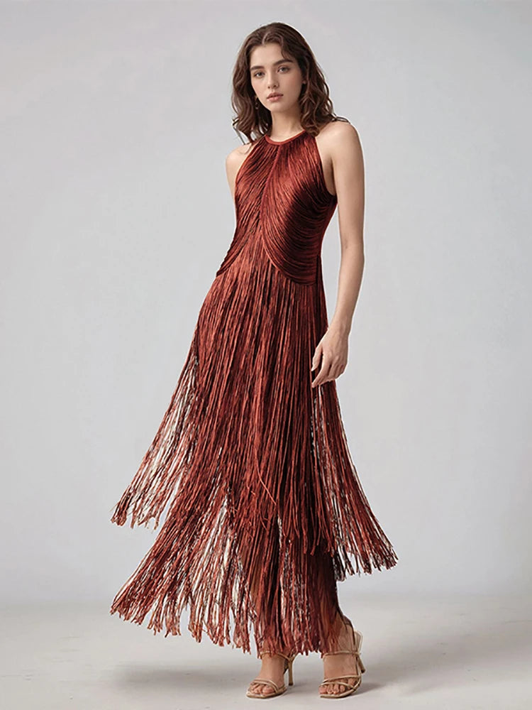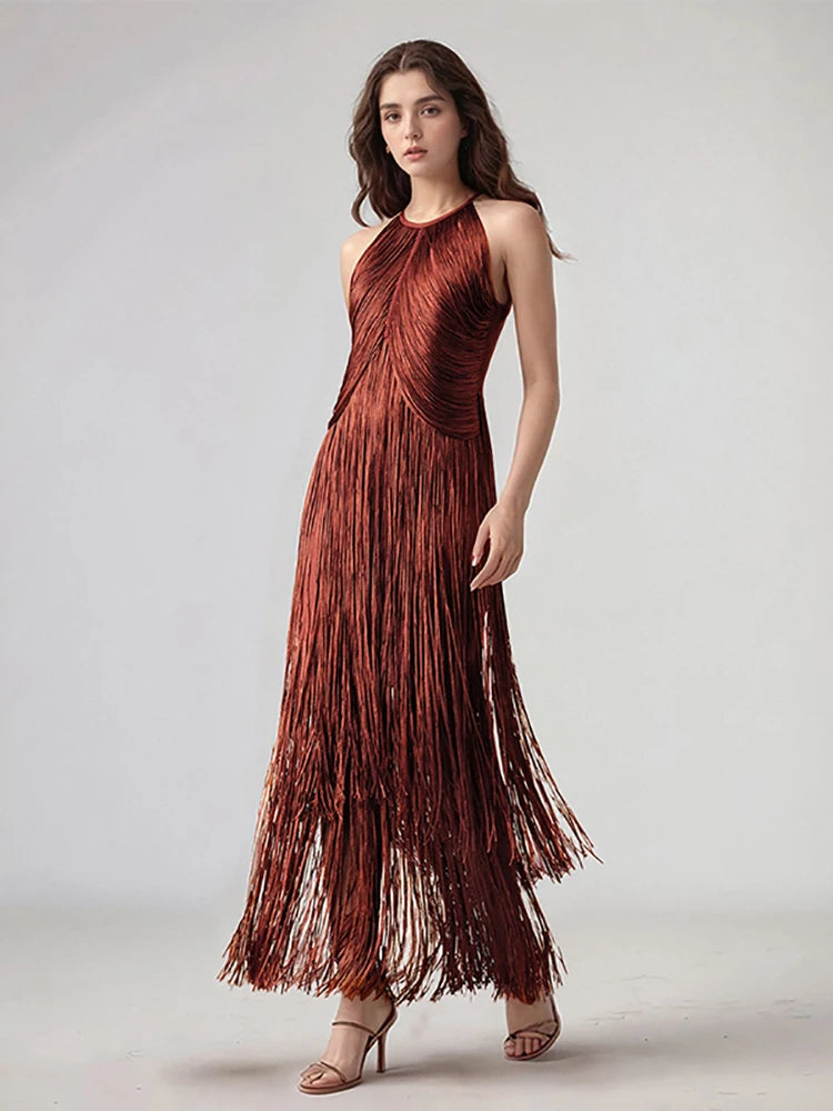 Make a statement in motion with the Trend4us Luxe Fringe Halter Pleated Maxi Dress—a show-stopping piece designed for elegance and drama. This floor-grazing dress features a sculpted halter neckline and a meticulously pleated bodice that transitions into flowing fringe panels, creating mesmerizing movement with every step.