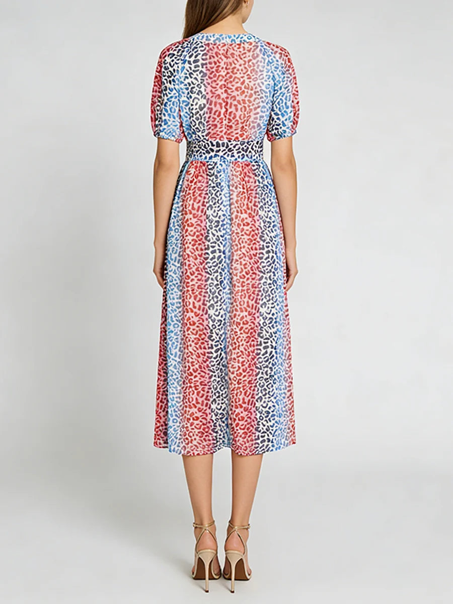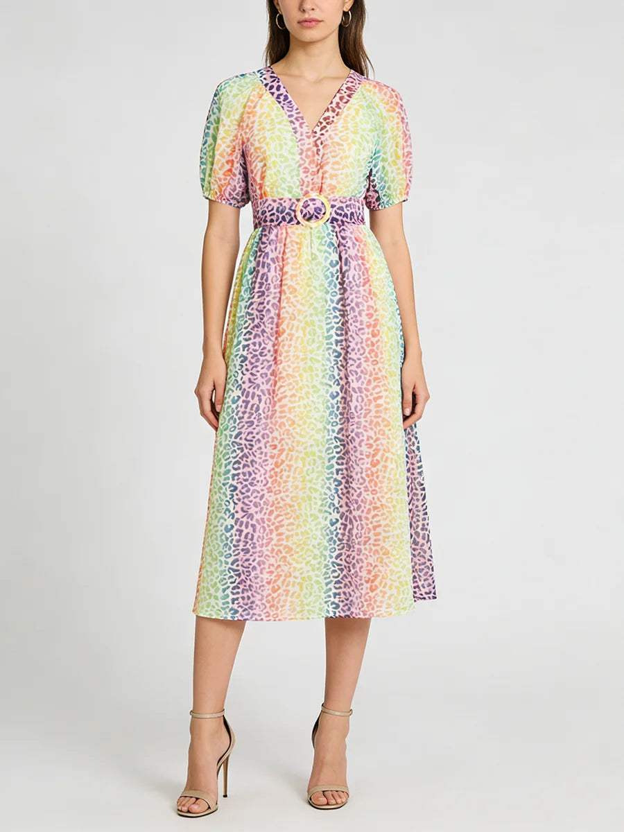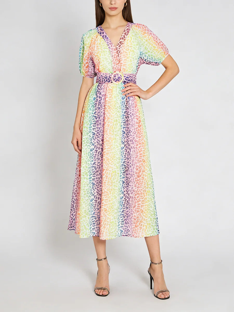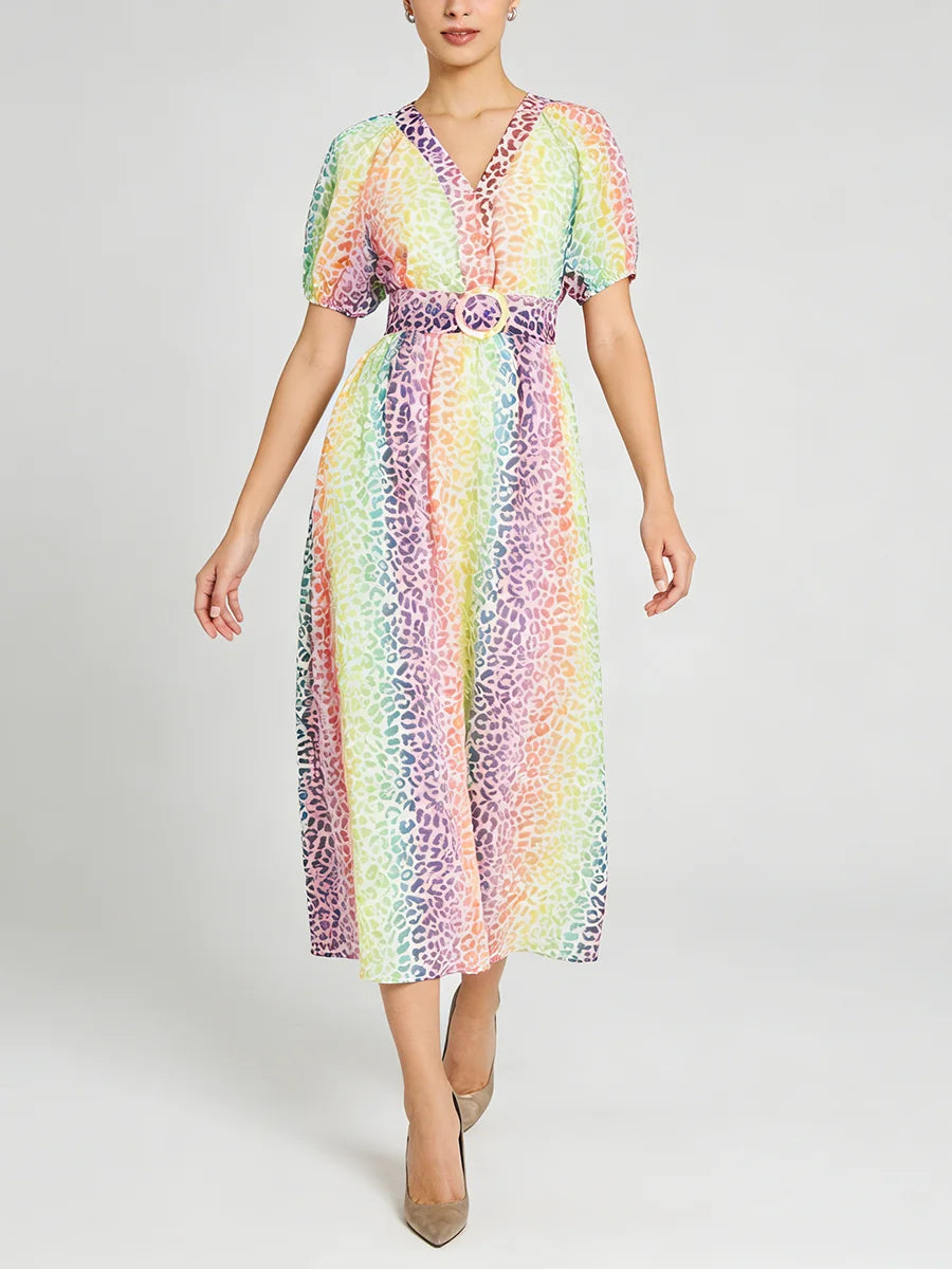 Make a statement with this stunning multicolor leopard print midi dress that combines wild sophistication with refined elegance. The vibrant leopard pattern and flattering V-neckline create a show-stopping piece that transitions seamlessly from daytime events to evening soirées.