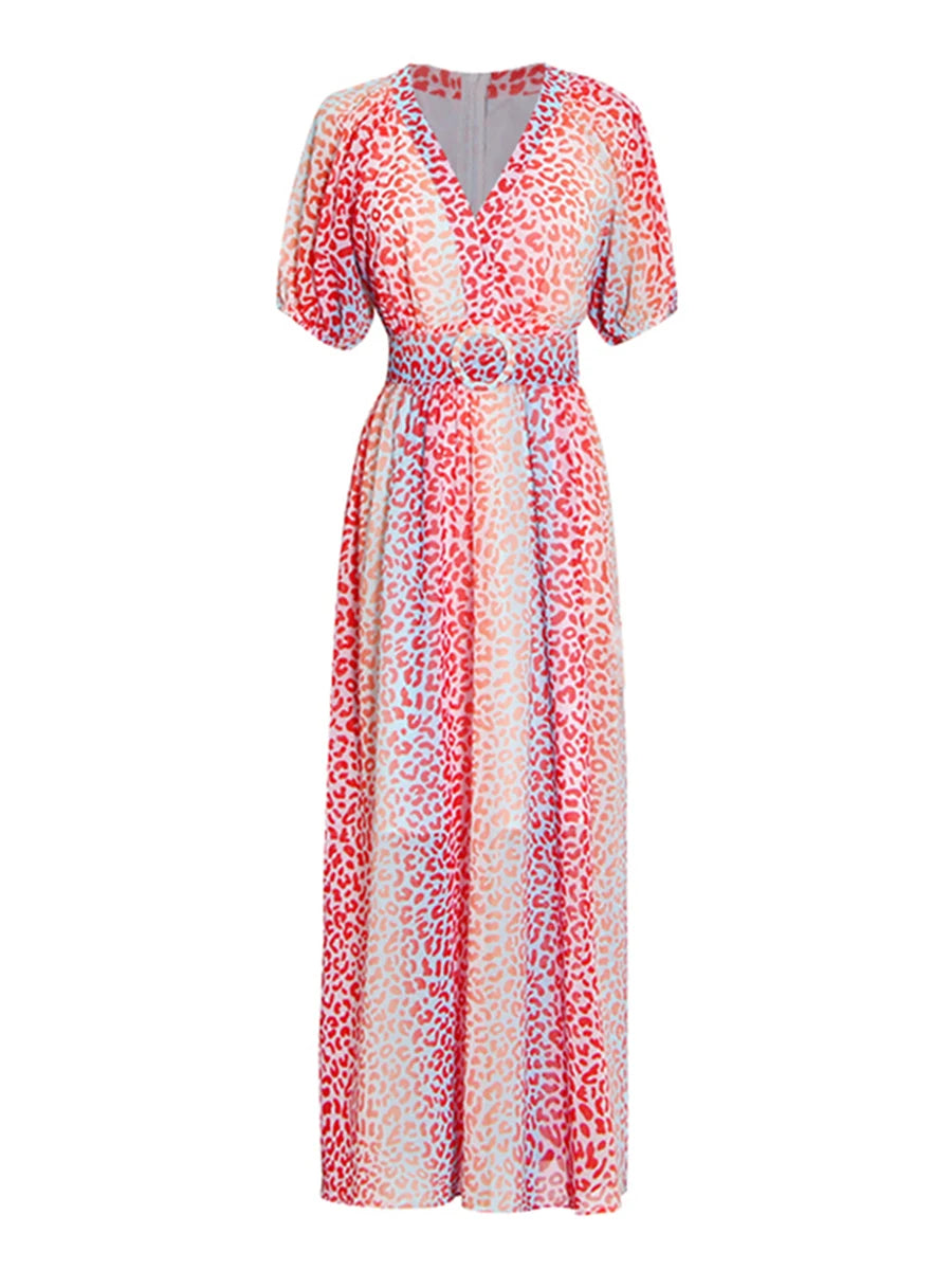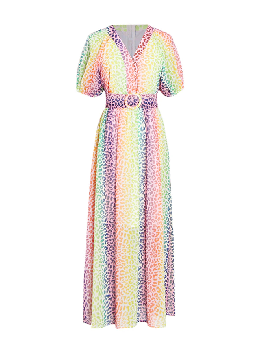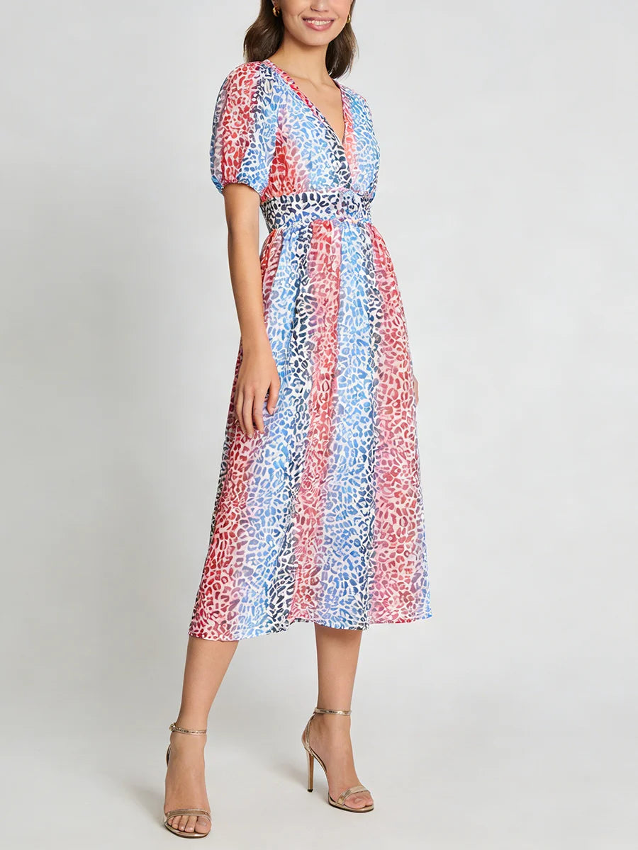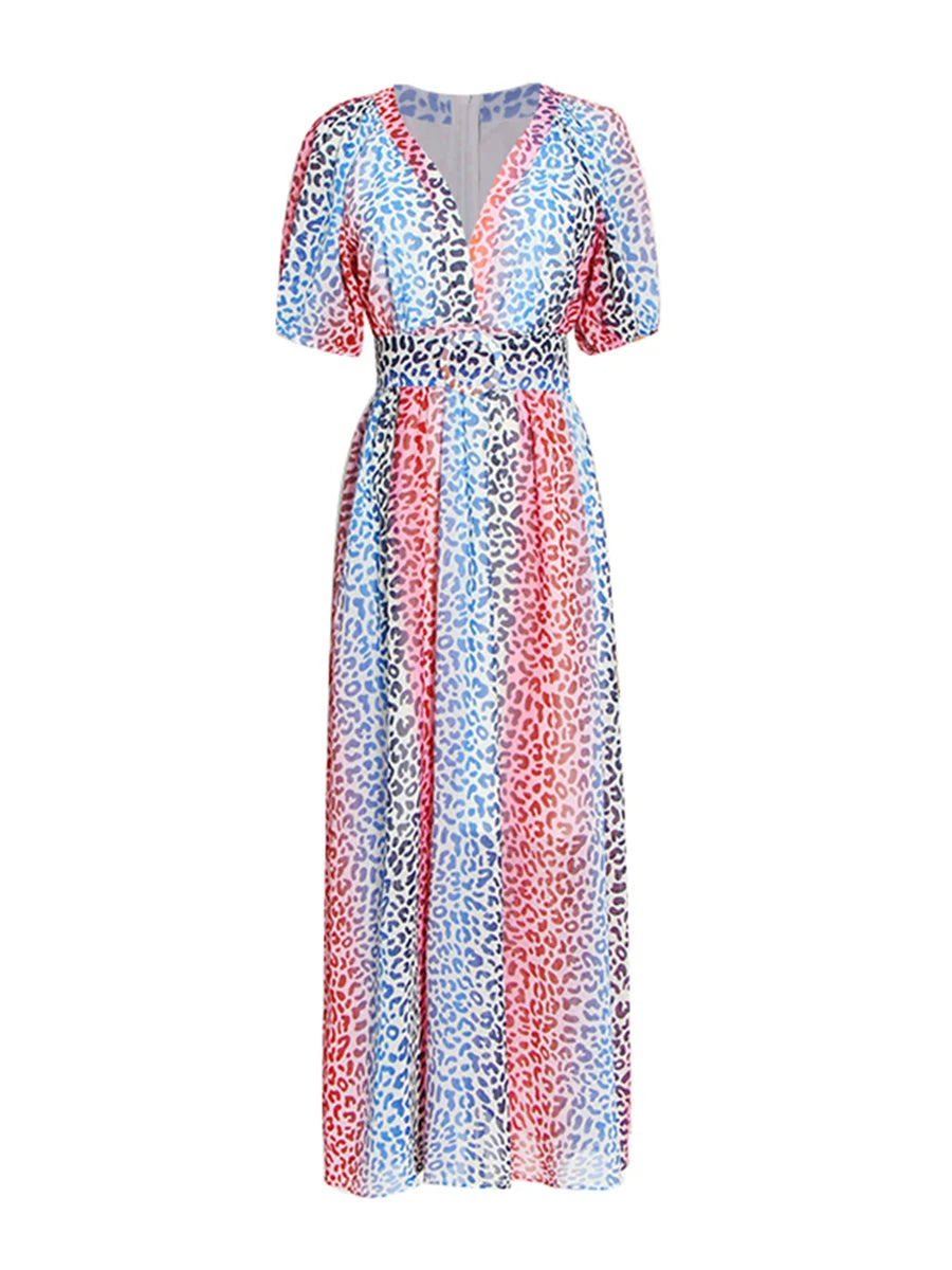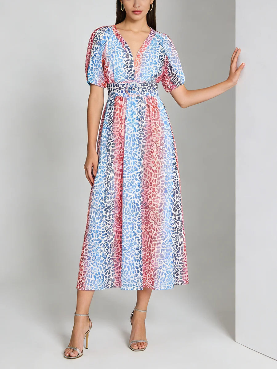 Make a statement with this stunning multicolor leopard print midi dress that combines wild sophistication with refined elegance. The vibrant leopard pattern and flattering V-neckline create a show-stopping piece that transitions seamlessly from daytime events to evening soirées.