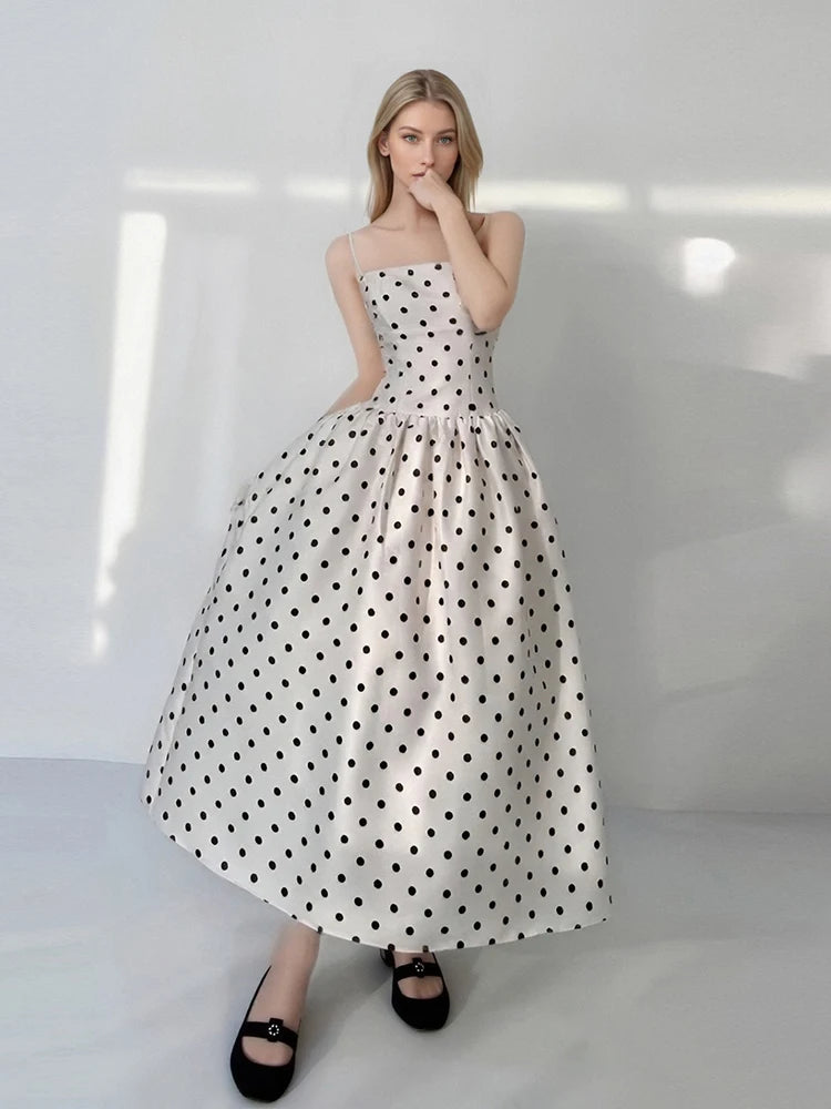 Channel timeless elegance with the Trend4us Vintage Polka Dot Midi Dress. This classic A-line silhouette features a flattering fitted bodice, adjustable slim straps, and a voluminous midi-length skirt. The crisp white base with black polka dots offers a retro-chic charm perfect for garden parties, seaside strolls, or summer getaways.