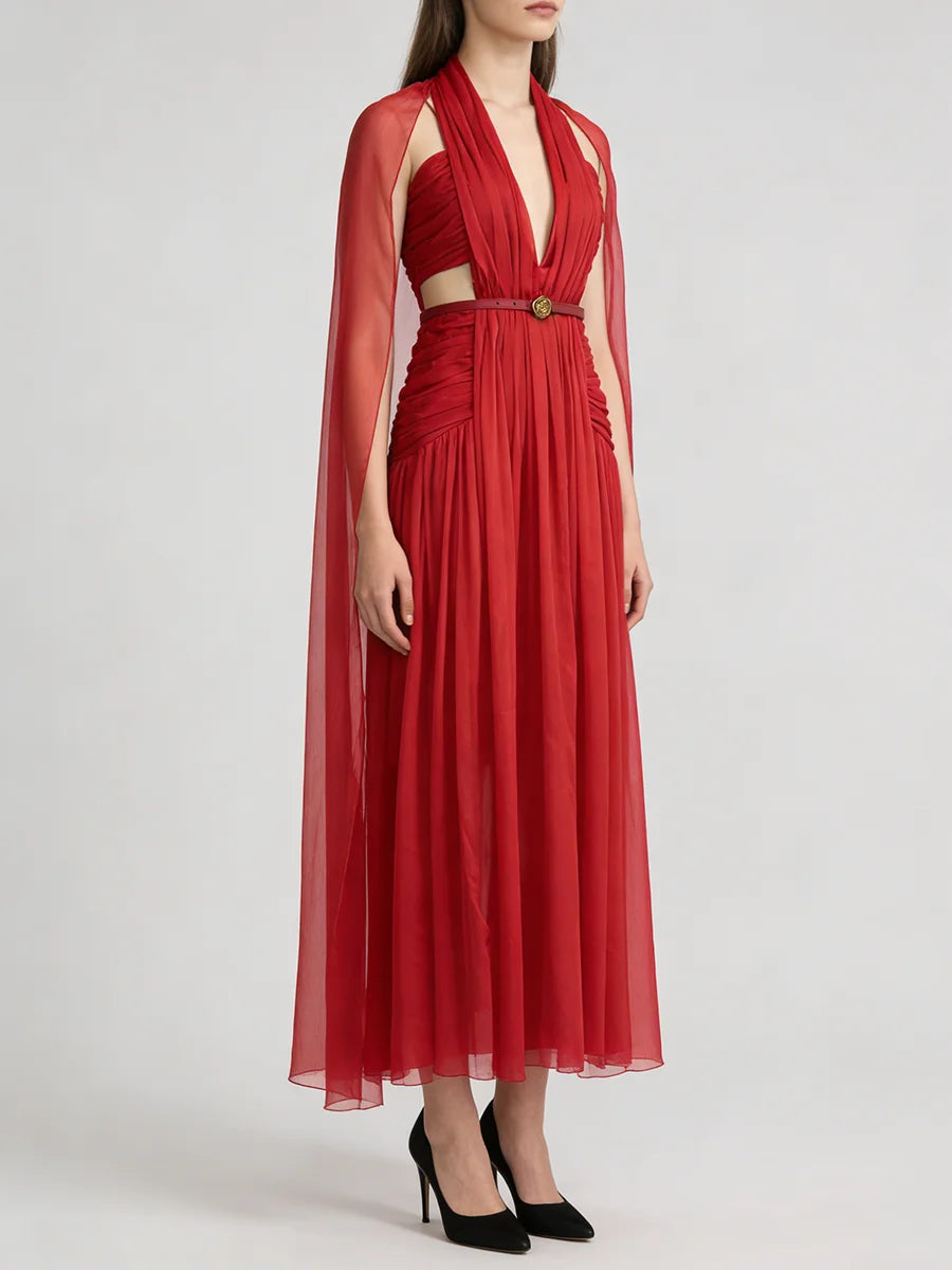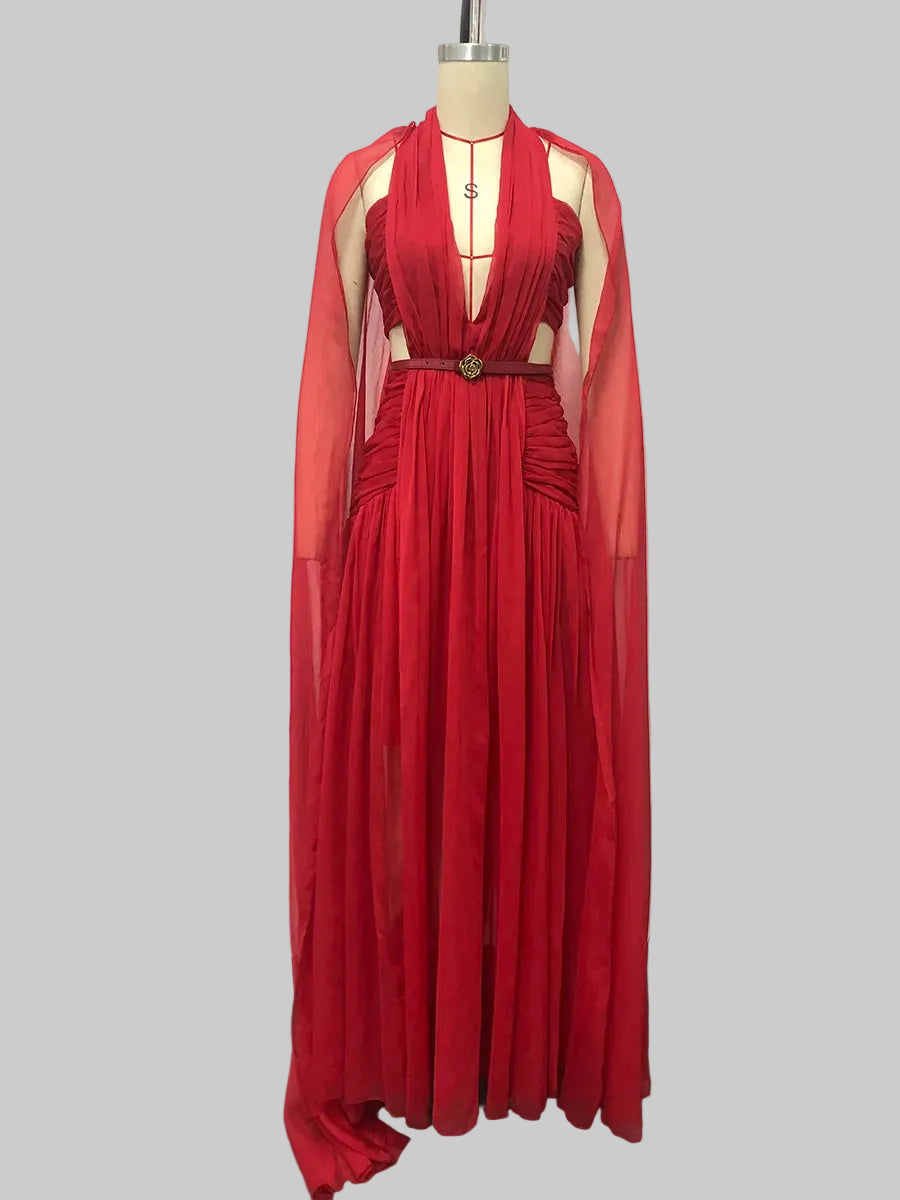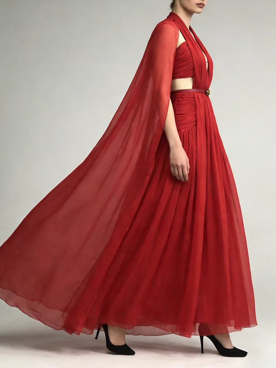 Trend4us Luxe Pleated Halter Cape Evening Gown