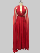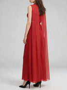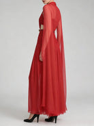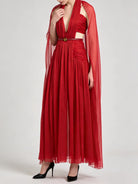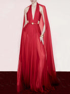 Designed for the woman who appreciates dramatic elegance, this stunning ankle-length gown features a sophisticated halter neckline paired with a flowing cape overlay that creates breathtaking movement with every step. The empire waistline elongates your silhouette, while intricate pleating adds texture and visual interest. Perfect for galas, black-tie weddings, or any formal occasion where you want to make a grand entrance.
