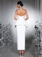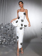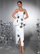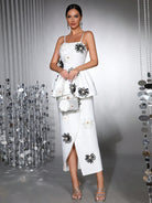 Radiate sophistication in the Trend4us Elegant 3D Floral Appliqué Peplum Dress, an exquisite fusion of structure, femininity, and artistic detail. This striking white ankle-length dress showcases dimensional black and white floral appliqués that bloom across a sculpted peplum silhouette. The slim-fit bodice enhances your curves, while the asymmetric wrap hem adds graceful movement. Designed for modern women who embody confidence and refinement, this couture-inspired piece is perfect for galas, red-carpet events, or elegant celebrations.