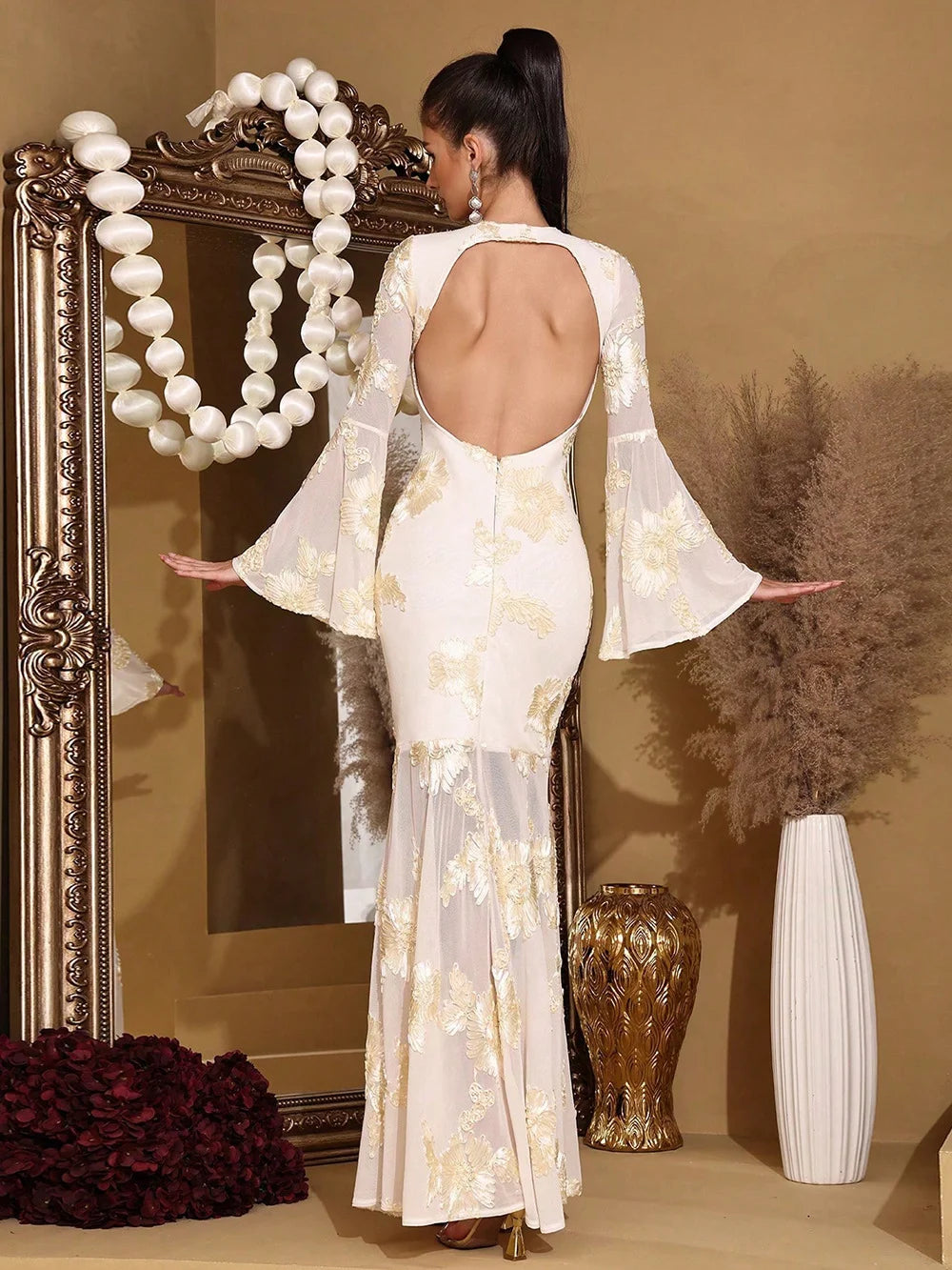 Trend4us Embroidered Gold Floral Backless Maxi Dress