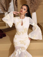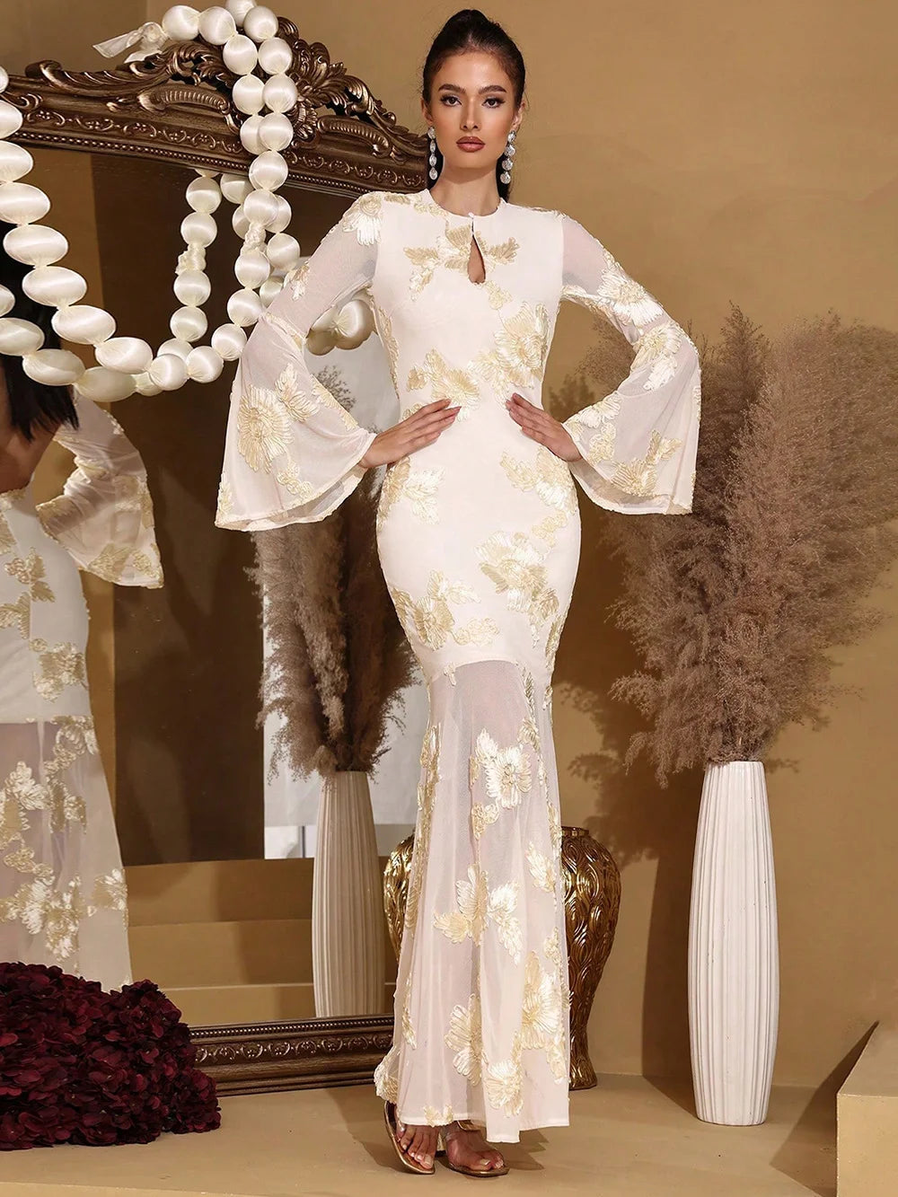 The design highlights a graceful keyhole neckline, flared bell sleeves, and a beautifully sculpted silhouette that flows into a soft mermaid hem. The sheer embroidered panels add subtle allure while maintaining an elevated, refined look.