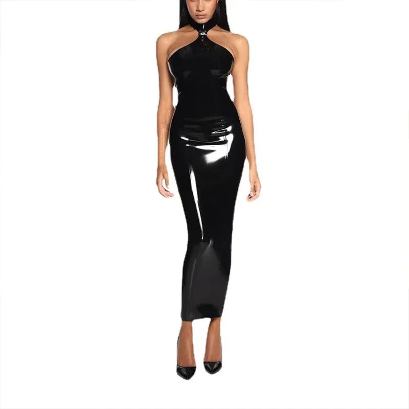 Trend4us Halter Glossy Patent Leather Maxi Dress