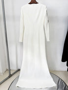 Designed in a smooth, structured luxury fabric, the gown sculpts the body with a sleek straight-line fit that subtly flares toward the hem, enhancing height and elongation. The long sleeves and high neckline add a refined touch, while the meticulously arranged beads—crystal, silver, and black tones—deliver an elevated dimension of sparkle without overwhelming the design.