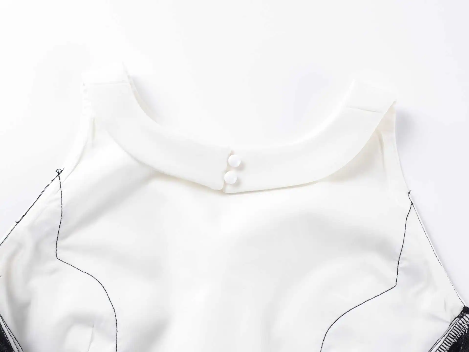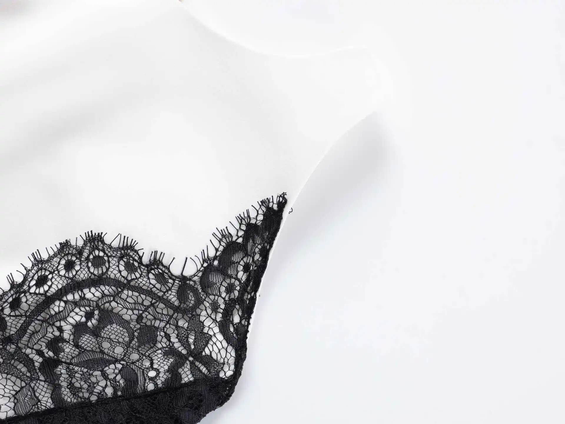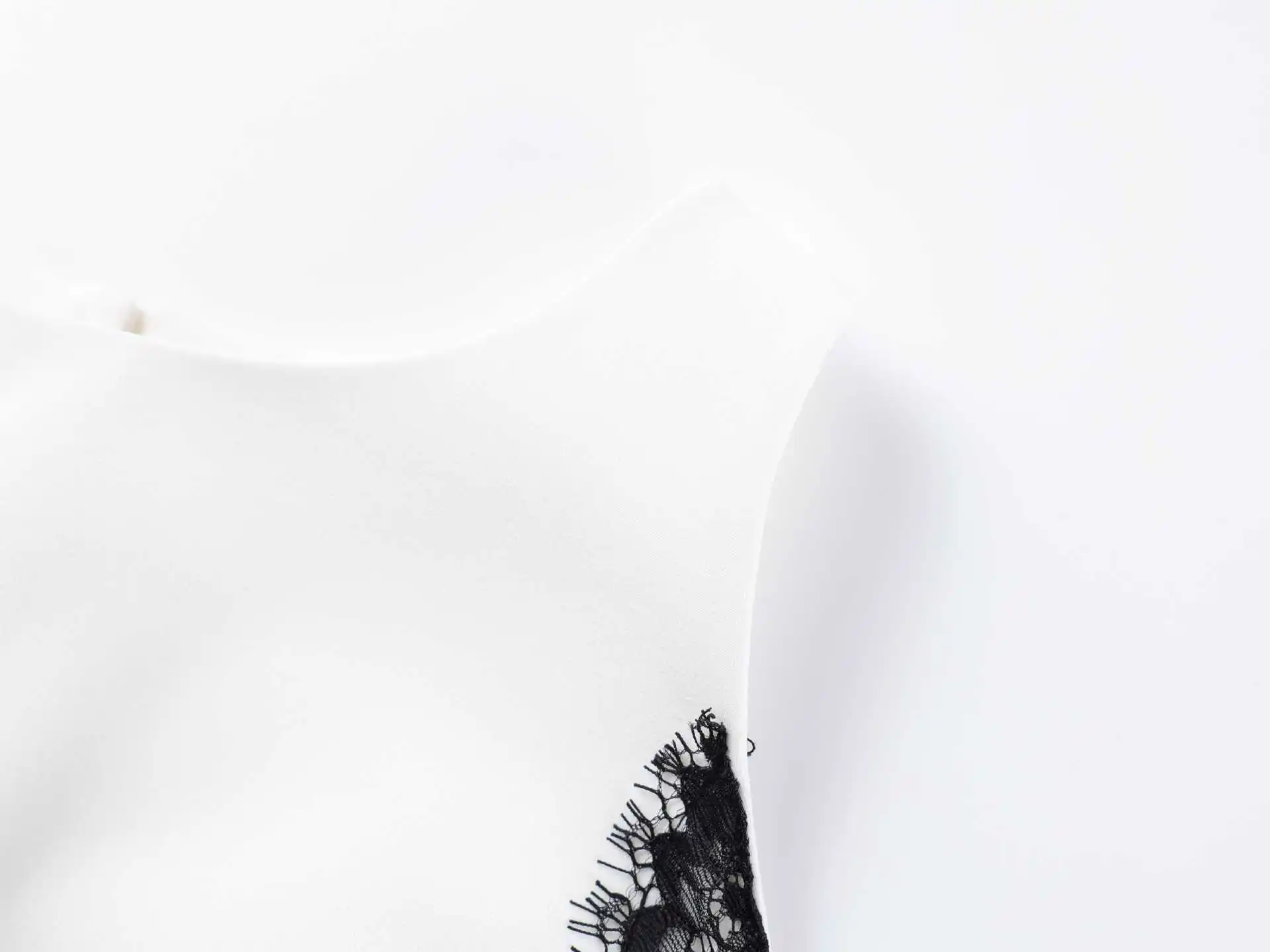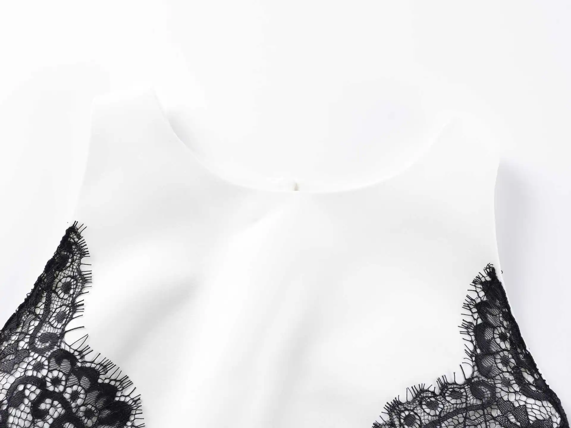 Details: Contrast black lace appliqué, sculpted paneling, back slit