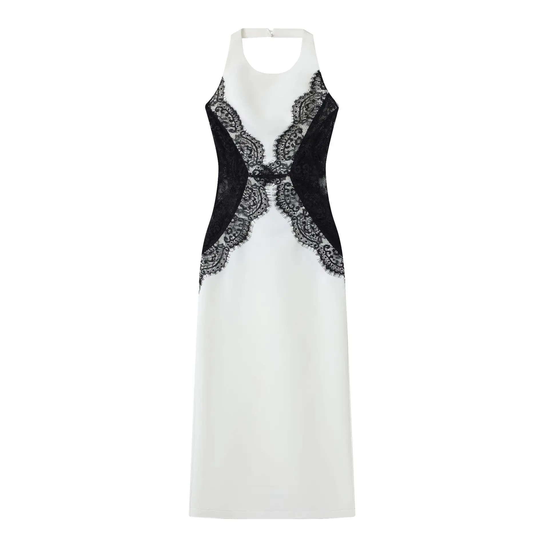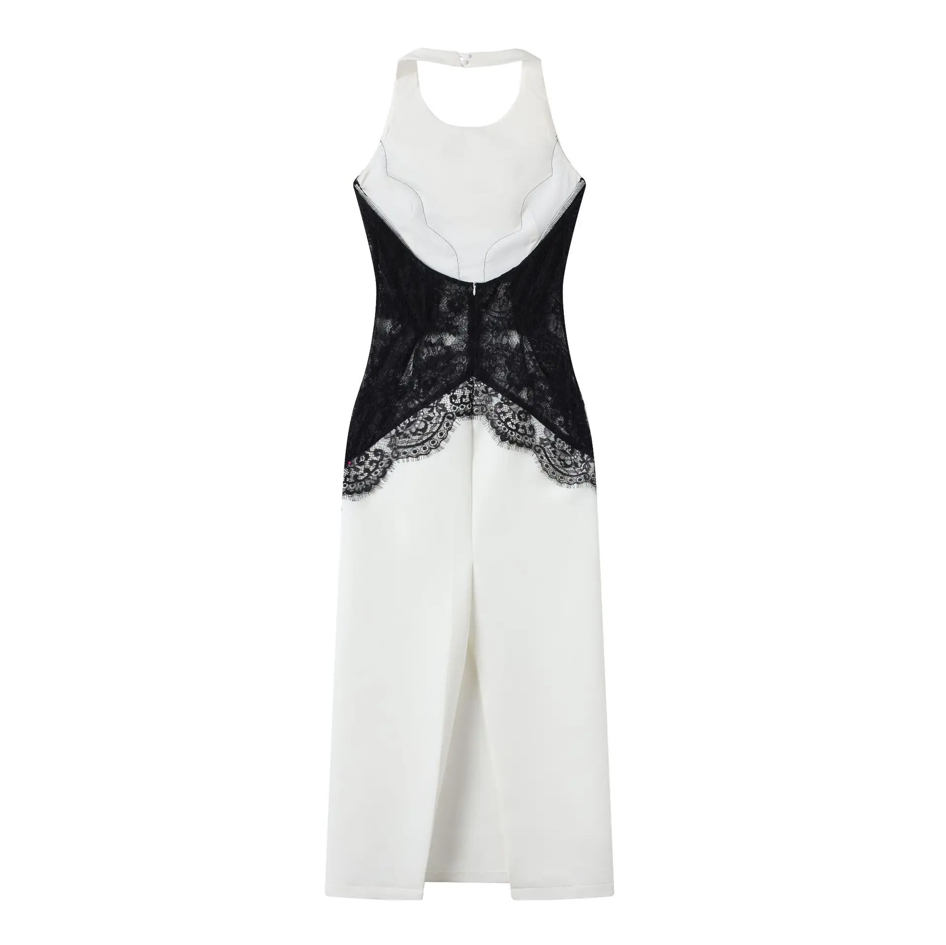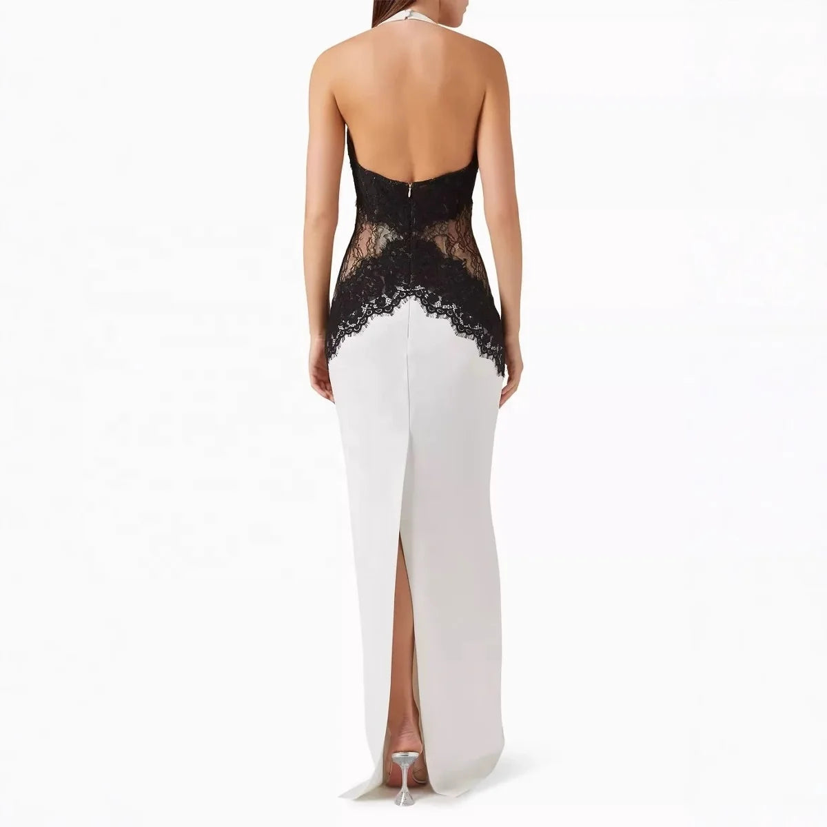 The halter neckline adds a contemporary touch, drawing attention to the shoulders and elongating the figure, while the sleek white base fabric enhances the dramatic lace detailing. Intricate lace appliqué wraps from front to back, highlighting every curve with sophisticated refinement.