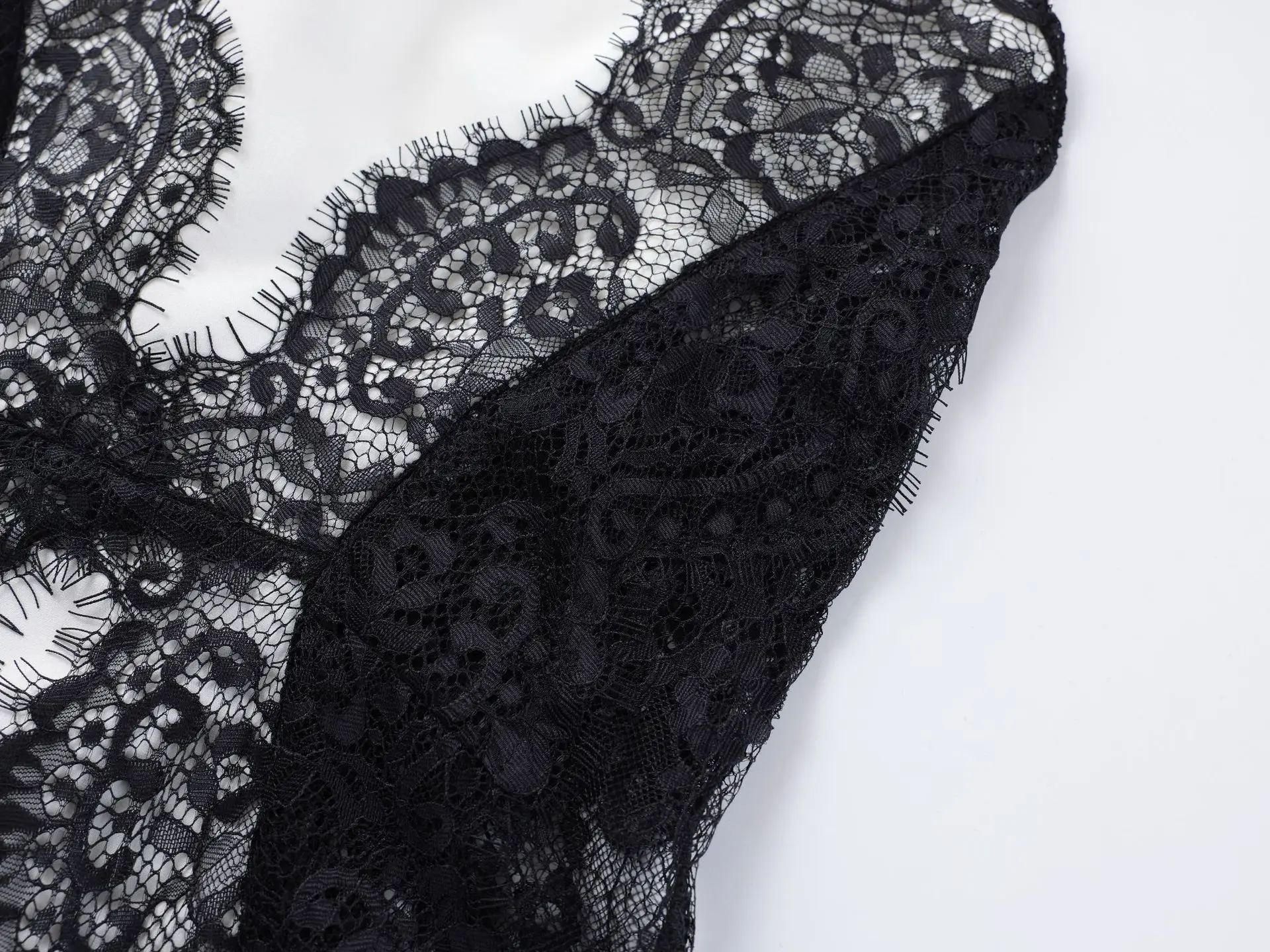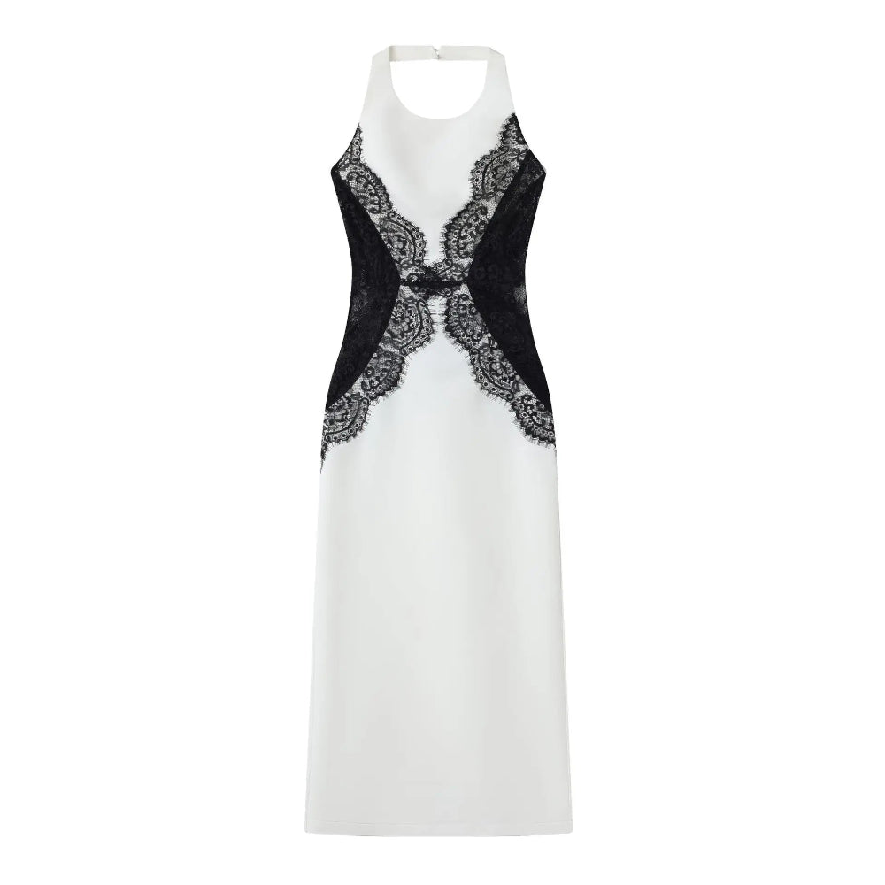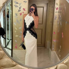Turn every entrance into a statement with the Trend4us Luxe Contrast Lace Sculpted Halter Maxi Dress—a striking blend of elegance, artistry, and modern couture design. Crafted with precision, this gown features contrasting black lace that artfully frames the silhouette, creating an hourglass illusion that is both bold and irresistibly feminine.