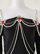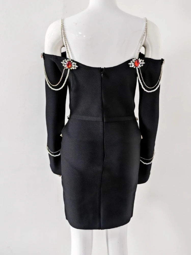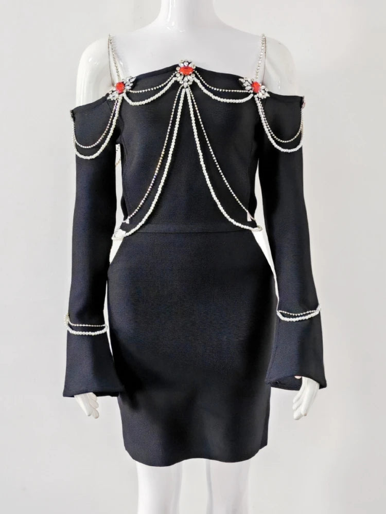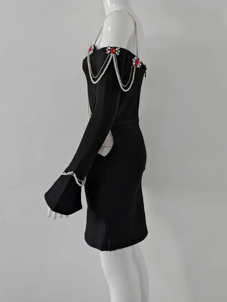 Make a dazzling entrance in the Trend4us Luxe Crystal Chain Cutout Off-Shoulder Dress, a bold fusion of elegance and modern glamour. Crafted from premium stretch fabric, this bodycon silhouette flatters the figure while allowing comfortable movement. The off-shoulder neckline is adorned with intricate pearl chains and crystal floral accents, creating an opulent statement look. Dramatic side cutouts sculpt the waist, while long sleeves with pearl draped details add a touch of sophistication. A concealed back zipper ensures a smooth fit, making this the perfect piece for upscale evenings, red-carpet events, or statement parties.