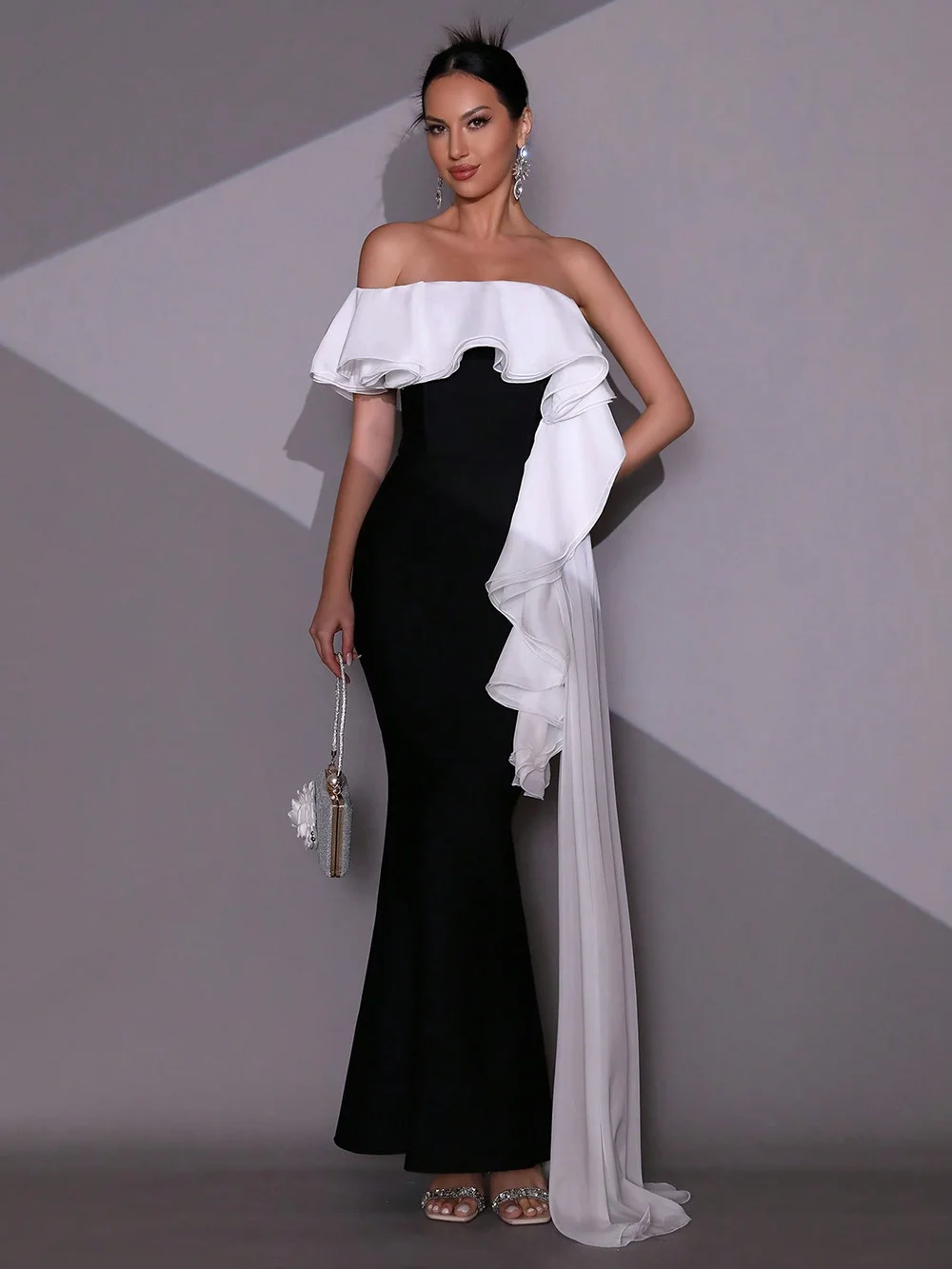 The off-shoulder neckline beautifully frames the collarbone, complemented by a dramatic two-tone ruffle cascade that flows from the bust to the hem, adding movement, asymmetry, and high-fashion artistry. The mermaid shape elongates the figure, and the long trailing ruffle adds runway-worthy sophistication.