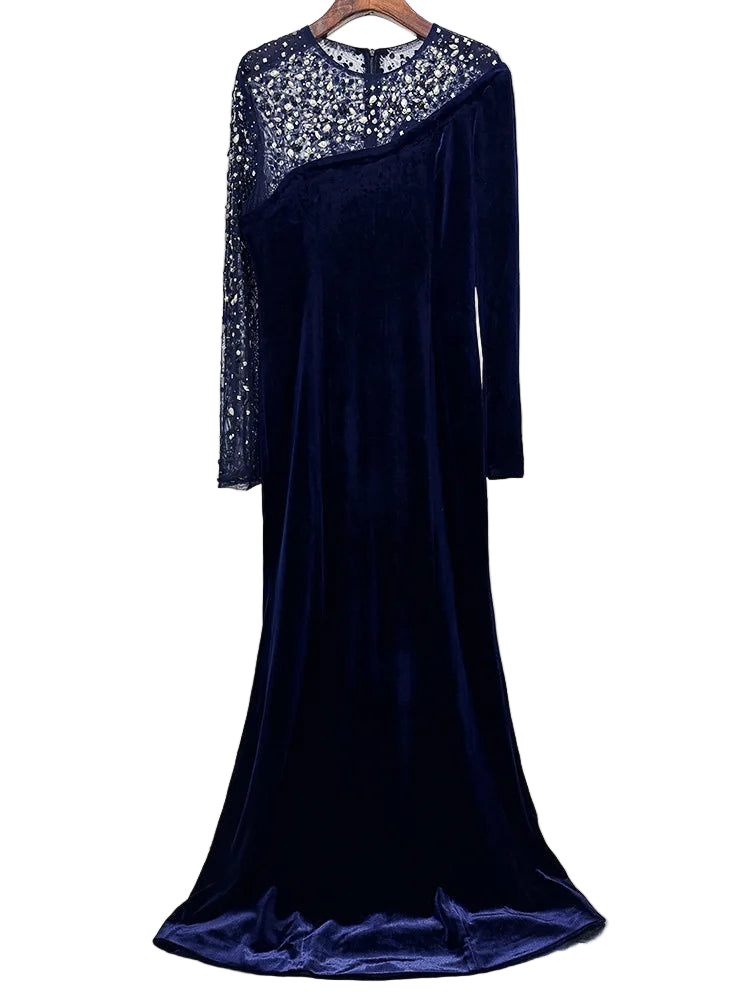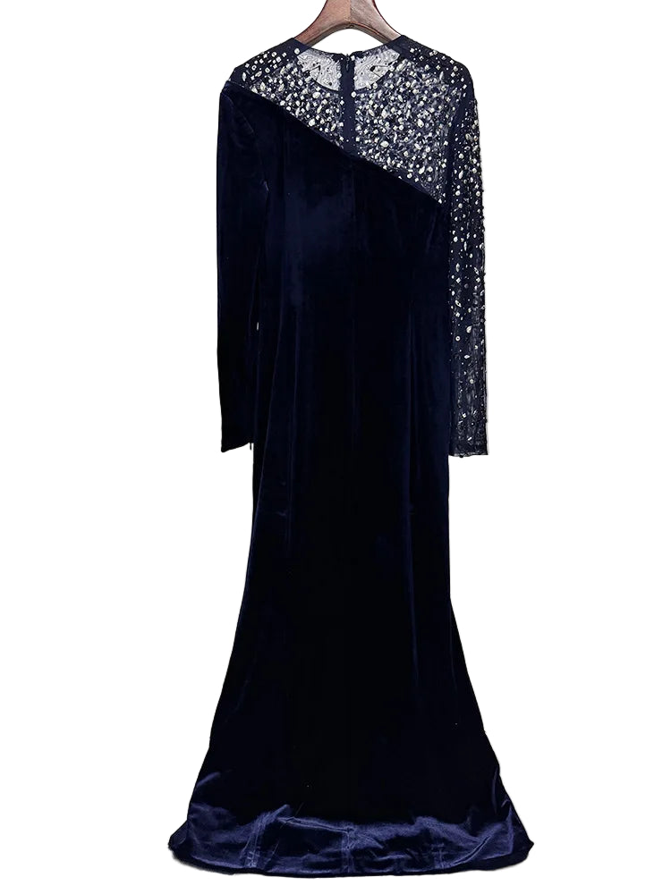 Elevate your evening presence with the Trend4us Luxe Velvet Crystal-Embellished Illusion Sleeve Gown, a breathtaking masterpiece crafted for high-profile galas, red carpet moments, and luxury events.
