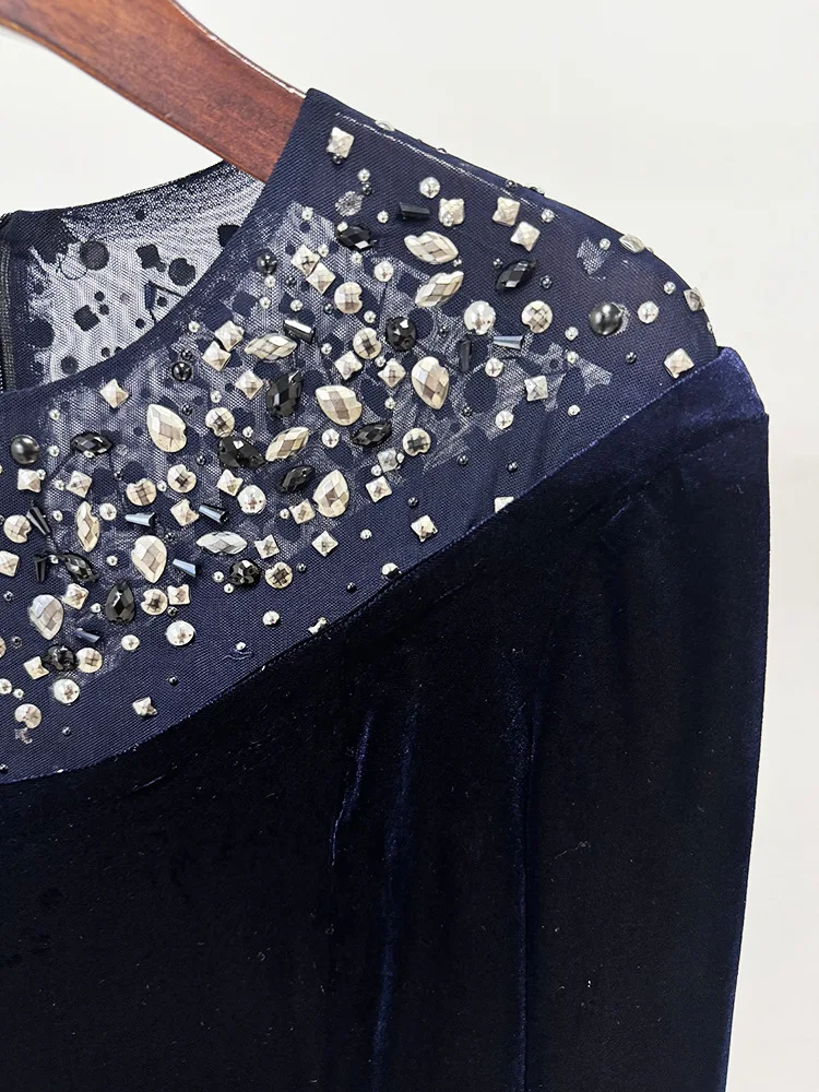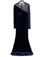 Designed in deep midnight velvet, this gown sculpts the silhouette with a statuesque, elongated fit while offering a rich, luminous texture. The asymmetric illusion neckline creates a striking couture effect, blending sheer mesh with meticulously hand-applied crystals and gemstones.
