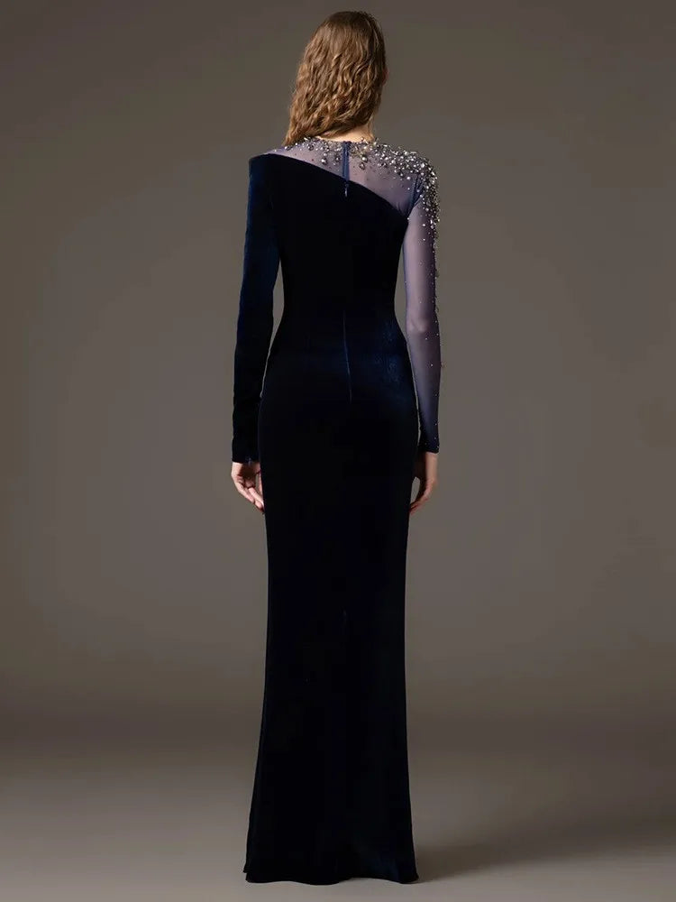 One sleeve showcases a full crystal-adorned mesh finish, giving a stunning high-fashion contrast, while the other remains sleek in velvet for a modern, asymmetrical balance. The gown flows into a graceful floor-length hem, subtly flaring for elegant movement.