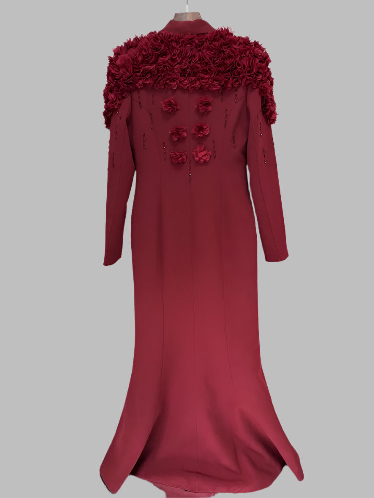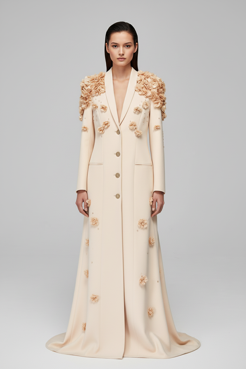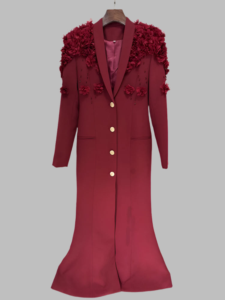 Command attention with power and beauty. The Luxe Floral Embellished Long Blazer Dress features intricate 3D floral appliqués adorning the shoulders and upper bodice on a structured silhouette with gold-tone button detailing.