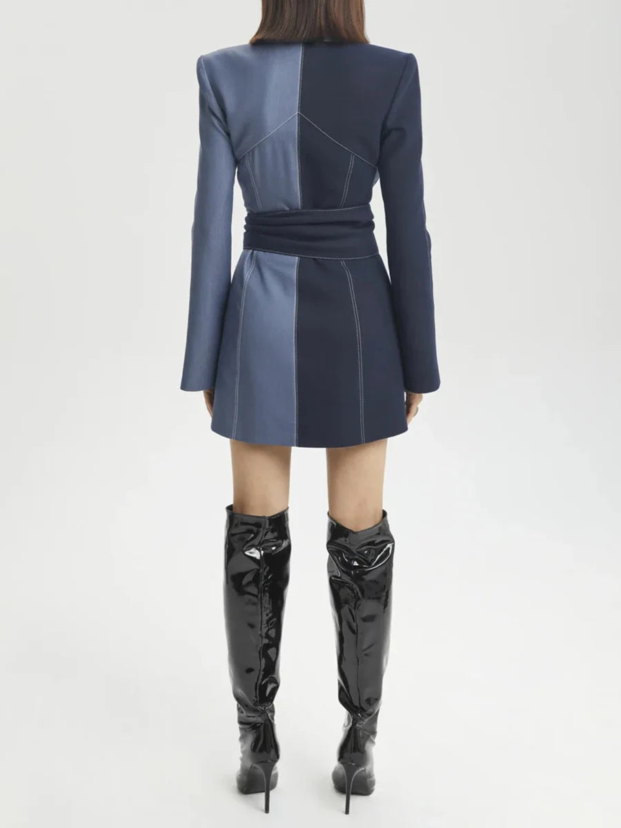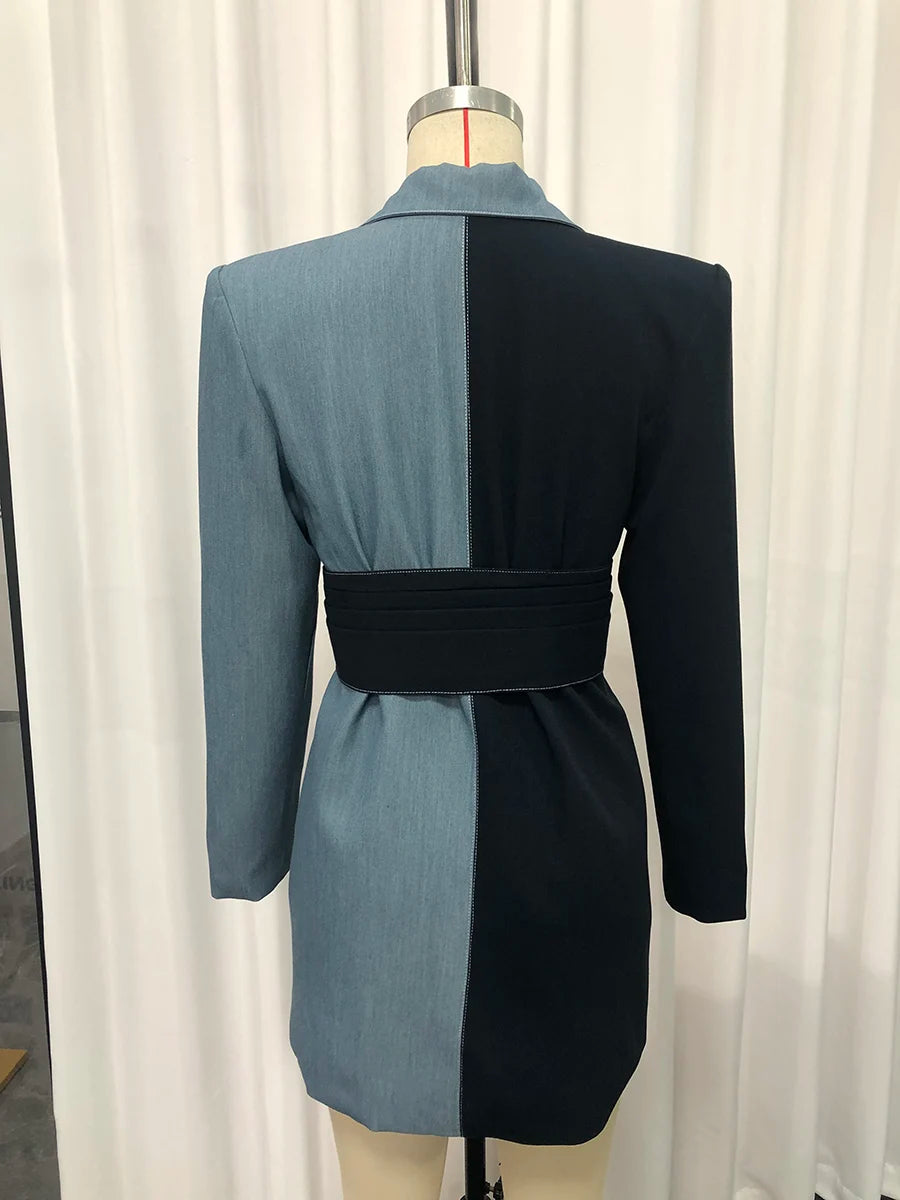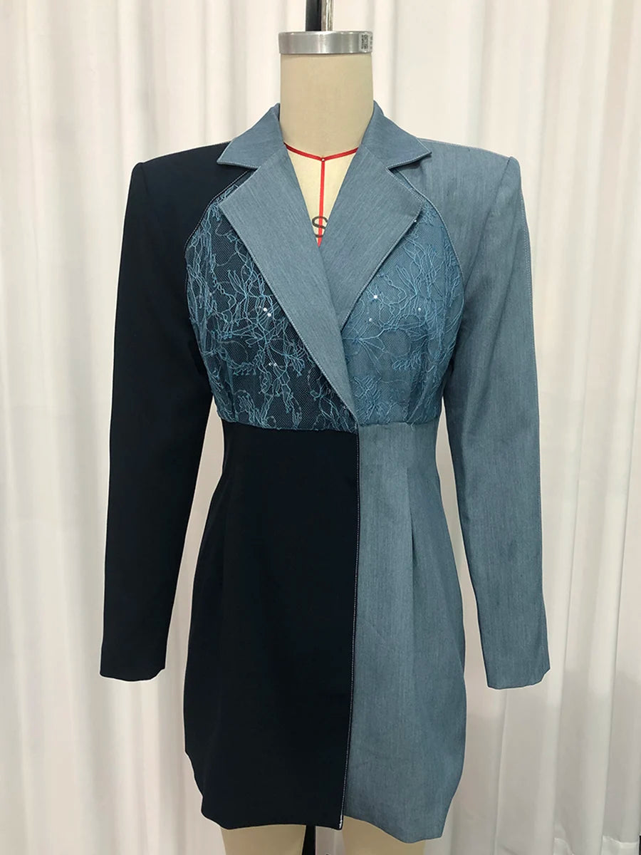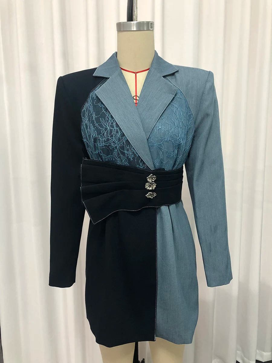 Trend4us Luxe Contrast Denim & Lace Panel Blazer Dress