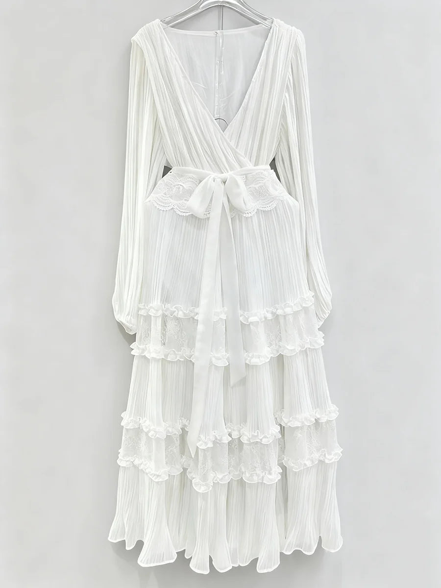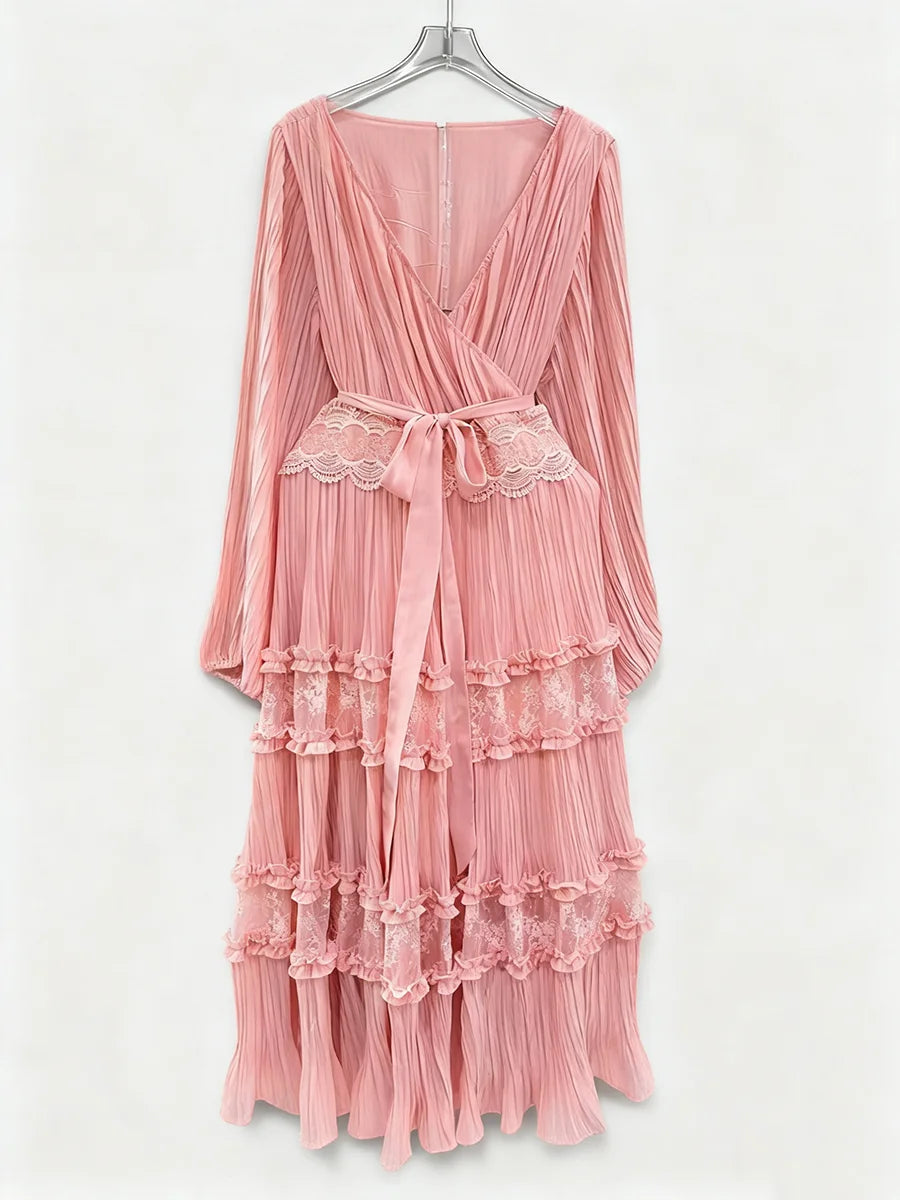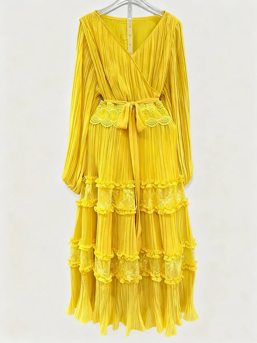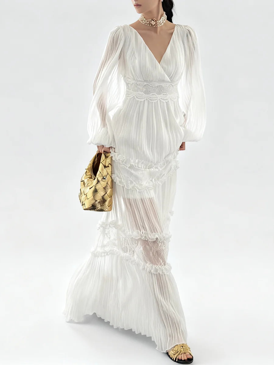 Trend4us Elegant Pleated Lace Panel Maxi Dress