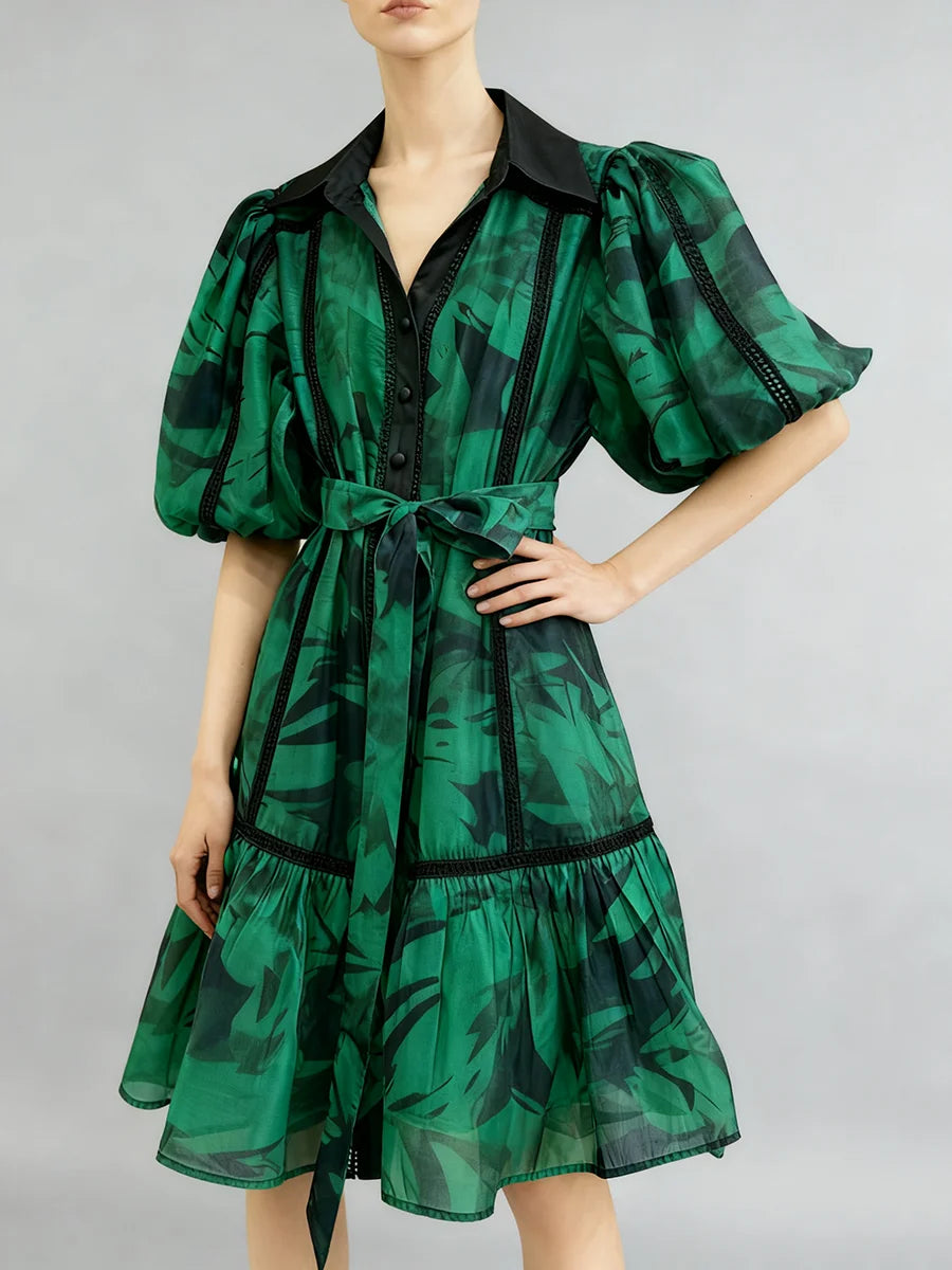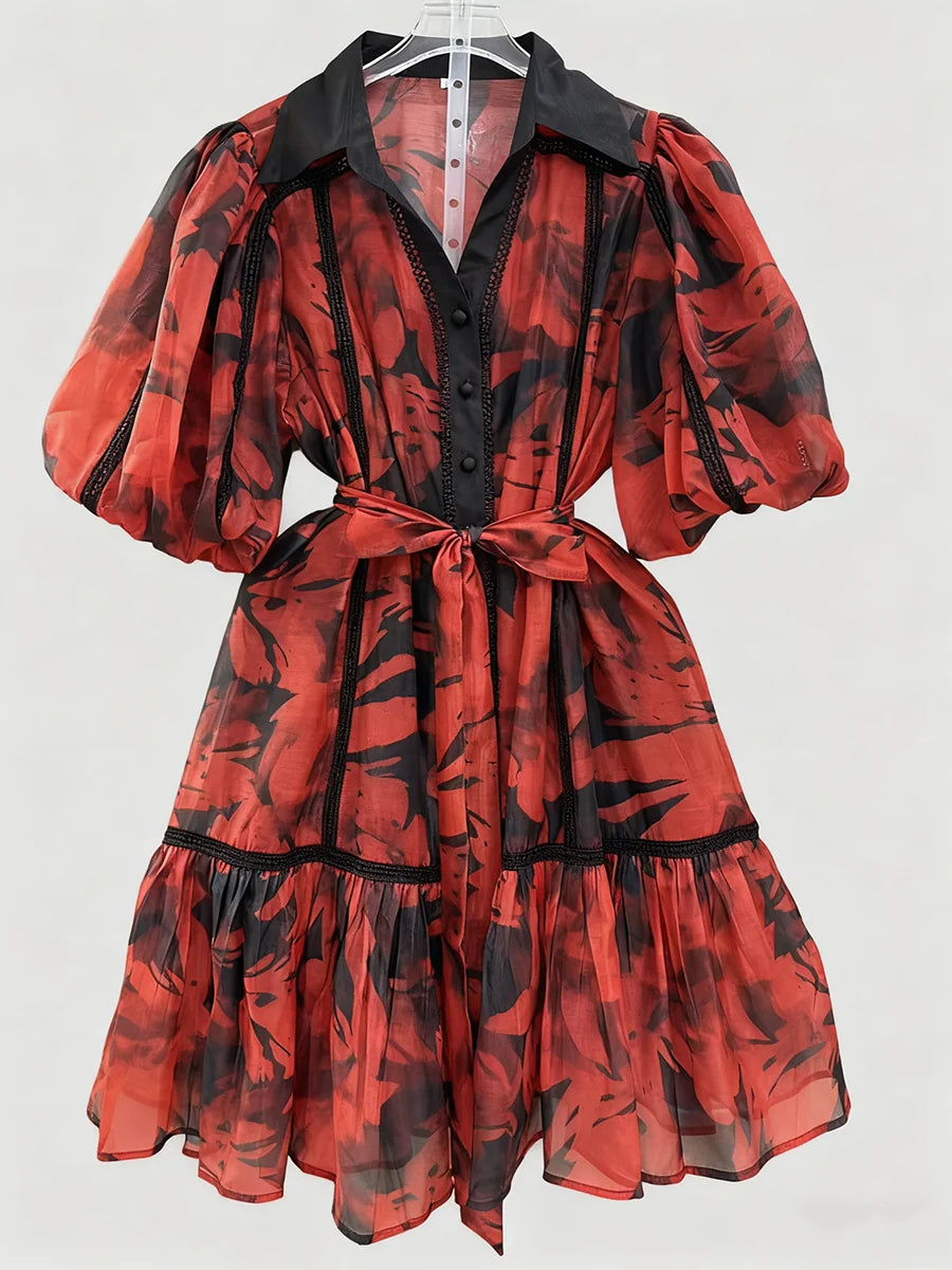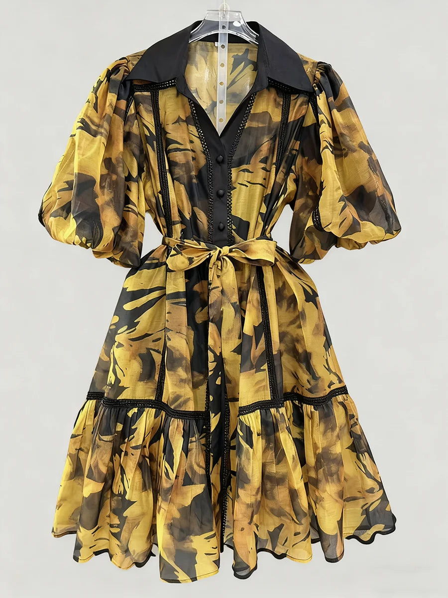 Trend4us Luxe Printed Puff Sleeve Belted Dress
