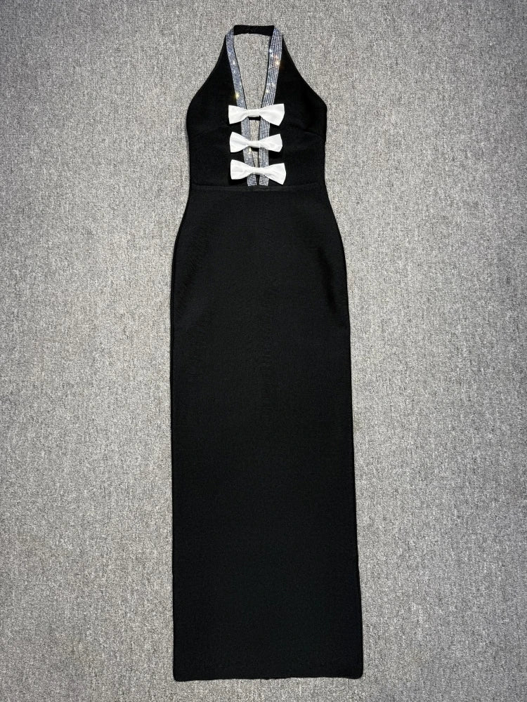 Trend4us Luxe Backless Crystal Bow Halter Maxi Dress