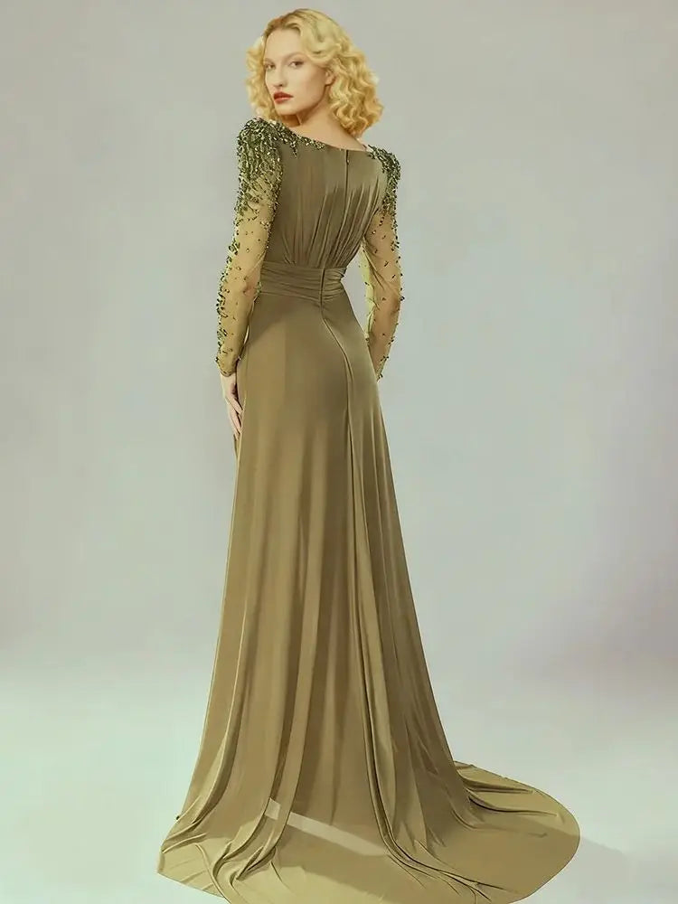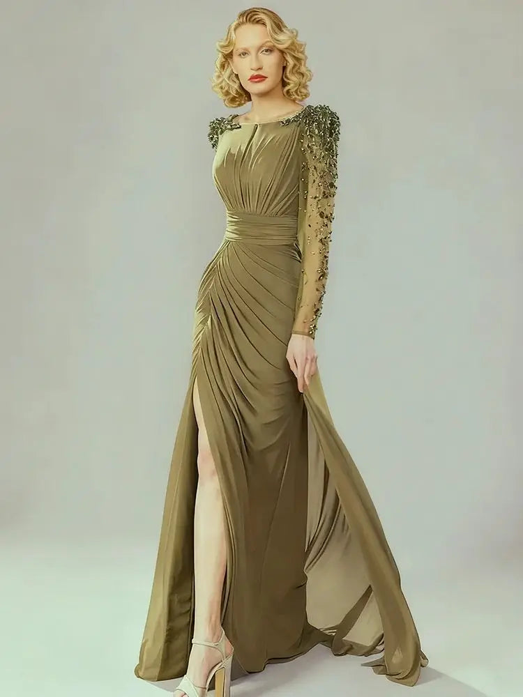 Trend4us Elegant Beaded Shoulder Pleated Slit Evening Gown