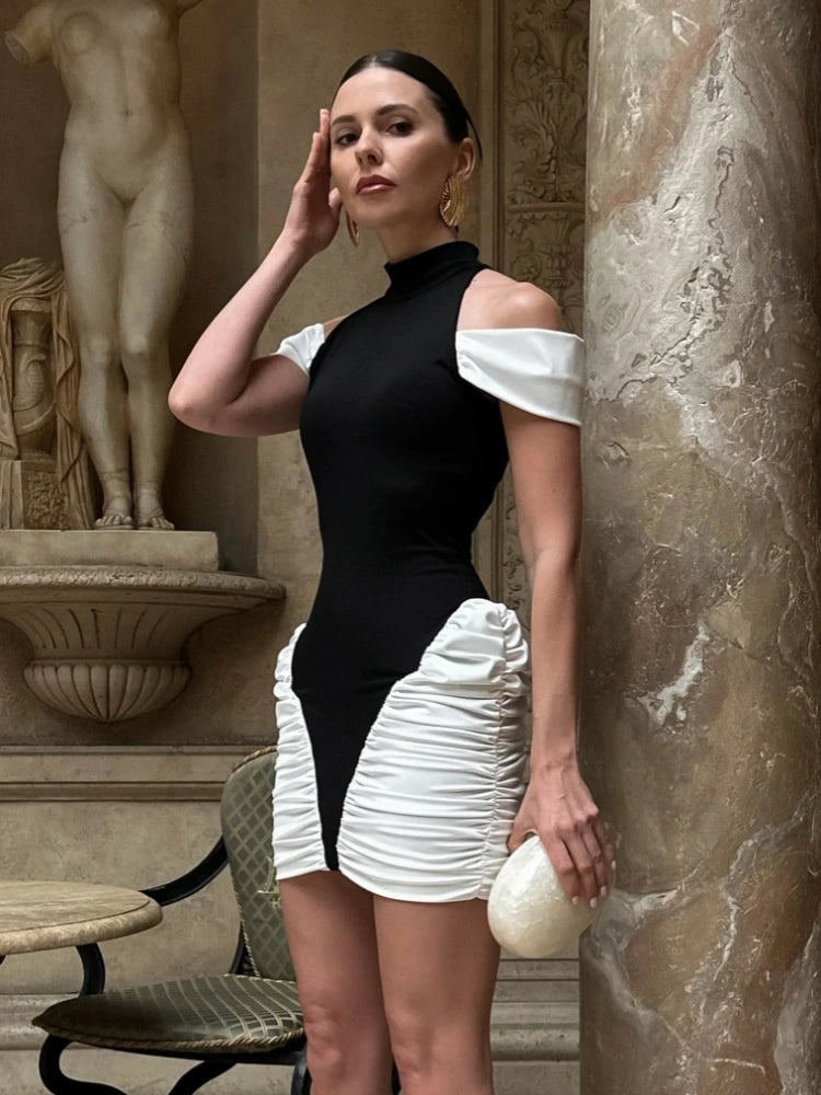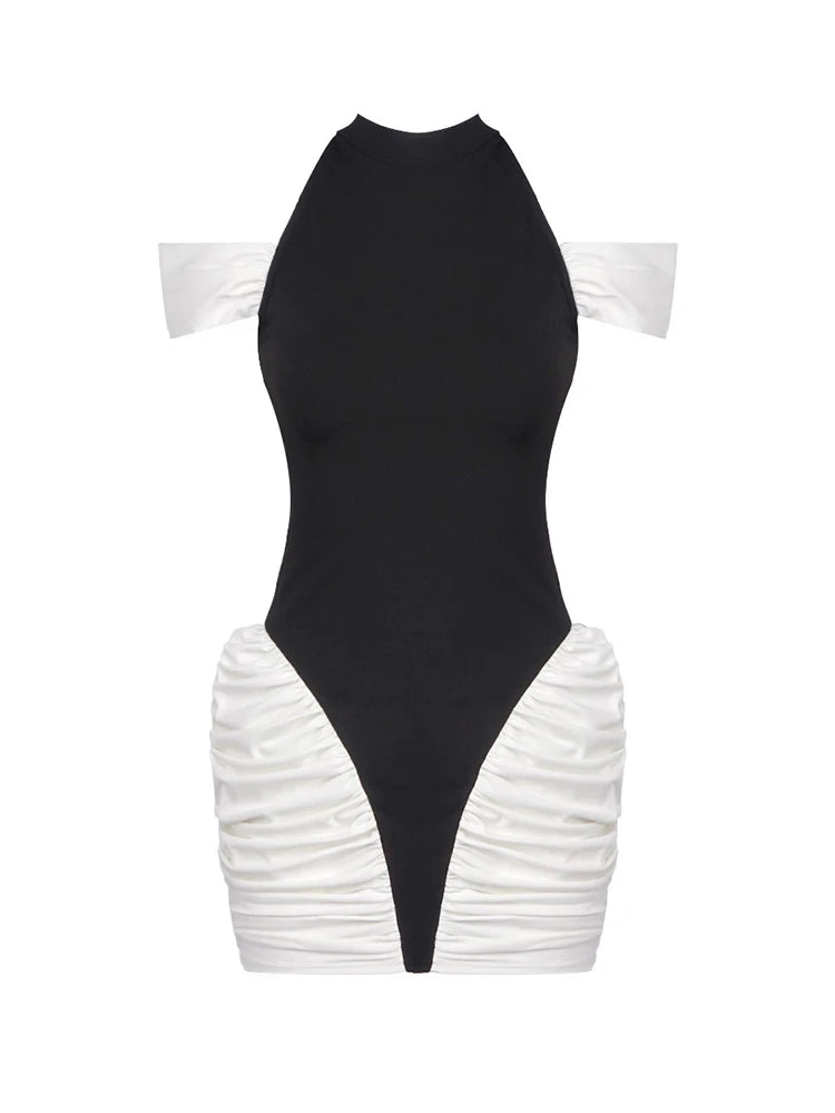 Trend4us Contrast Panel Cold-Shoulder Ruched Mini Dress