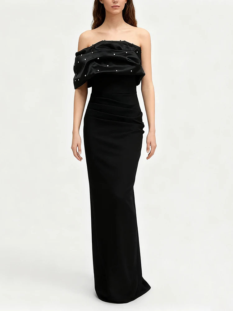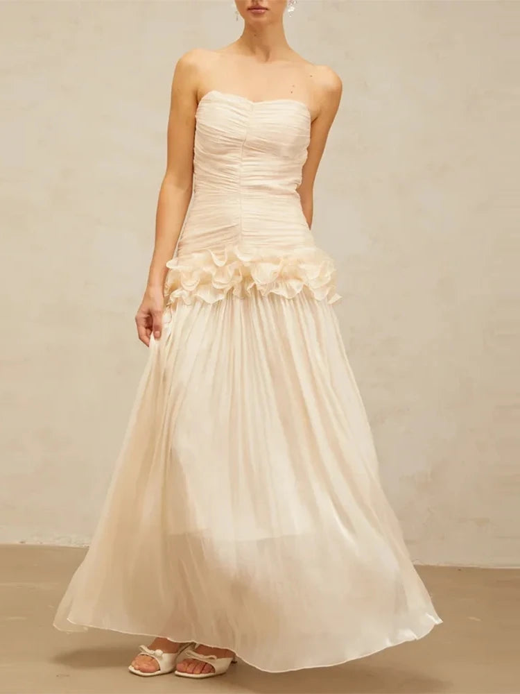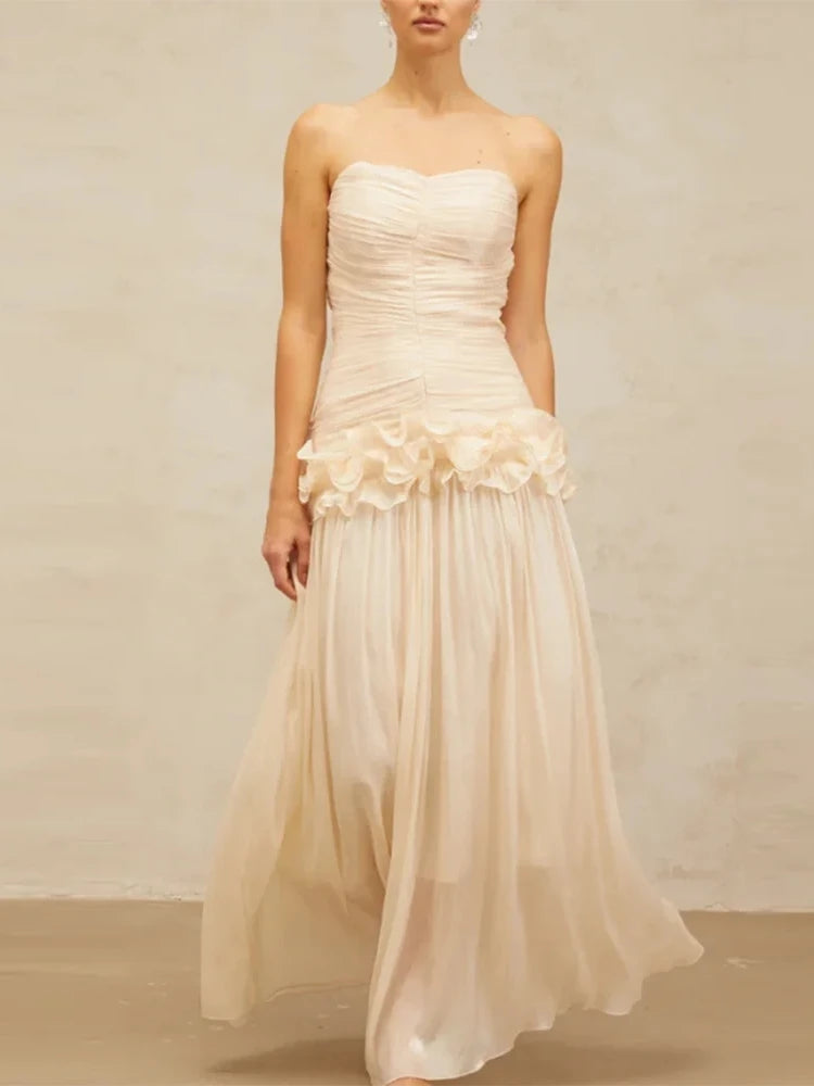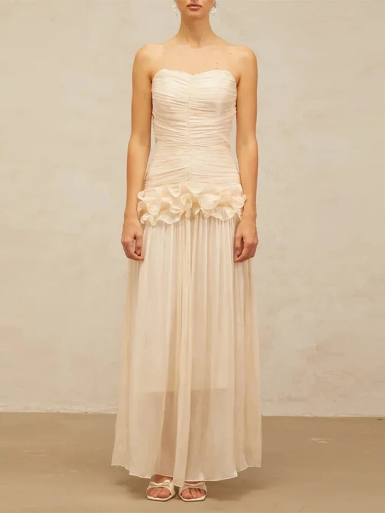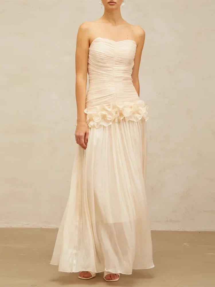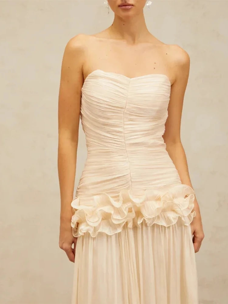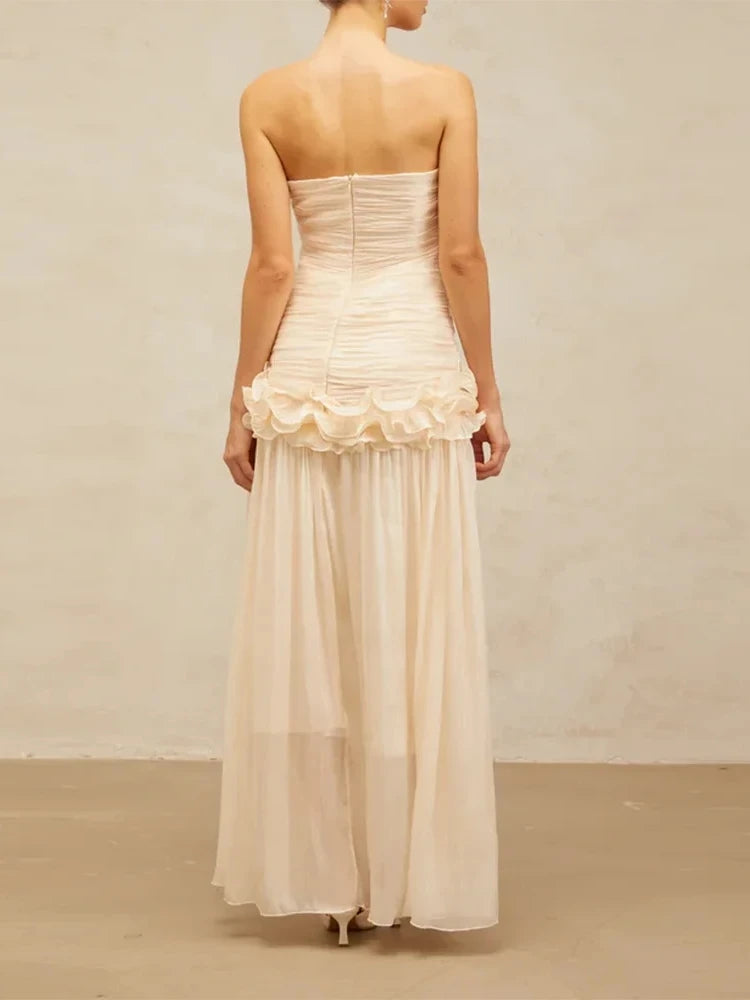 Trend4us Elegant Strapless Ruched Ruffle Maxi Dress