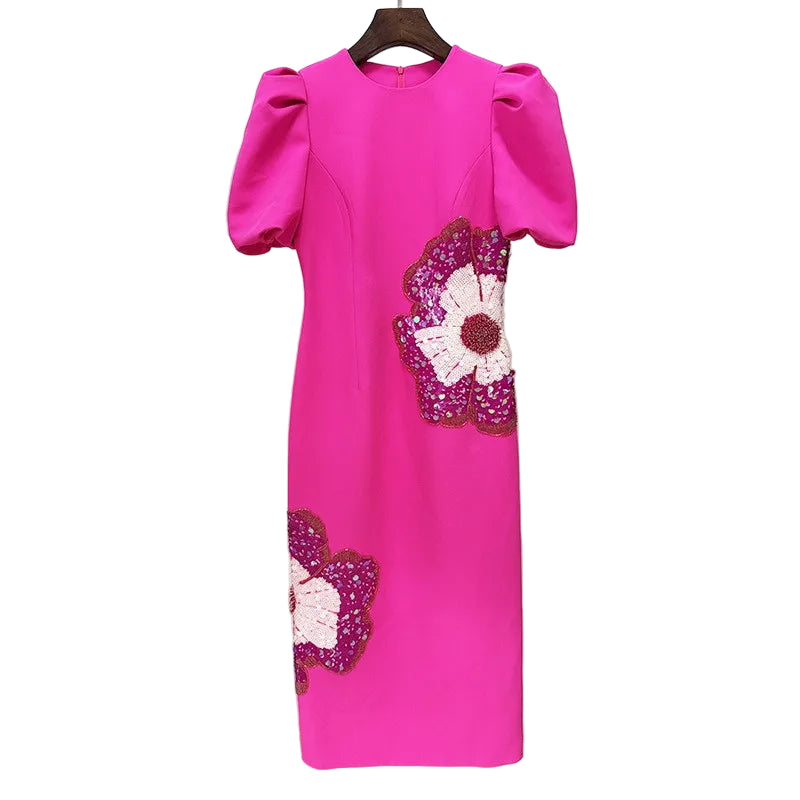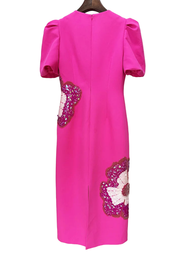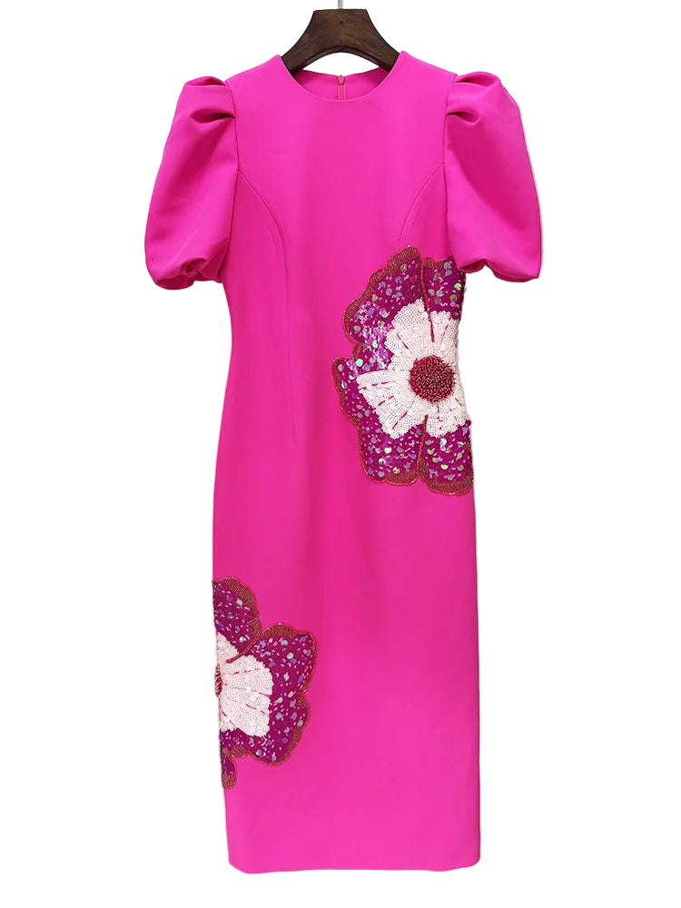 Trend4us Luxe Embroidered 3D Appliqué Puff Sleeve Dress