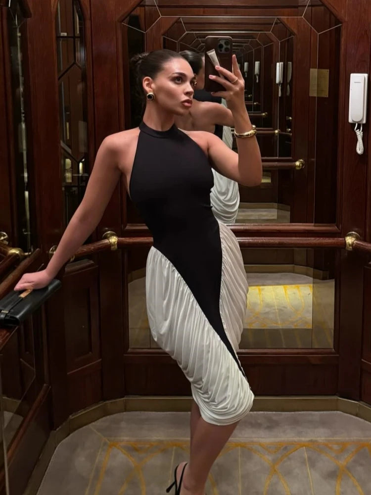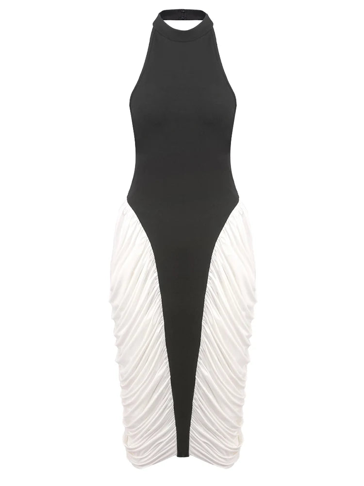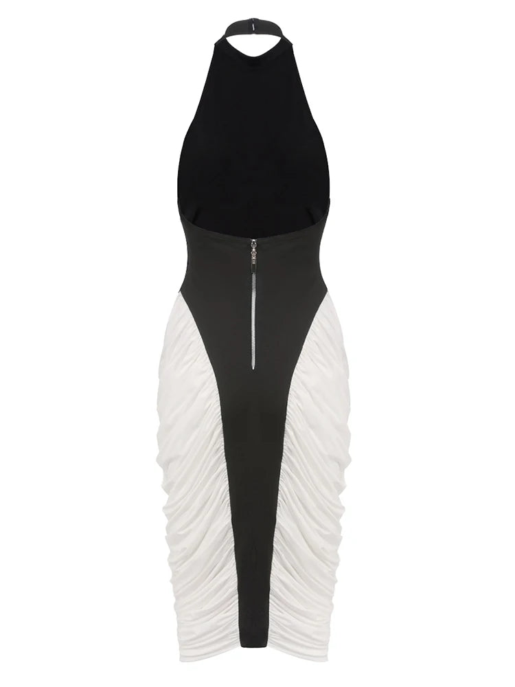 Trend4us Luxe Backless Contrast Halter Ruched Midi Dress