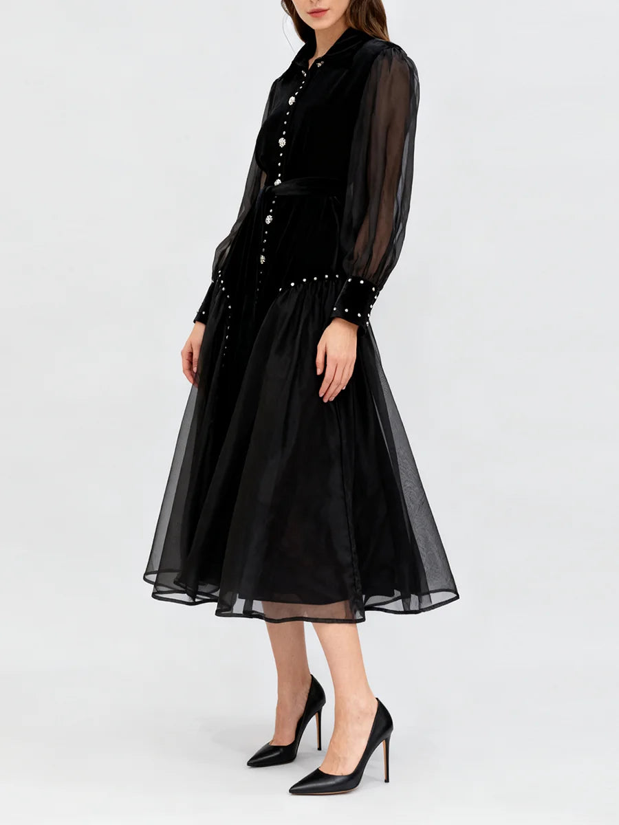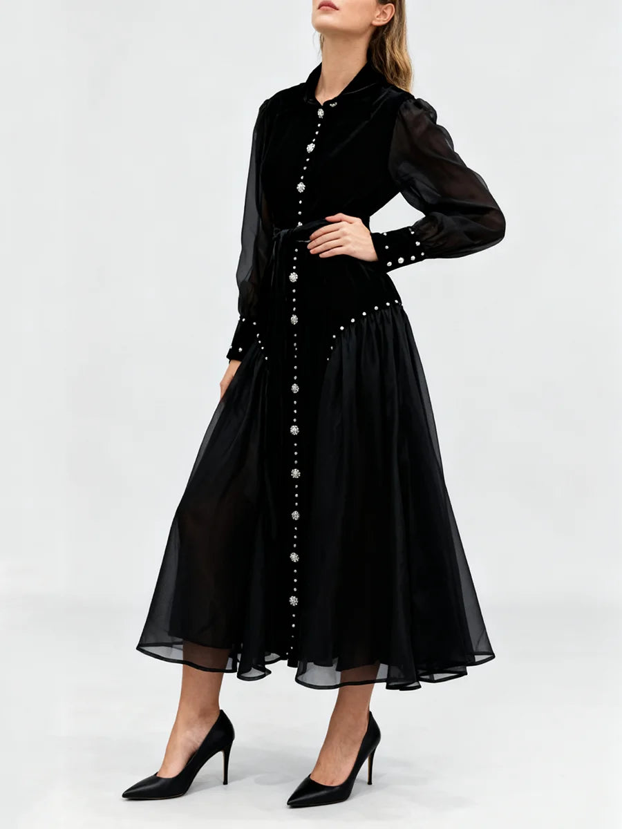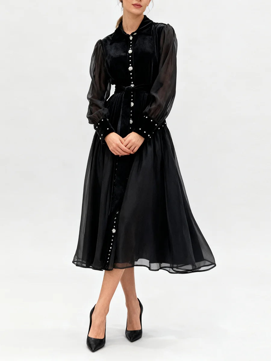 Trend4us Luxe Velvet Sheer Sleeve Crystal Button Midi Dress