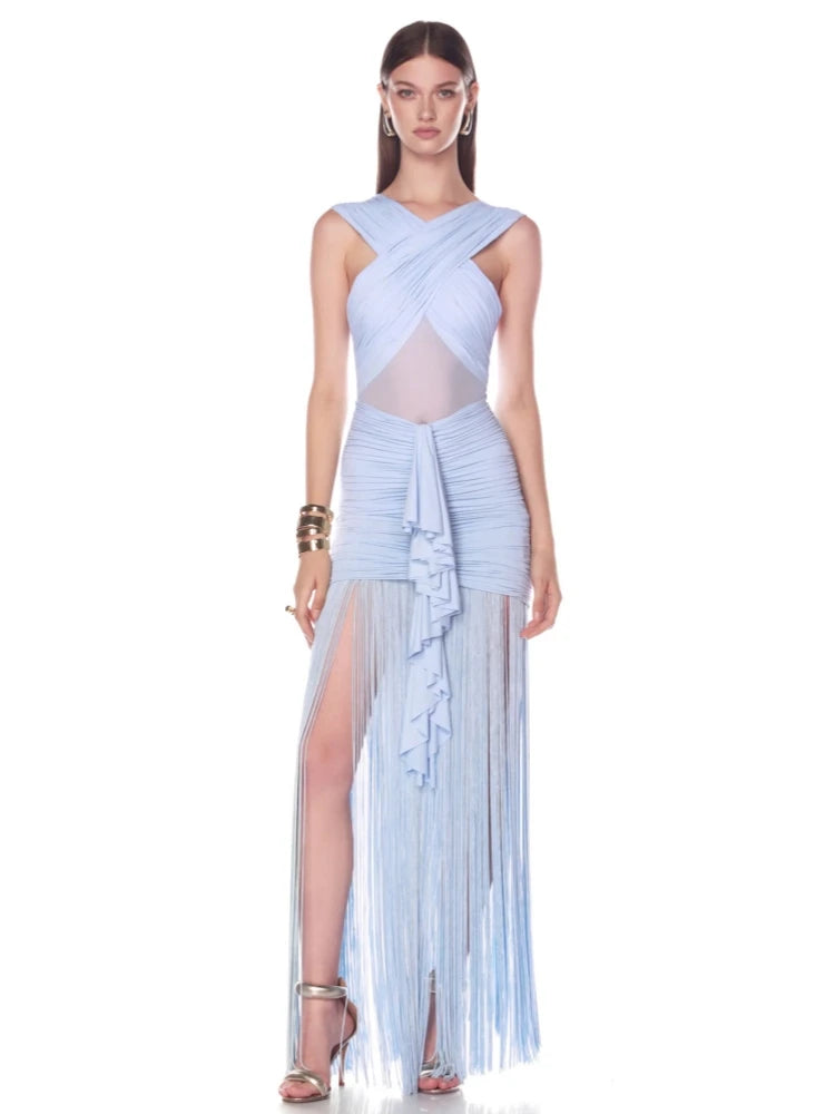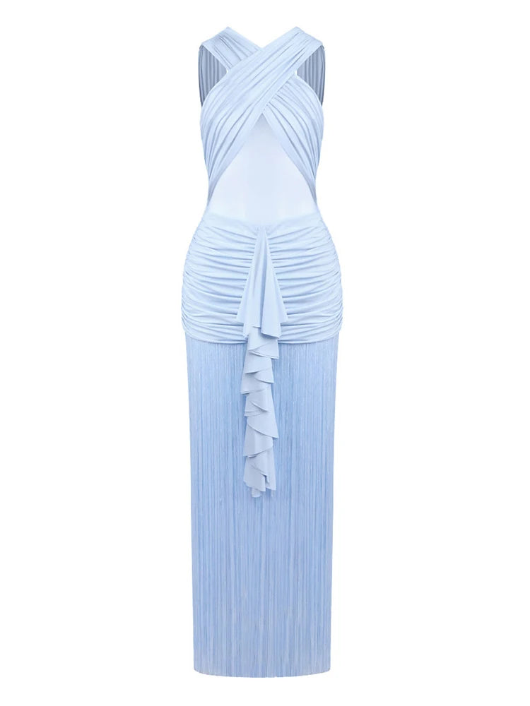 Trend4us Luxe Fringe Detail Ruched Maxi Dress
