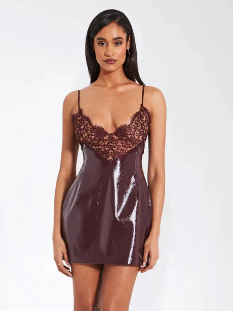 Trend4us Glossy Lace Trim Faux Leather Mini Dress
