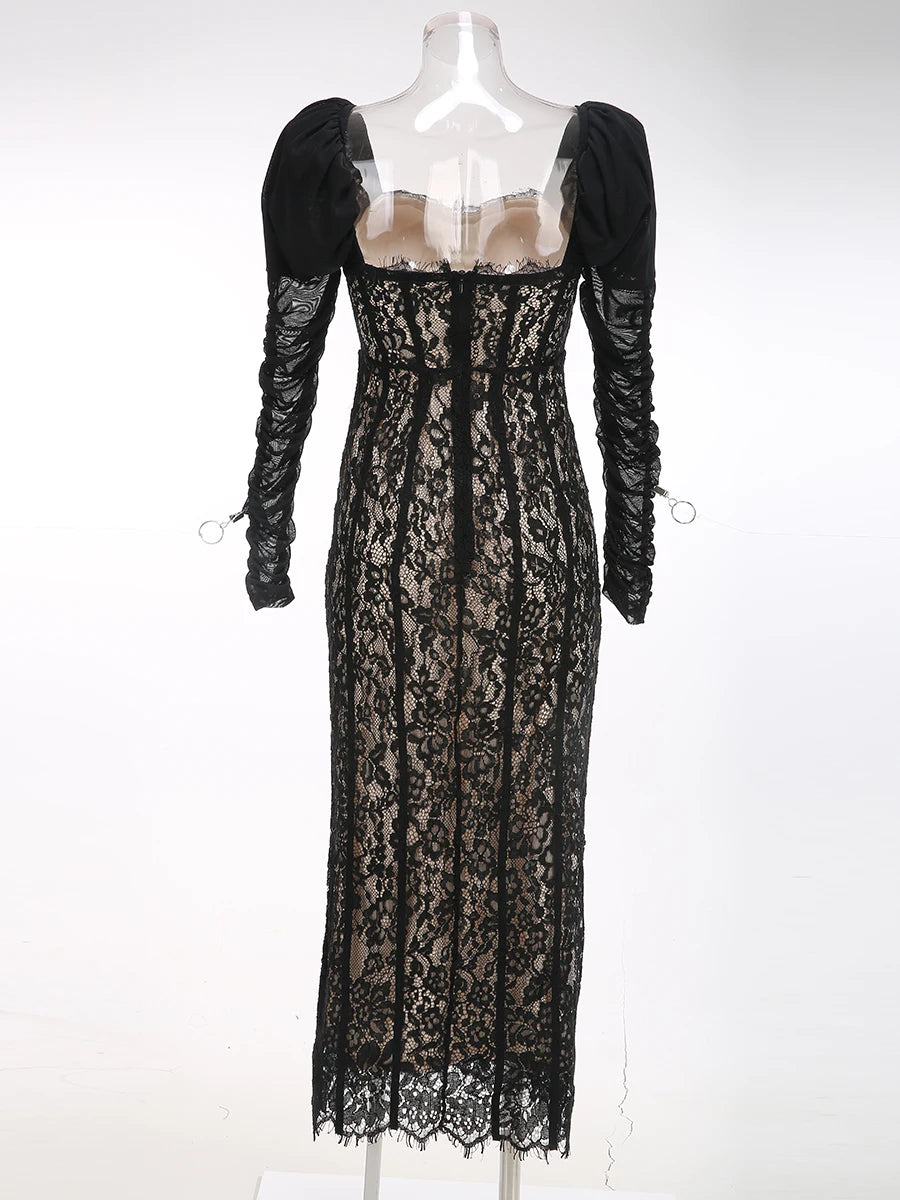 Command attention with the Trend4us Couture Lace Corset Long-Sleeve Dress — a stunning fusion of romantic lace artistry and sculpting couture structure. The sheer floral lace body creates an alluring contrast against the built-in corset seaming, while the ruched long sleeves and soft puffed shoulder detail elevate the silhouette with timeless drama.