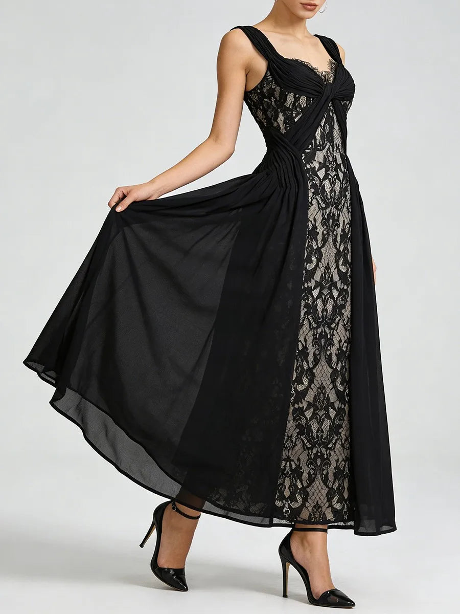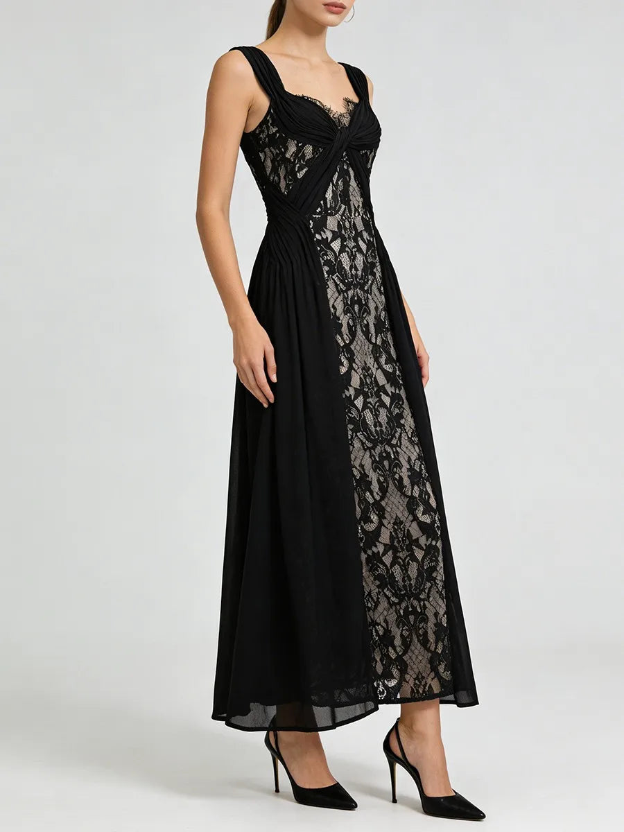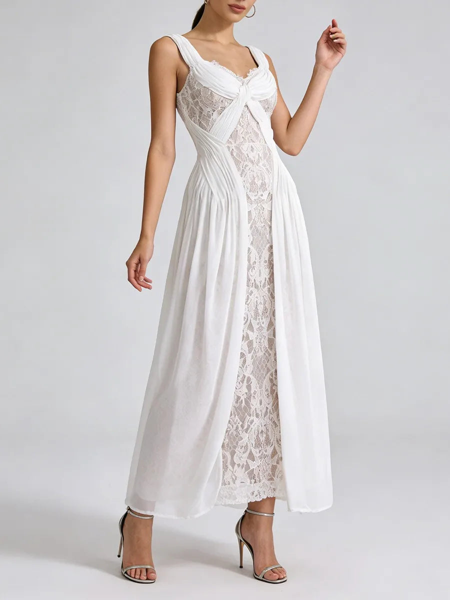 Trend4us Elegant Lace Panel Draped Sleeveless Maxi Dress