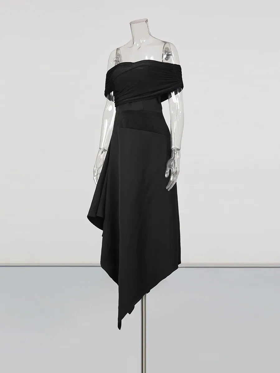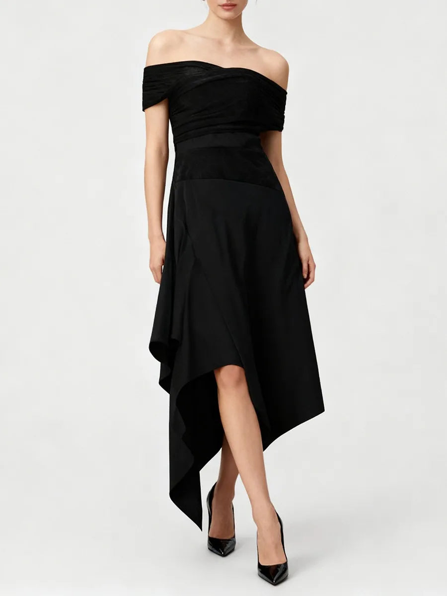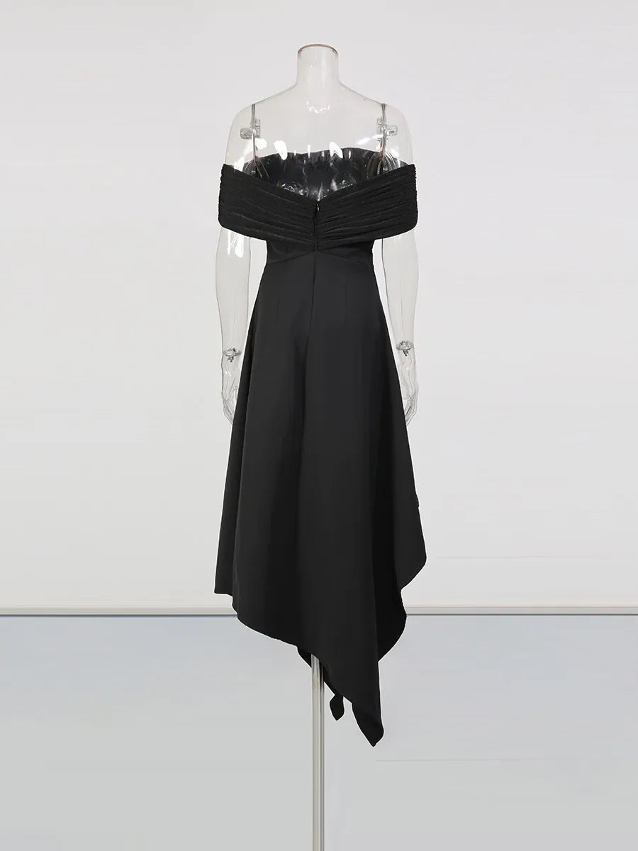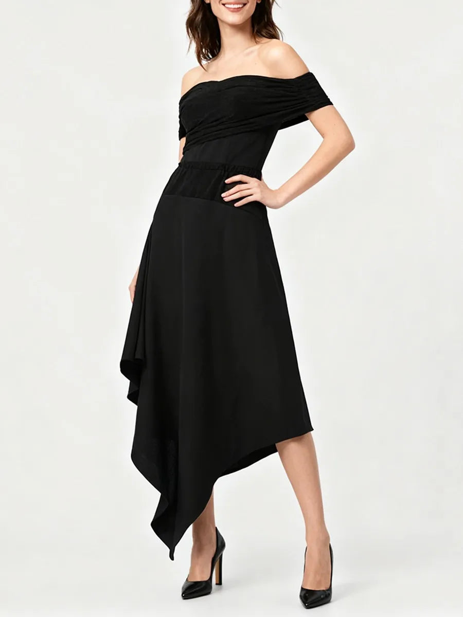 Effortless elegance meets modern edge in our Trend4us Elegant Off-Shoulder Asymmetric Midi Dress. Designed with a dramatic off-shoulder neckline and perfectly draped bodice, this piece delivers a sophisticated silhouette with a touch of allure. The cinched waist enhances your shape while the asymmetric handkerchief hem adds movement and fashion-forward flair. Ideal for evening dinners, cocktail parties, and special celebrations—this dress guarantees all eyes on you.