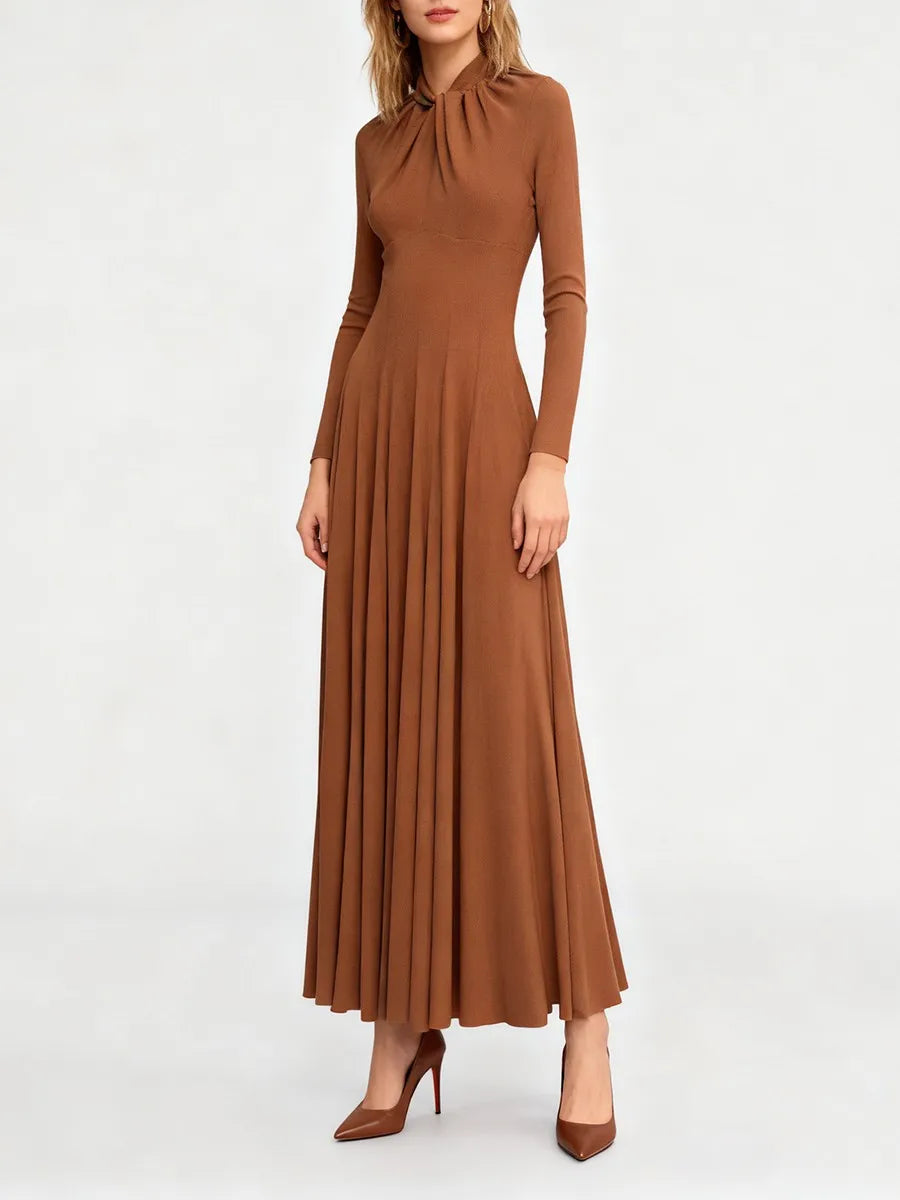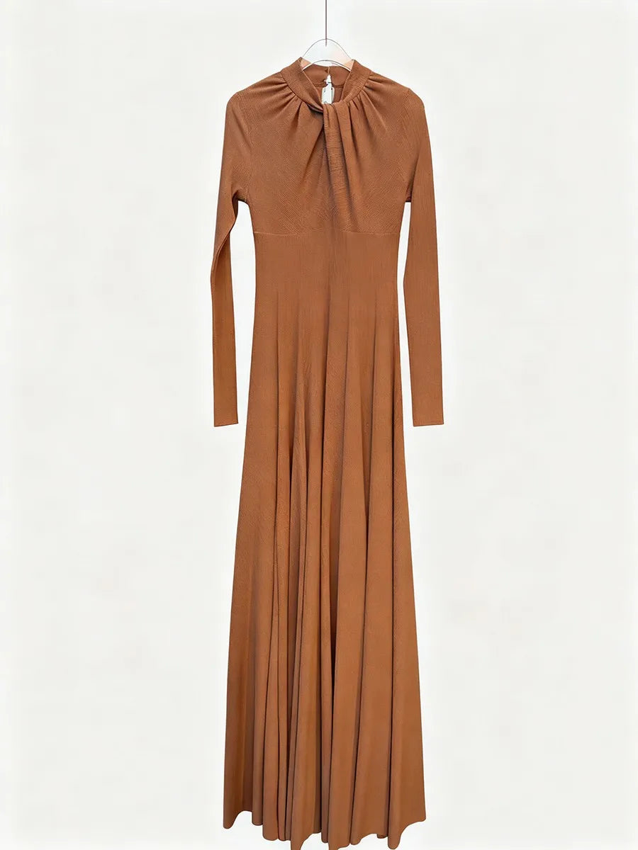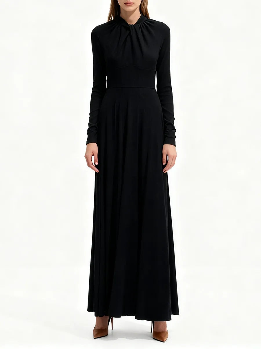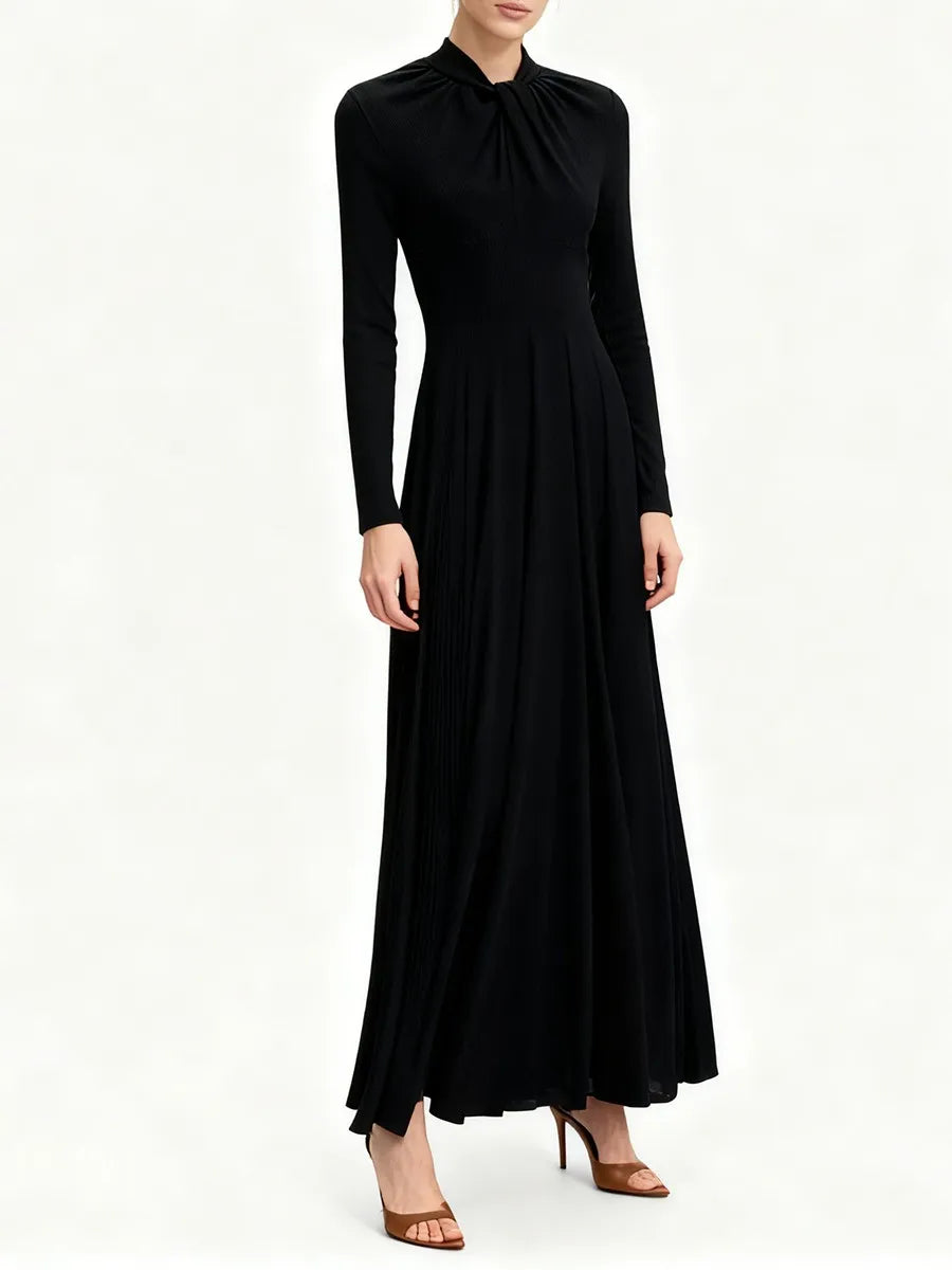 A masterpiece of sophisticated minimalism — this maxi dress features a beautifully gathered neckline, a graceful long-sleeve silhouette, and a fluid pleated skirt that moves with every step. Crafted in a soft, lightweight stretch fabric, it delivers a flattering, elongating fit that effortlessly balances elegance and comfort. Whether for evening events, seasonal parties, or refined daytime outings, this dress ensures a look of timeless chic.