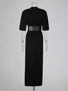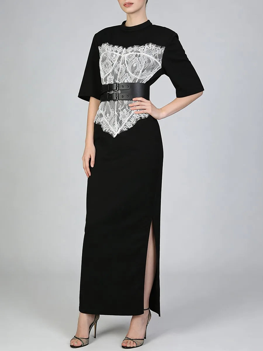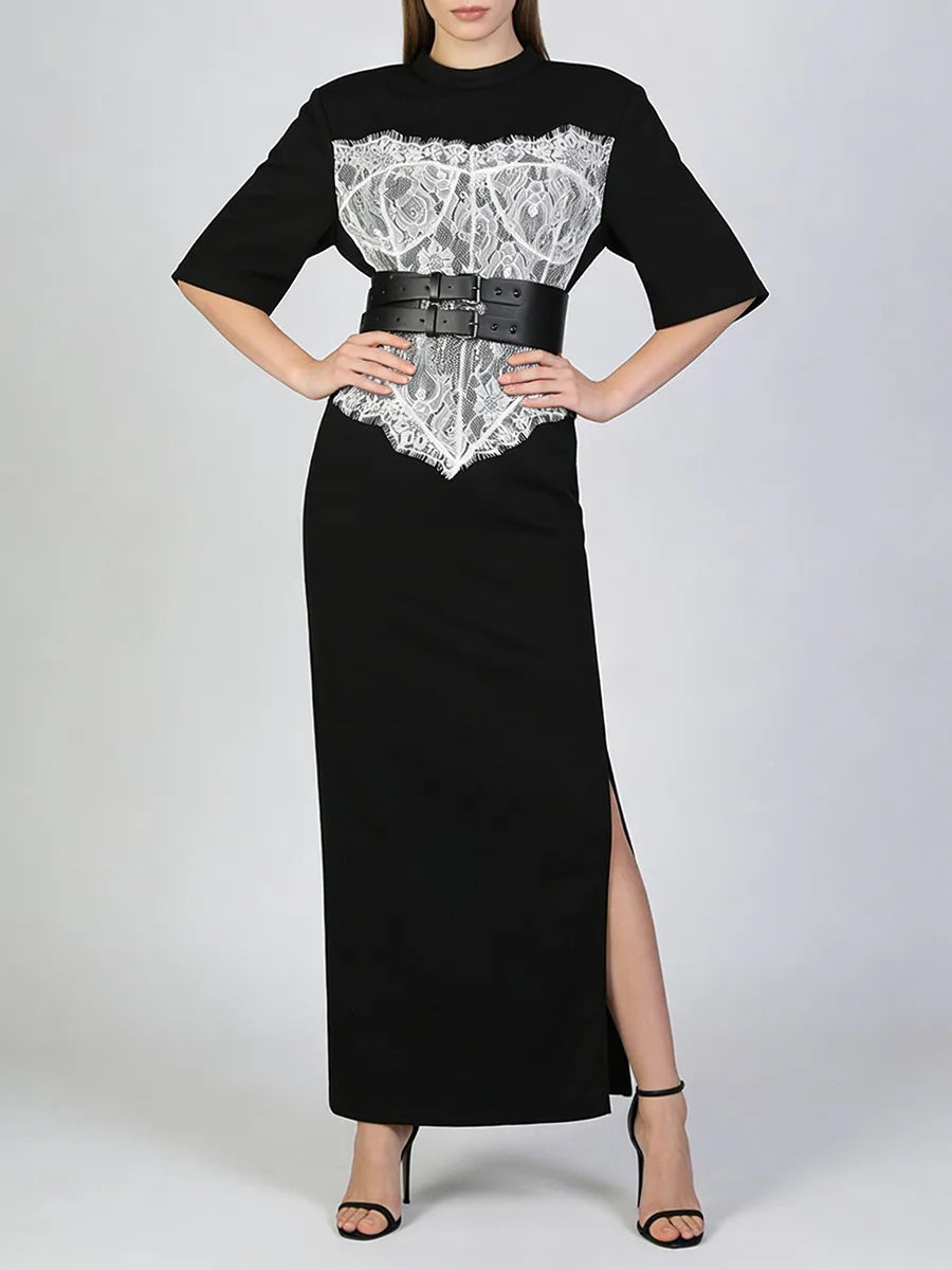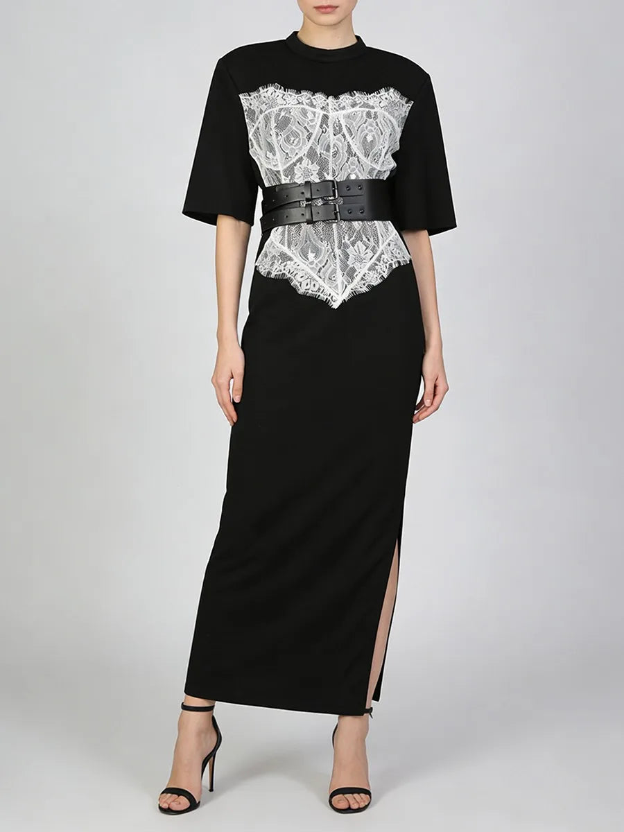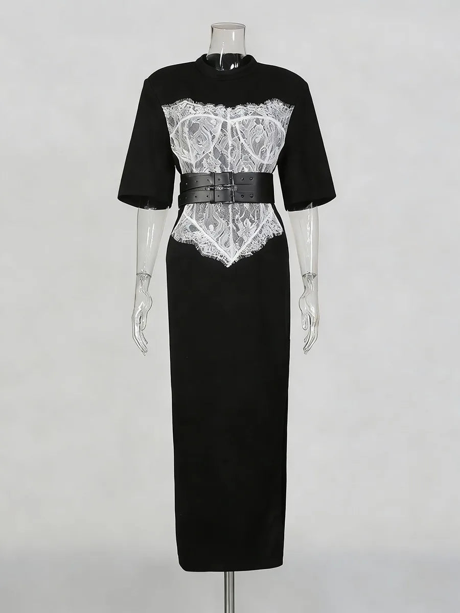 Crafted from a smooth, structured fabric, the dress offers a flattering straight-cut fit with subtle stretch for comfort. The contrast lace detailing adds feminine texture, while the wide belted waist cinches the figure for a sculpted look without sacrificing wearability. Finished with relaxed short sleeves and a clean neckline, this piece delivers understated luxury that can be styled up or down with ease.