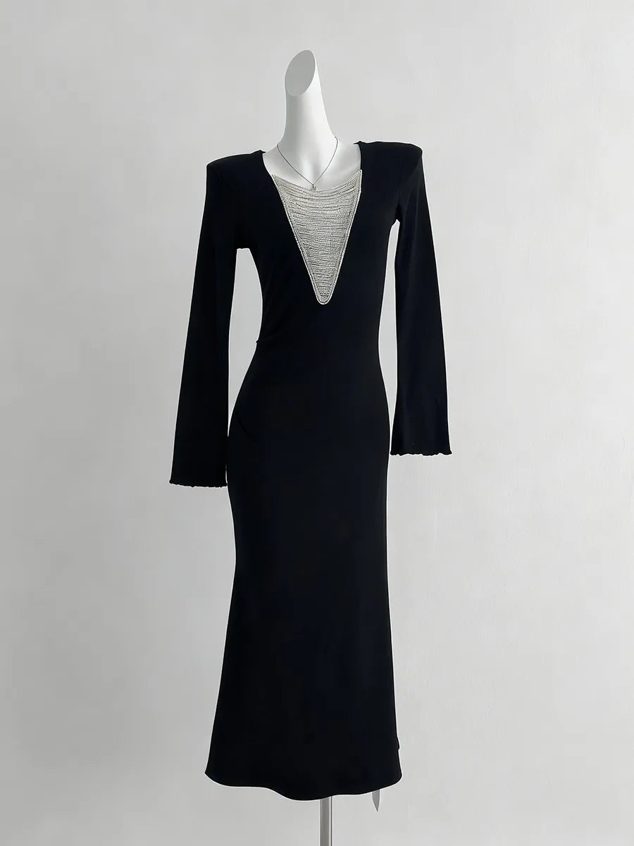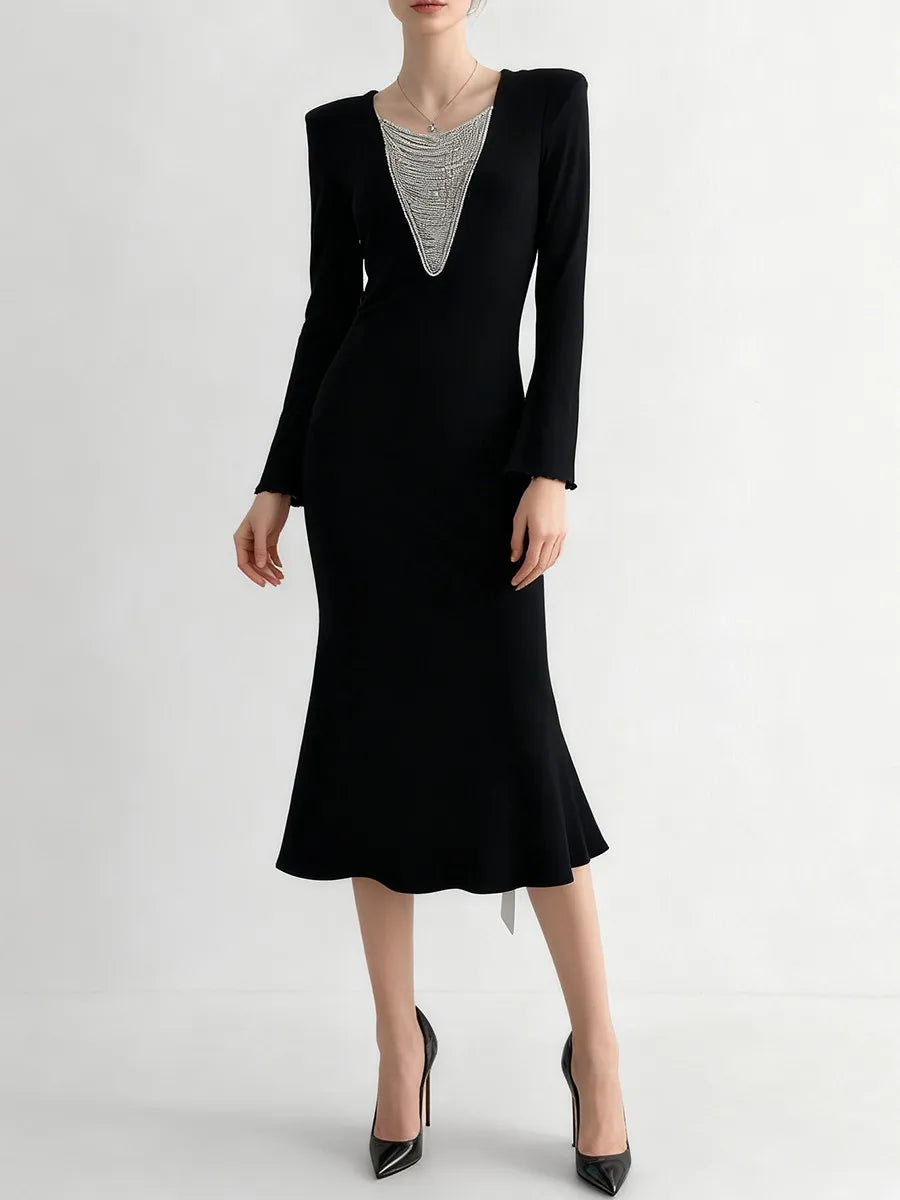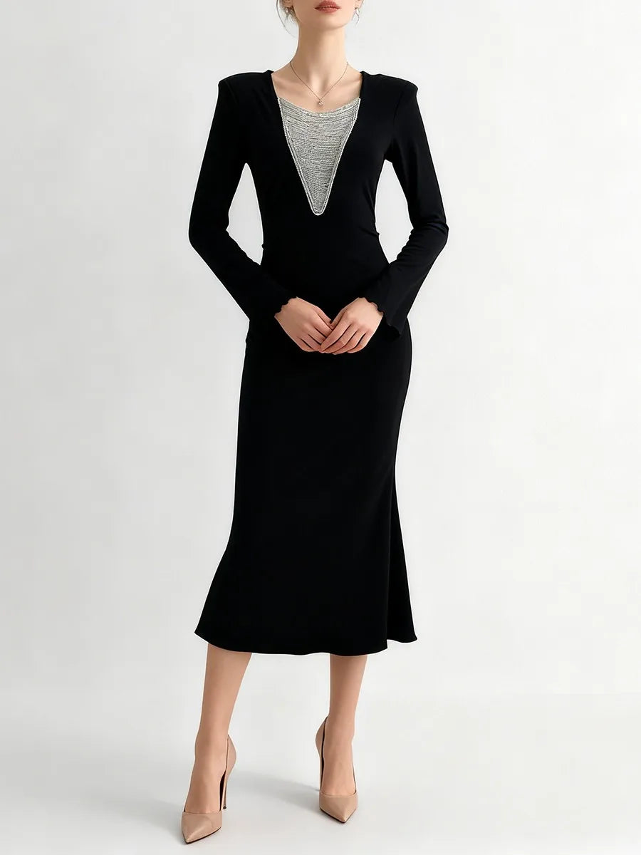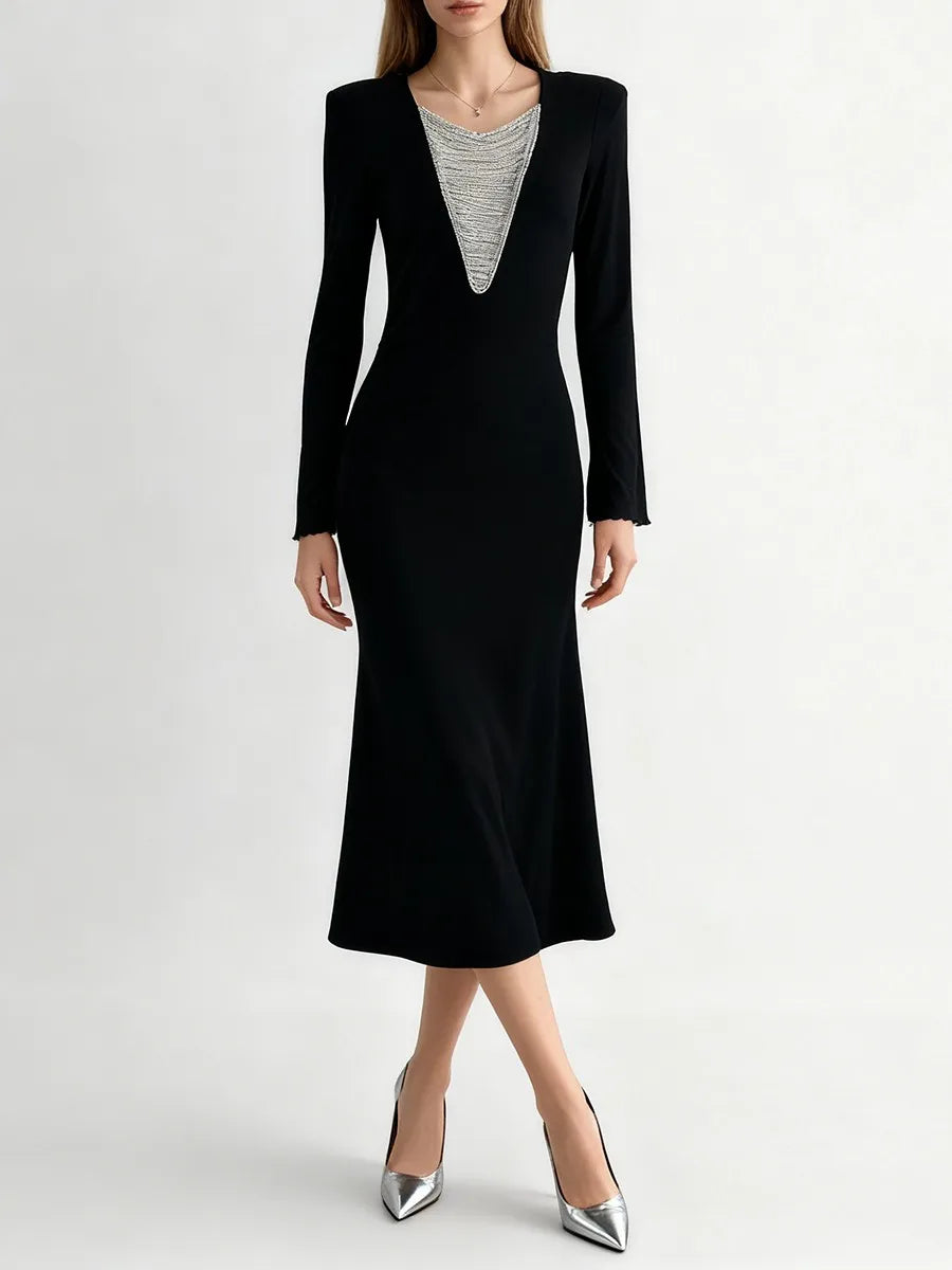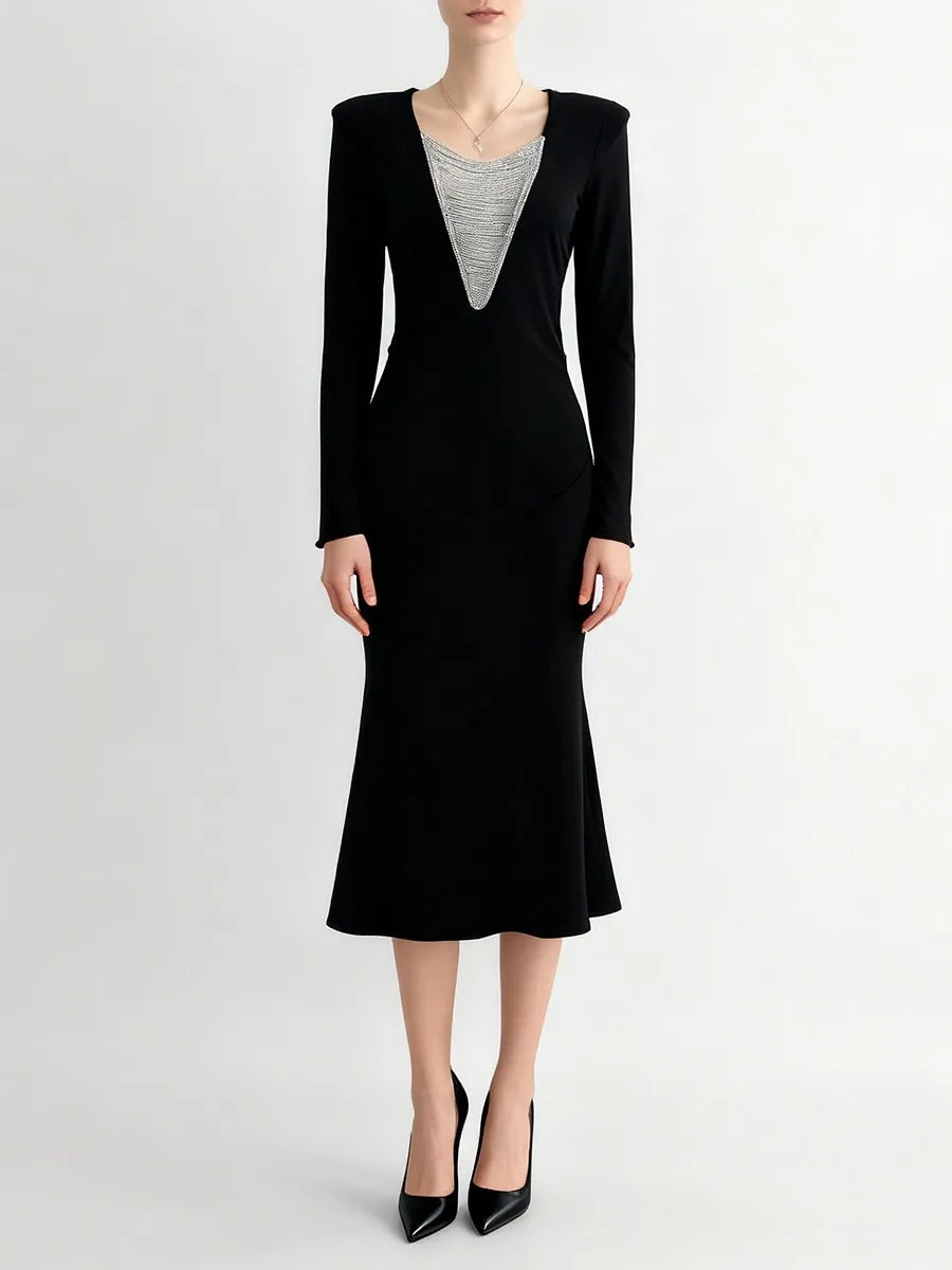 Dare to shine with sophisticated drama in the Trend4us Luxe Crystal-Draped Deep V Midi Gown. Designed to captivate, this sleek silhouette features a sculpting body-hugging fit that flows into an elegant flared hem. The centerpiece of the design — a cascading crystal drape illusion neckline — adds high-fashion glamour and elevates every movement with shimmering allure.