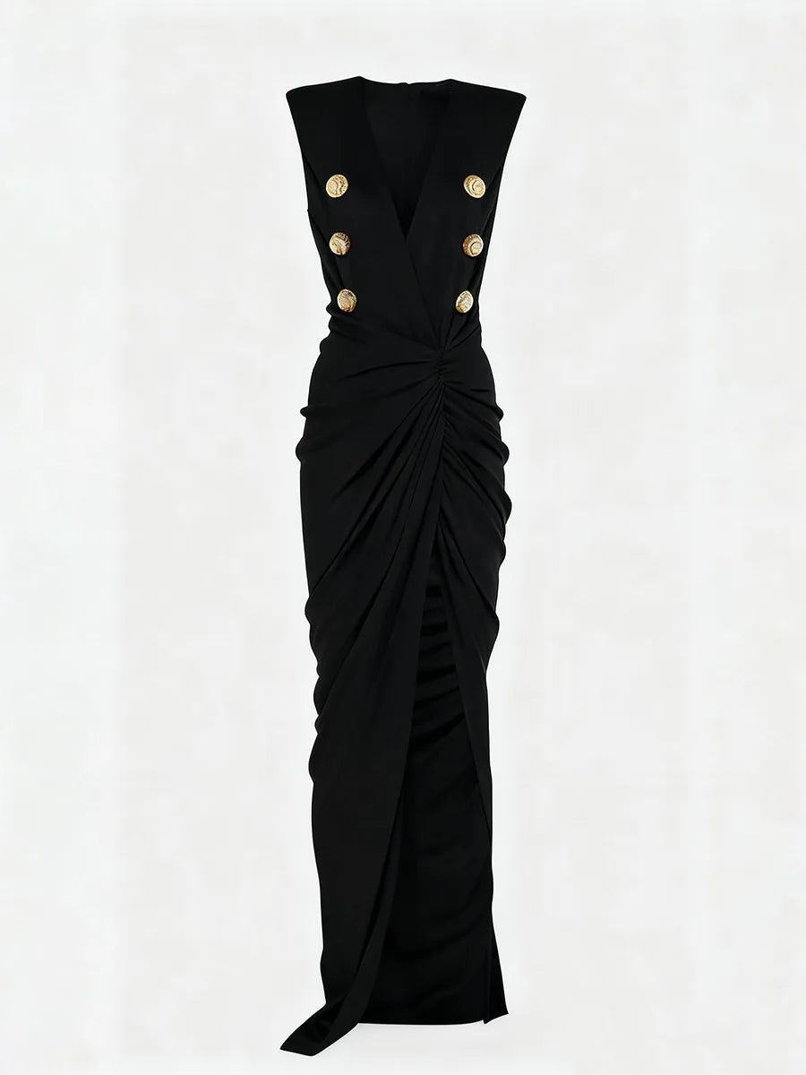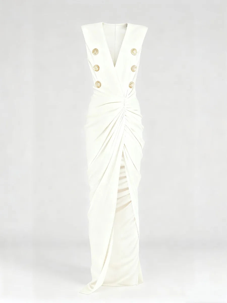 Make an unforgettable entrance in the Trend4us Luxe Gold-Button Draped Slit Evening Gown — where power meets glamour in the most sculpted and seductive way. This statement gown features strong, structured shoulders and a plunging V-neckline that shapes the décolletage with bold confidence. Luxe embossed gold buttons elevate the double-breasted illusion for a couture-inspired finish.