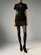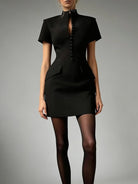 Make a bold, refined statement with the Trend4us Luxe High-Neck Button-Front Tailored Blazer Dress. Designed with a sharply tailored silhouette, this elevated mini dress blends modern power dressing with feminine elegance. The structured high neckline and fabric-covered button front create a sleek, polished look, while the sculpted waist enhances your natural shape for a confident, flattering fit.