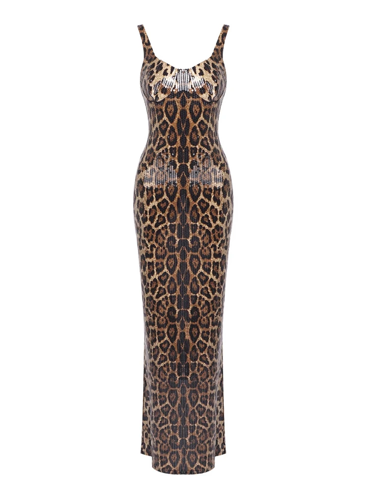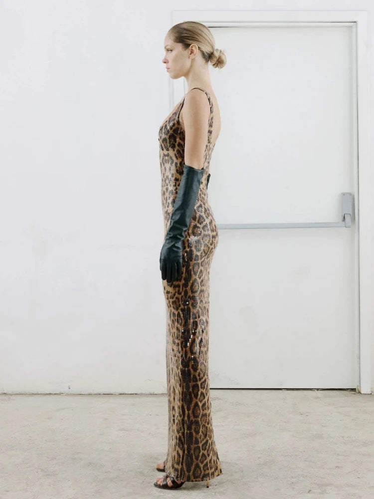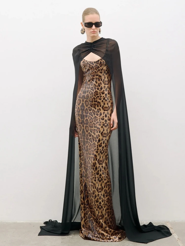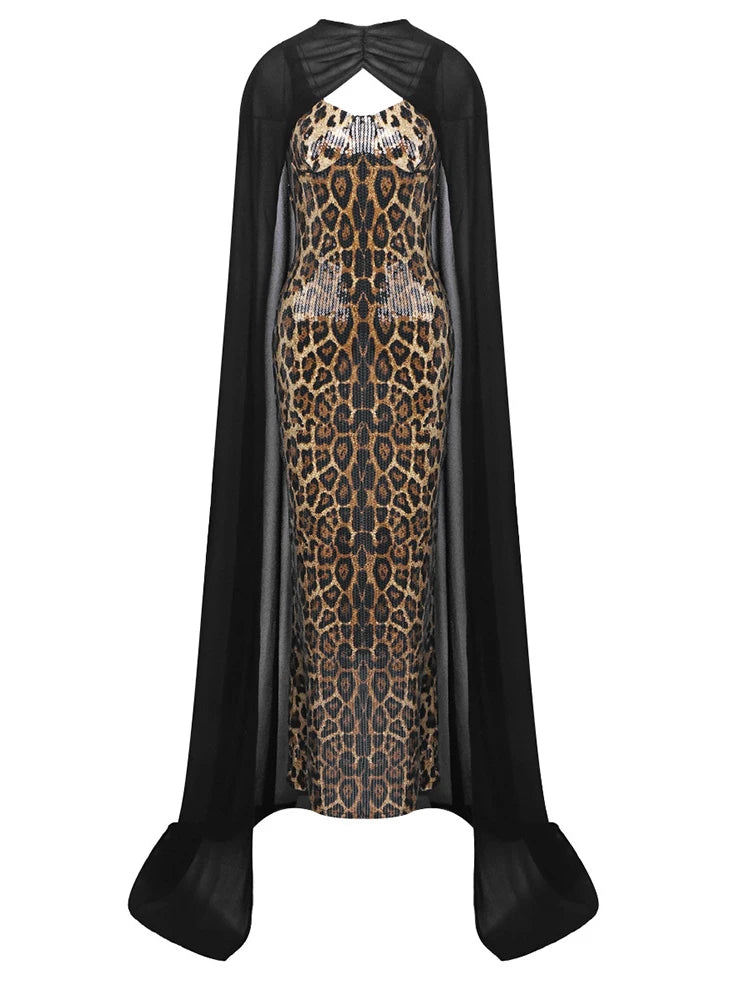 Trend4us Luxe Leopard Sequin Gown with Sheer Cape
