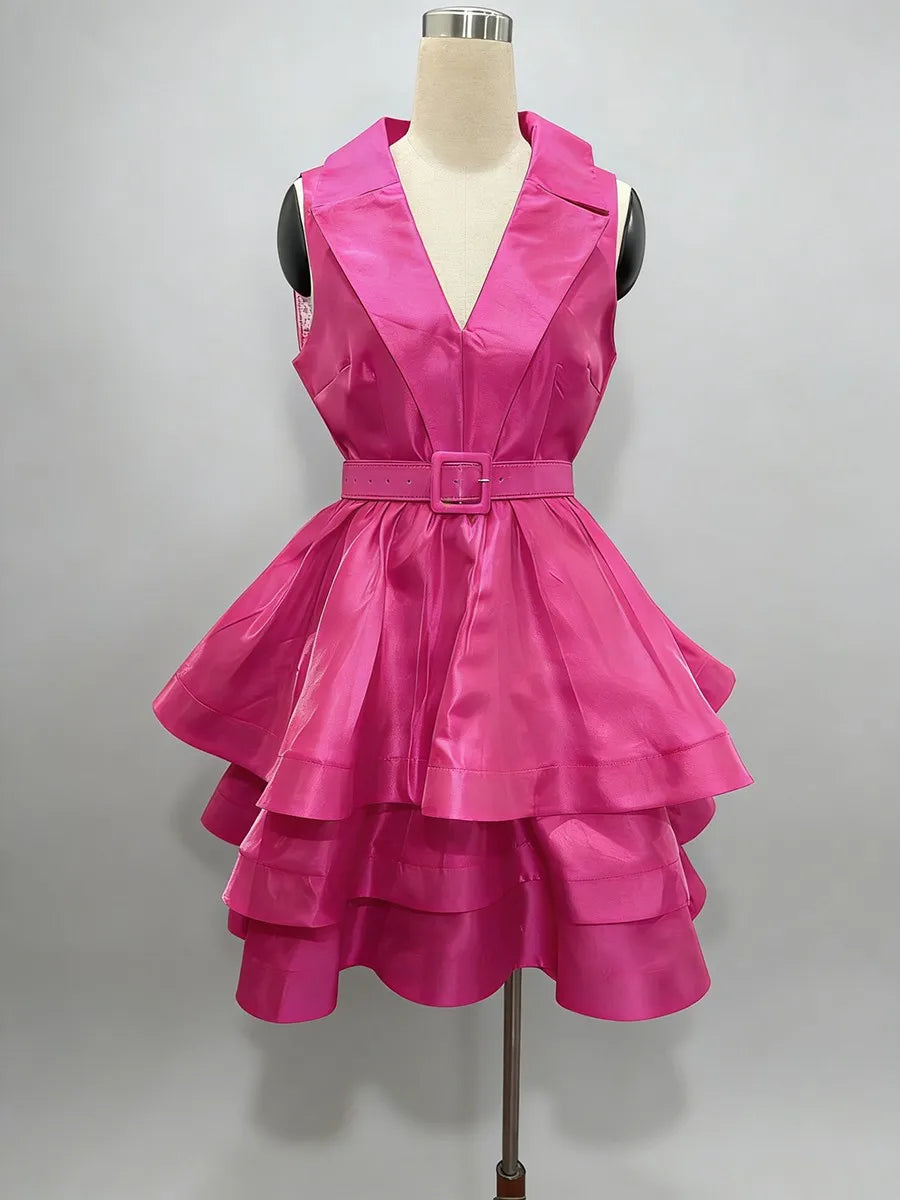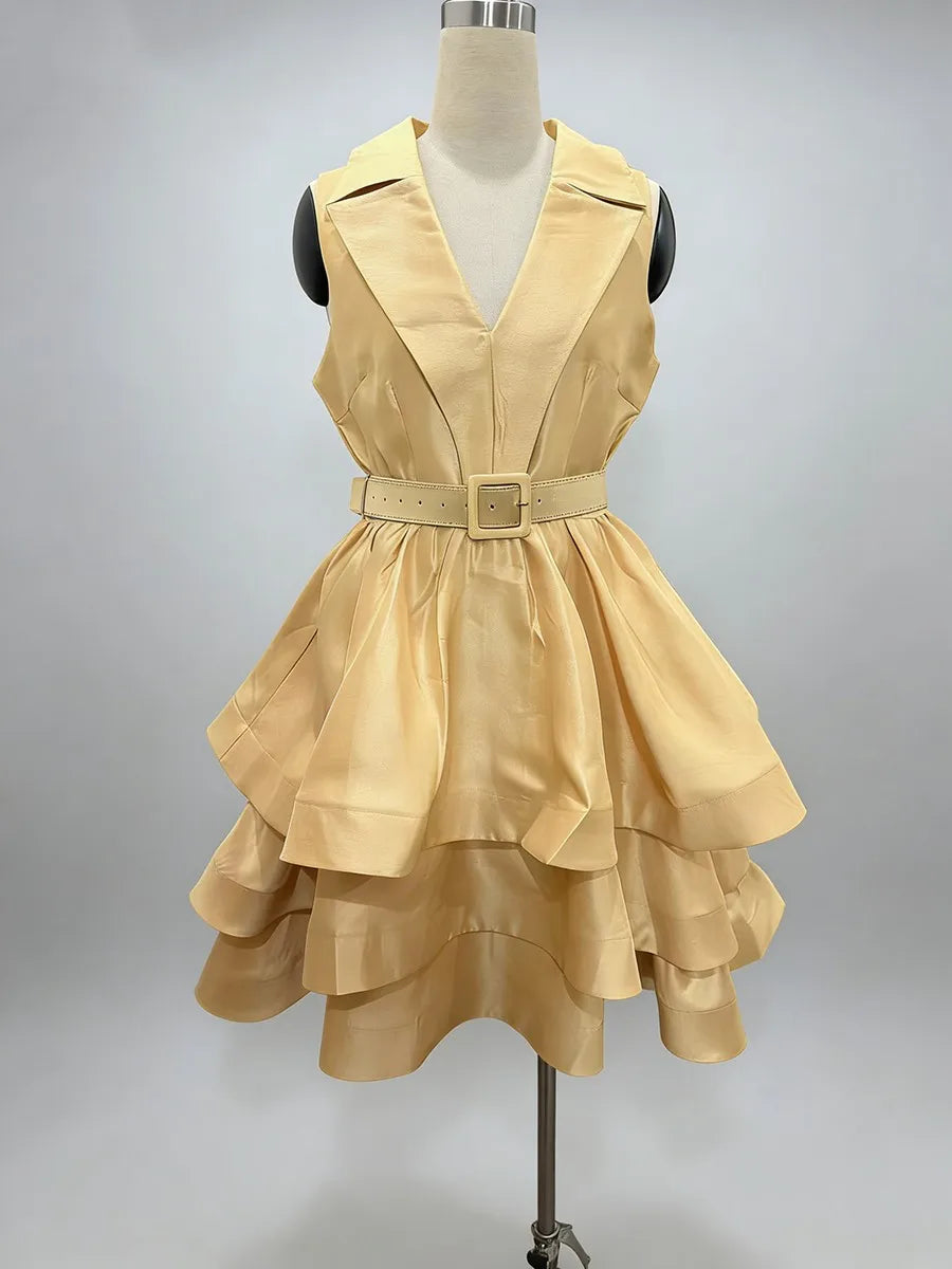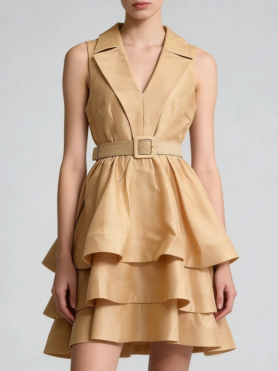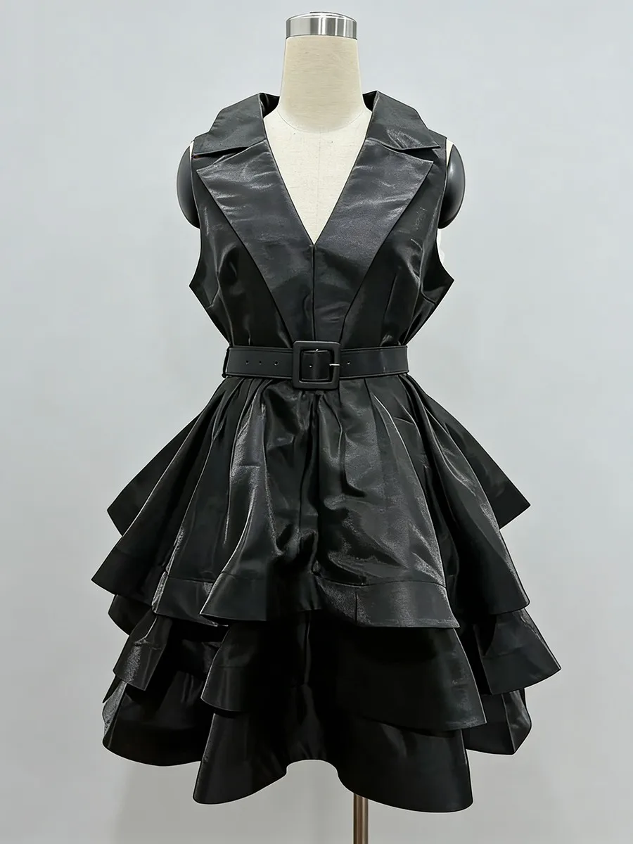 Refined structure meets soft movement in the Trend4us Modern Belted Tiered Ruffle Mini Dress—a contemporary statement designed for confident, style-driven women. Featuring a sleek blazer-inspired neckline and a sculpted sleeveless silhouette, this mini dress is elevated by a matching belted waist that defines the figure with polished precision.